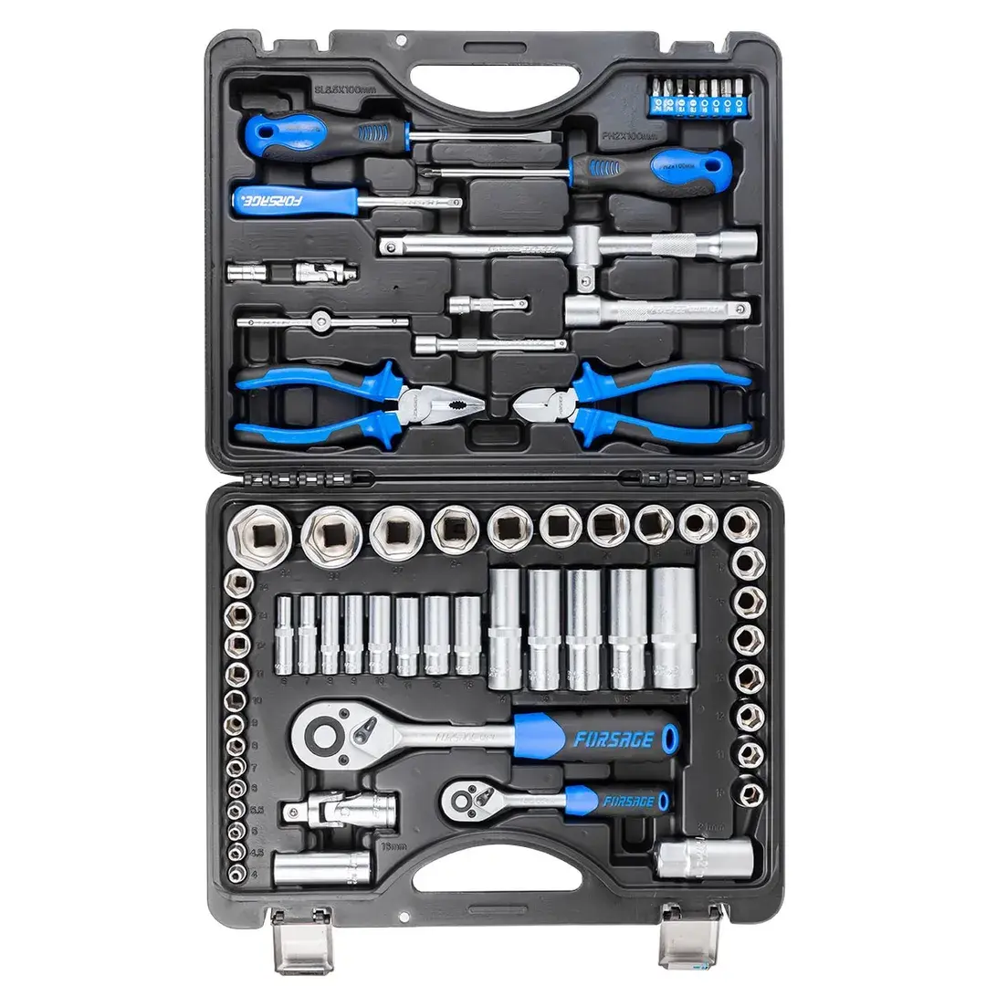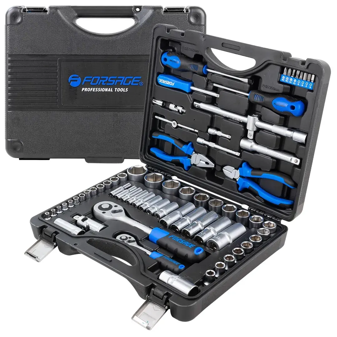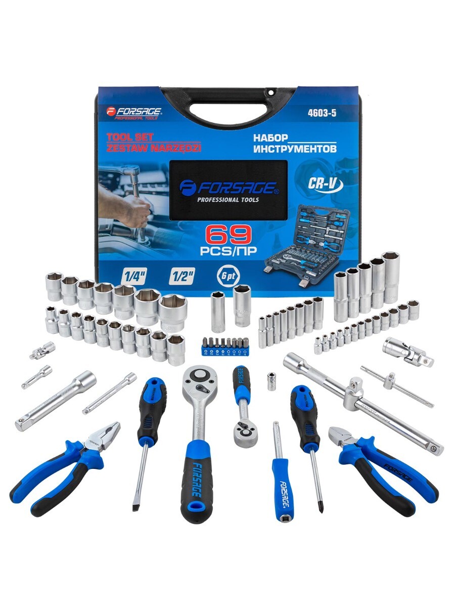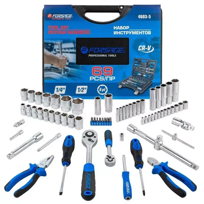 Набор автоинструментов на 1/4"" и 1/2"" из 69 предметов в кейсе представляет собой полный комплект инструментов, необходимых для выполнения различных автомобильных работ. Все инструменты изготовлены из высококачественной хромованадиевой стали (CrV), обладают прочностью и долговечностью, что гарантирует их долгий срок службы. Комплект является незаменимым помощником для автомехаников и автолюбителей, позволяя выполнять различные работы с легкостью и эффективностью. Комплектация: головки короткие 6-гранные 1/4"(4, 4.5, 5, 5.5, 6, 7, 8, 9, 10, 11, 12, 13, 14 мм.), головки глубокие 6-гранные 1/4"(6, 7, 8, 9, 10, 11, 12, 13 мм.), удлинители 1/4"50 и 100 мм., трещотки 1/4"и 1/2", вороток Т-образный 1/4"115 мм., рукоятка-битодержатель, карданы шарнирные 1/4"и 1/2", битодержатель, биты 8 шт., головки короткие 6-гранные 1/2"(10, 11, 12, 13, 14, 15, 16, 17, 18, 19, 20, 21, 22, 24, 27, 30, 32 мм.), головки глубокие 6-гранные 1/2"(14, 15, 17, 19, 22 мм.), удлинители 1/2"125 и 250 мм., адаптер-переходник, головки свечные 16 и 21 мм., отвертки 2 шт., плоскогубцы 150 мм., кусачки 150 мм., кейс.