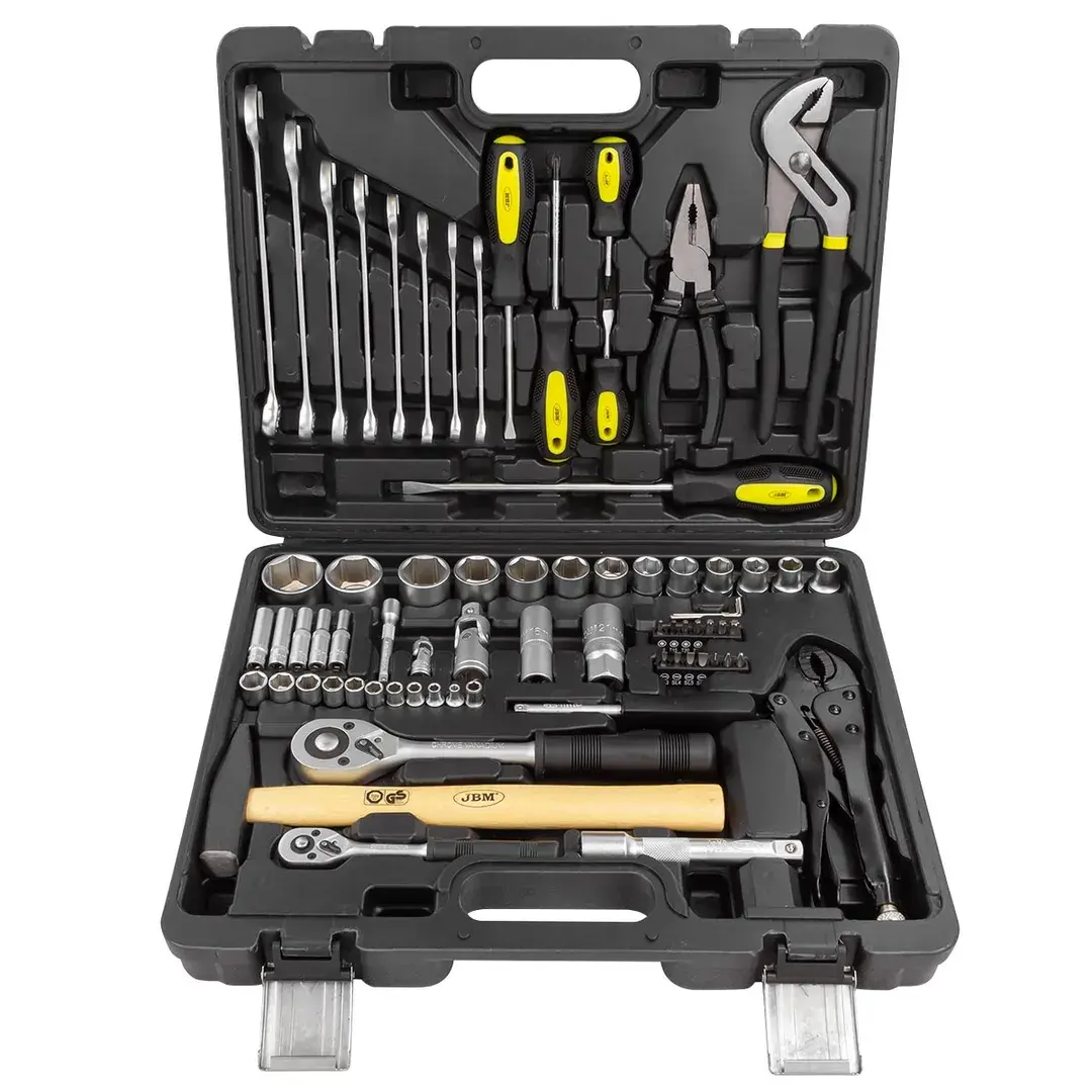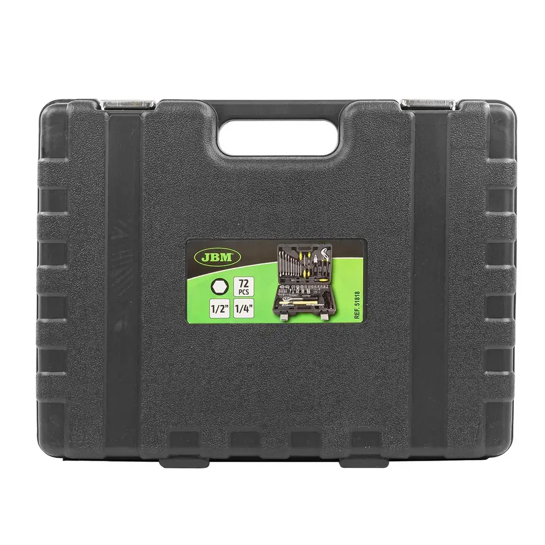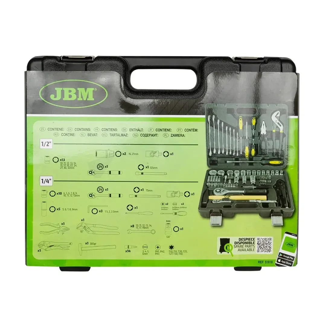Посадочный квадрат: 1/2", 1/4". Тип головок: 6-гранные, короткие, глубокие. Комплектация: головки 1/4" короткие 25 мм: 4, 5, 6, 7, 8, 9, 10, 11, 12, 13 мм; головки 1/4" глубокие 50 мм: 5, 6, 7, 8, 9 мм; трещотка 1/4" 150мм 24зубца; рукоятка 1/4" 150 мм; удлинитель 1/4" 75 мм; кардан шарнирный 1/4"; битодержатель 1/4"(F)*1/4"НЕХ (F); биты 1/4" TORX 25 мм: Т10, Т15, Т20, Т25, Т27, Т30, Т40; биты 1/4" SL 25 мм: SL3, SL4, SL5, SL6; биты 1/4" PH 25 мм: PH1, PH2, PH3; головки 1/2" короткие 38 мм: 10, 11, 12, 13, 14, 15, 17, 19, 20, 22, 24, 27, 30, 32 мм ; головки свечные 1/2": 16, 21 мм; трещотка 1/2" 250мм 24зубца; удлинитель 1/2": 125 мм; кардан шарнирный 1/2"; ключи комбинированные: 10, 11, 12 ,13, 14, 15, 17, 19 мм; отвертки шлицевые: SL6х38, SL6х100, SL8х200; отвертки крестовые: PH2х38, PH2х100; плоскогубцы комбинированные 180 мм; пассатижи переставные 255мм; зажим гейферный 225с; молоток с деревянной ручкой 300г; ключи Г-образные 6-гранные к