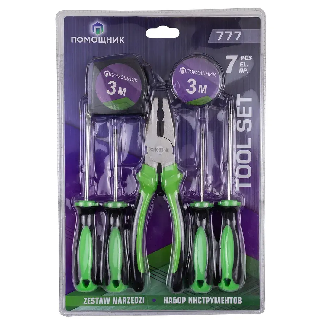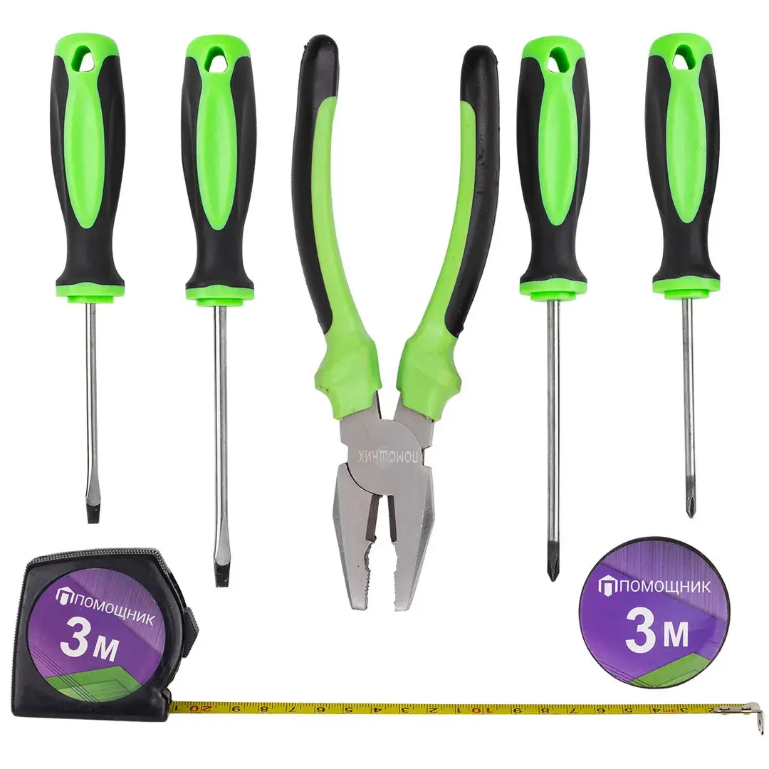 Набор инструментов 7 предметов, в блистере - это ручной слесарный и столярный монтажный инструмент, разработанный для выполнения различных строительных и монтажных работ в доме, на даче и гараже. Комплектация: 4шт. Отвертки: SL4.5x75, SL4.5x100, PH0x75, PH1x100; 1шт. Изолента; 1шт. Рулетка 3м; 1шт. Плоскогубцы 200мм.