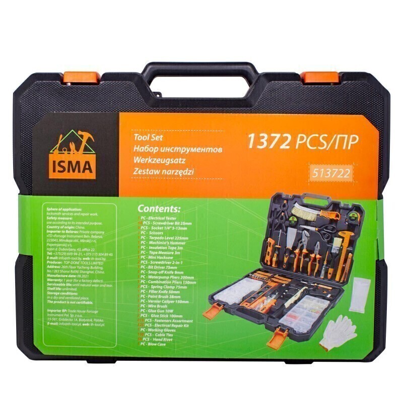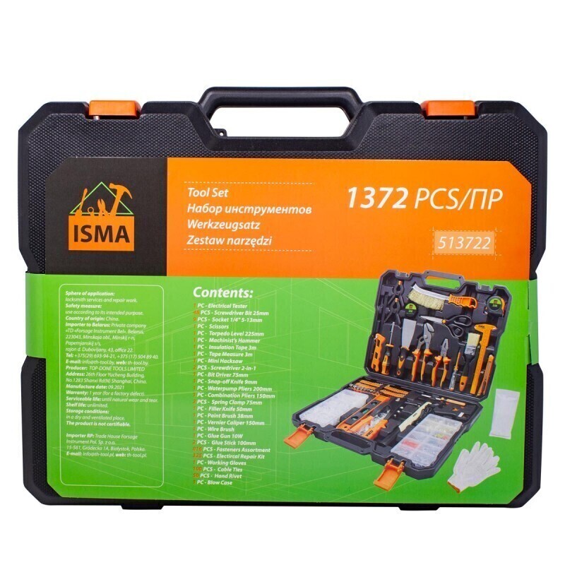 Универсальный набор инструментов ISMA - это отличный выбор для тех, кому нужен полный набор инструментов для различных задач по ремонту и строительству дома, гаража или дачи. Набор имеет все необходимые инструменты, которые могут понадобиться для решения любых задач по ремонту или строительству. Благодаря своей универсальности, этот набор является отличным выбором для тех, кто хочет иметь под рукой весь необходимый инструмент для выполнения различных задач. Комплектация: Рулетка 3м; Зажимы пластиковые 2шт; Изолента ПВХ 3м; Пассатижи переставные 200мм (максимальный диаметр захвата 30мм); Пассатижи комбинированные 160мм (максимальный диаметр захвата 24мм); Нож канцелярский, ширина лезвия 9мм; Ножницы 185мм; Штангенциркуль пластиковый 0-150мм; Уровень 230мм; Индикаторная отвертка; Мини-ножовка 260мм; Шпатель металлический 200мм (ширина шпателя 50мм); Клеевой пистолет 10Вт; Клеевой стержень 100мм 2шт; Перчатки; Щетка по металлу 240мм; Кисть 160мм (длига щетины 38мм); Головки короткие 1/4": 5, 6, 7, 8, 9, 10, 11, 12, 13мм; Переставня отвертка 2в1 160мм SL6-PH1; Отвертка-битодержатель 1/4"180мм; Биты 1/4"25мм: PH0, PH1, PH2, PH3, PZ1, PZ2, PZ3, SL4, SL5.5, SL6.5, H2, H2.5, H3, H4, H5, H5.5, H6, H7, H8, H10, T8, T10, T15, T20, T25, T30, T40, TH8, TH10, TH15, TH20, TH25, TH27, TH30, TH40, TH45, TH50, U4, U6, Y1, Y2, Y3, Y4, C1, S0, S1, S2, AD; Молоток 300г 275мм; Заклёпочник ручной 240мм; Заклёпки 50шт; Кабельные стяжки 100шт; Набор крепежей 816пр; Набор крепежа для электрика 325пр; Пластиковый кейс.