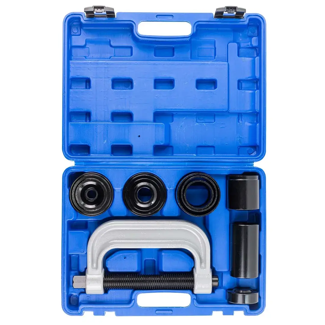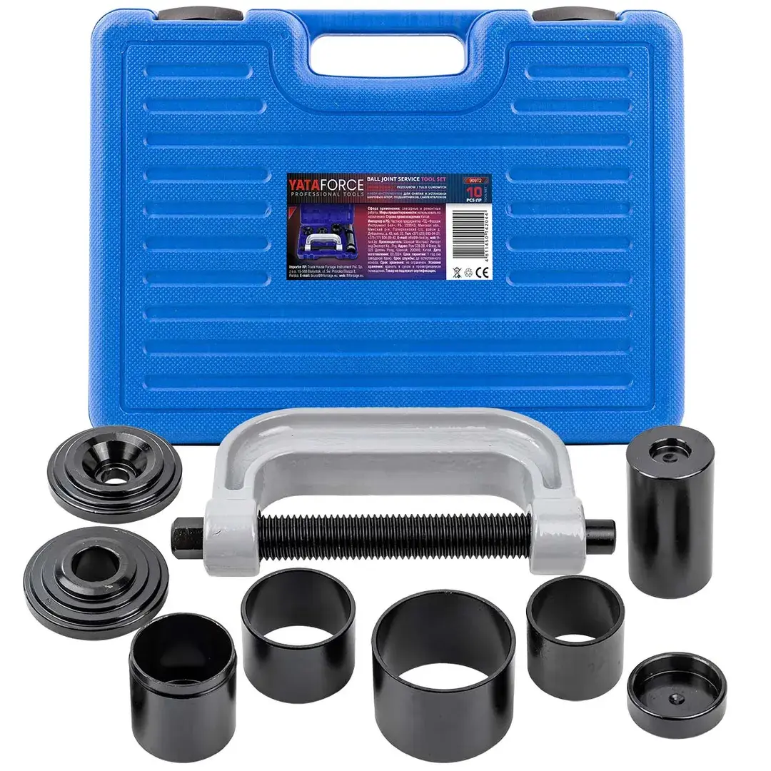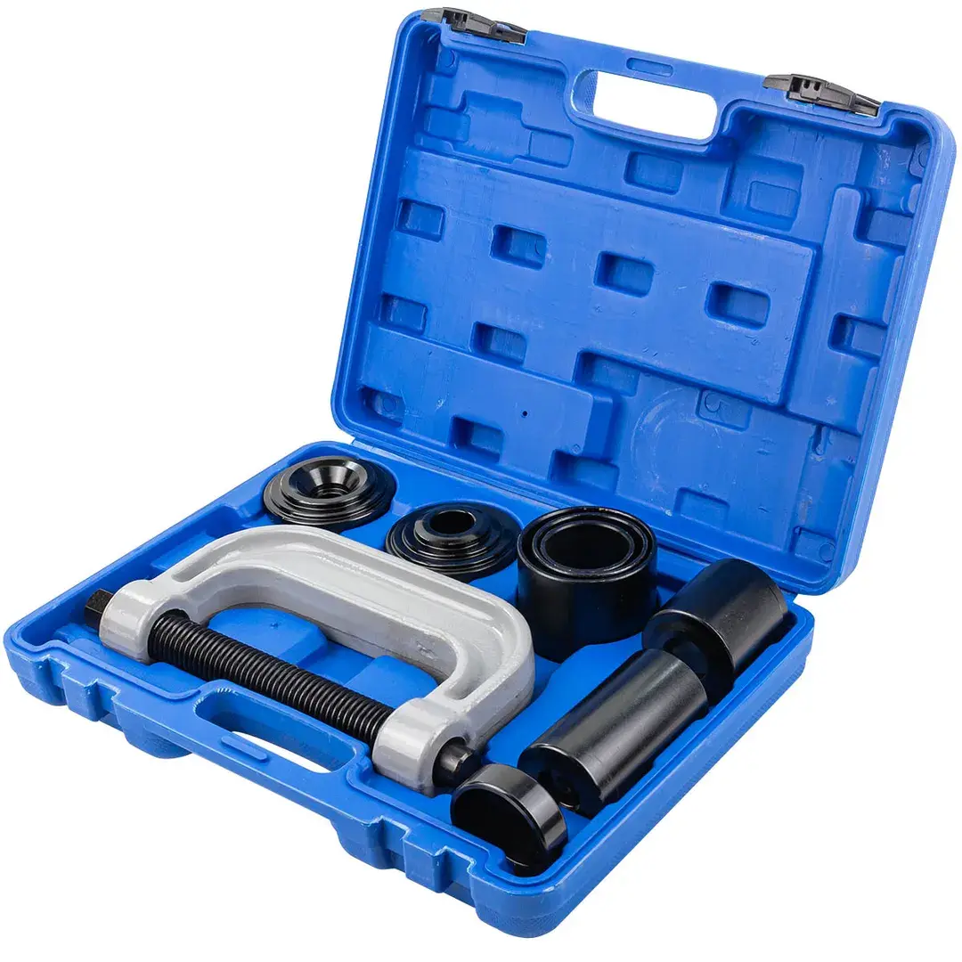 Набор инструментов для снятия и установки шаровых опор, подшипников, сайлентблоков станет незаменимым помощником при проведении ремонта автомобилей и обеспечит высокую эффективность и точность работ. Инструменты изготовлены из чугуна и закаленной углеродистой стали, что обеспечивает их долговечность и стабильную работу в течение длительного времени. Размер зева 150 мм, диаметр оправок сквозных: 44/51 мм, 57/64 мм, 70/76 мм, диаметр оправок удлиненных: 51/57 мм, 45/50 мм. Все инструменты хранятся в надежном пластиковом кейсе, это предотвращает утерю комплектующих и обеспечивает их удобное хранение и транспортировку.