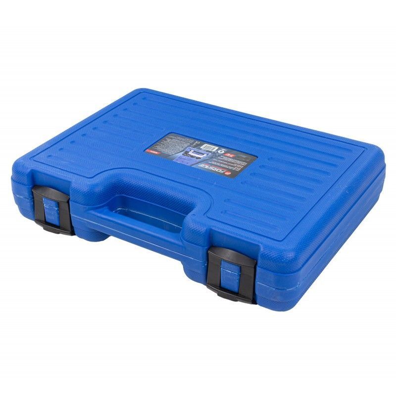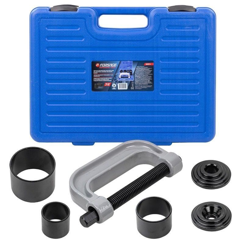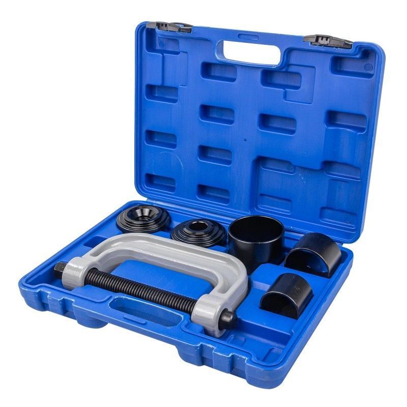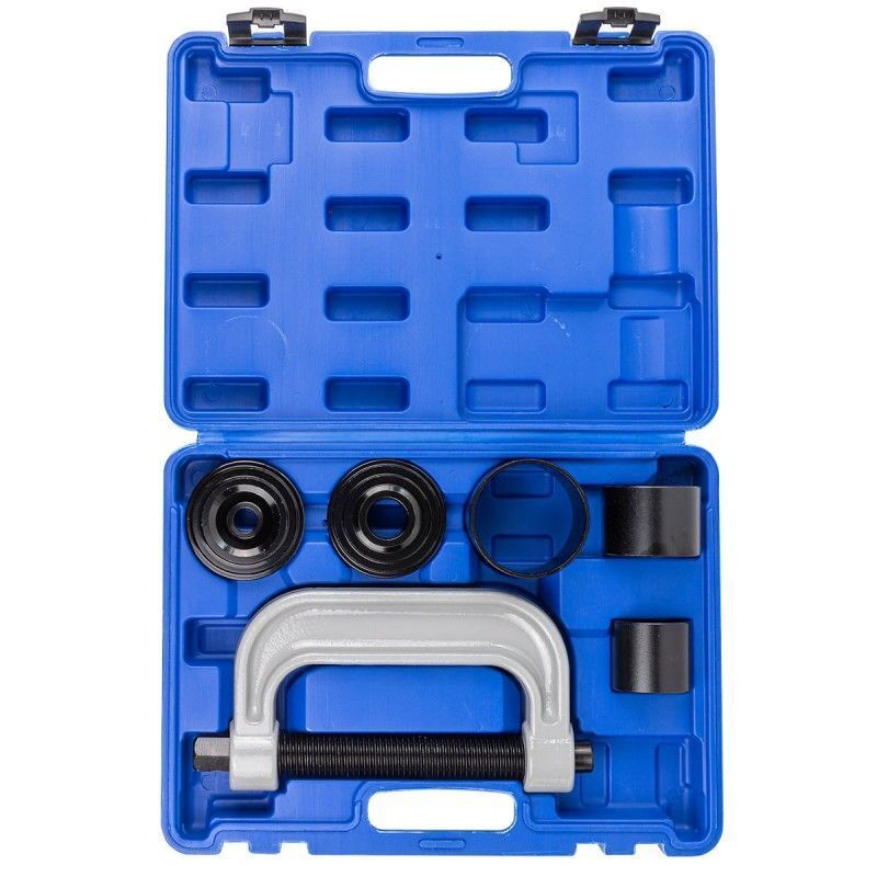 Набор инструментов для снятия и установки шаровых опор, подшипников и сайлентблоков, 7 предметов в кейсе. Предназначен для снятия шаровых опор, рулевых шарниров крестовин карданного вала и других подобных работ. В комплекте: С-образный пресс, адаптеры для сборки и разборки и 3 насадки -70х76мм, 57х63,5мм, 44,5х51мм. Рабочий диапазон: 160 х 70 мм .