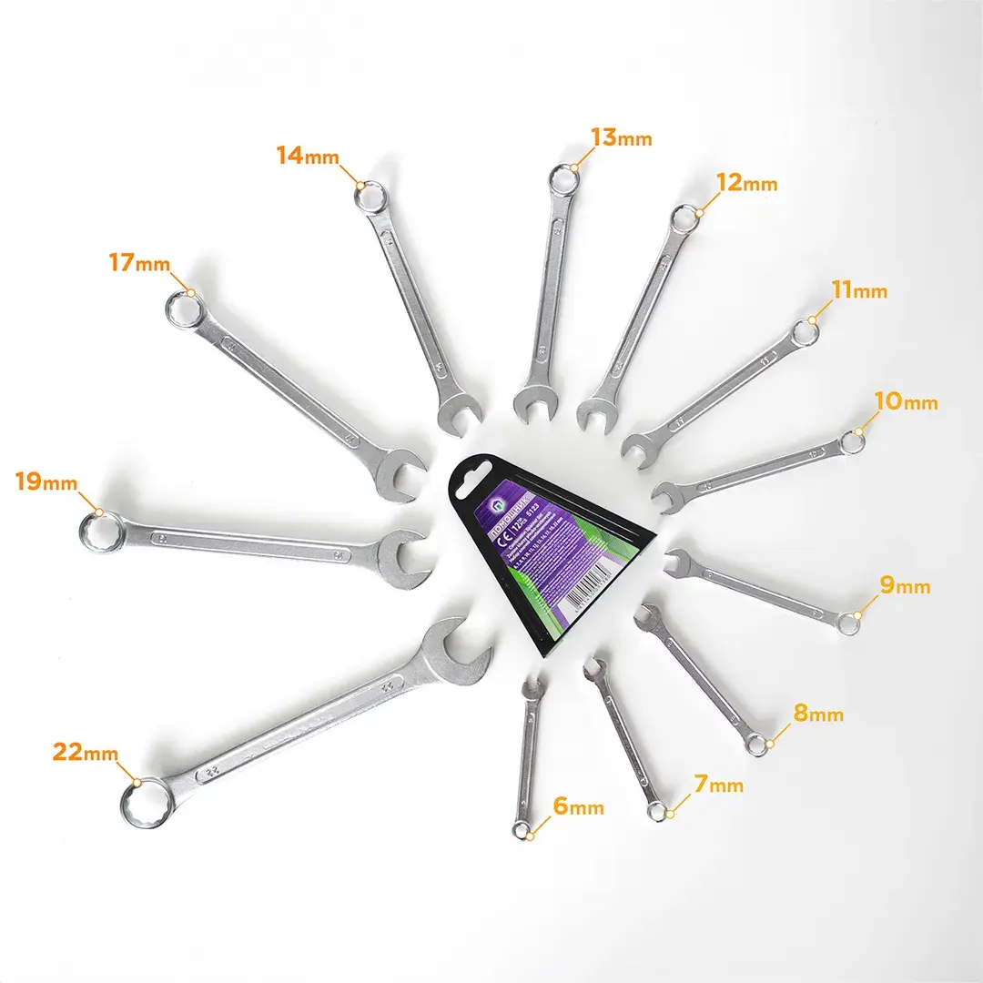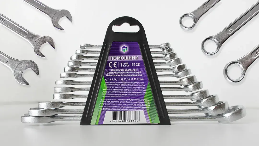 Ключи комбинированные – универсальные гаечные ключи, совмещающие в себе функционал и преимущества рожковых и накидных ключей. Зевы комбинированных ключей имеют одинаковые размеры. Ключи гаечные с открытым и кольцевым зевами предназначены для монтажа либо демонтажа резьбовых соединений. Набор изготовлен из высококачественной стали Cr-V. Ключи поставляются в трапециевидном пластиковом держателе. Комплектация: 6, 7, 8, 9, 10, 11, 12, 13, 14, 17, 19, 22мм.