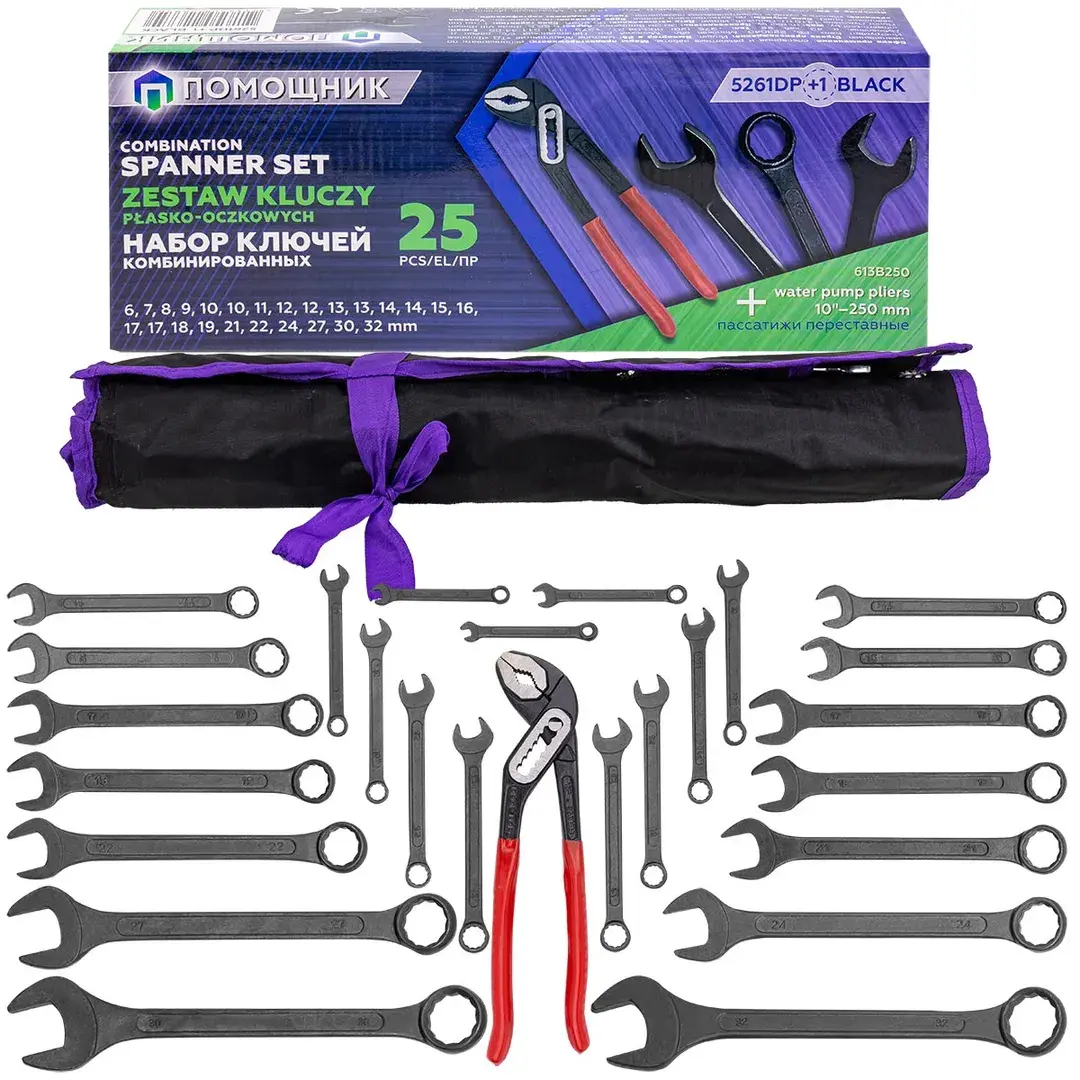 Набор комбинированных ключей представляет собой профессиональный комплект из 25 предметов, включающий ключи размерами 6, 7, 8, 9, 10, 10, 11, 12, 12, 13, 13, 14, 14, 15, 16, 17, 17, 18, 19, 21, 22, 24, 27, 30, 32 мм для выполнения слесарных и ремонтных работ. Ключи гаечные комбинированные - универсальные инструменты, совмещающие функционал рожковых и накидных ключей с одинаковыми размерами зевов, предназначены для монтажа и демонтажа резьбовых соединений. Весь набор организованно размещен в практичном тканевом органайзере с специальными отверстиями в верхних углах полотна для удобной настенной фиксации и транспортировки. В комплект дополнительно входят пассатижи переставные черного цвета длиной 250 мм, оснащенные универсальными губками для надежного захвата предметов различной формы. Эргономичные двукомпонентные рукоятки с матовым покрытием обеспечивают комфортный захват и предотвращают скольжение, а специальная защита от защемления пальцев повышает безопасность при работе. Вся продукция предназначена для исп