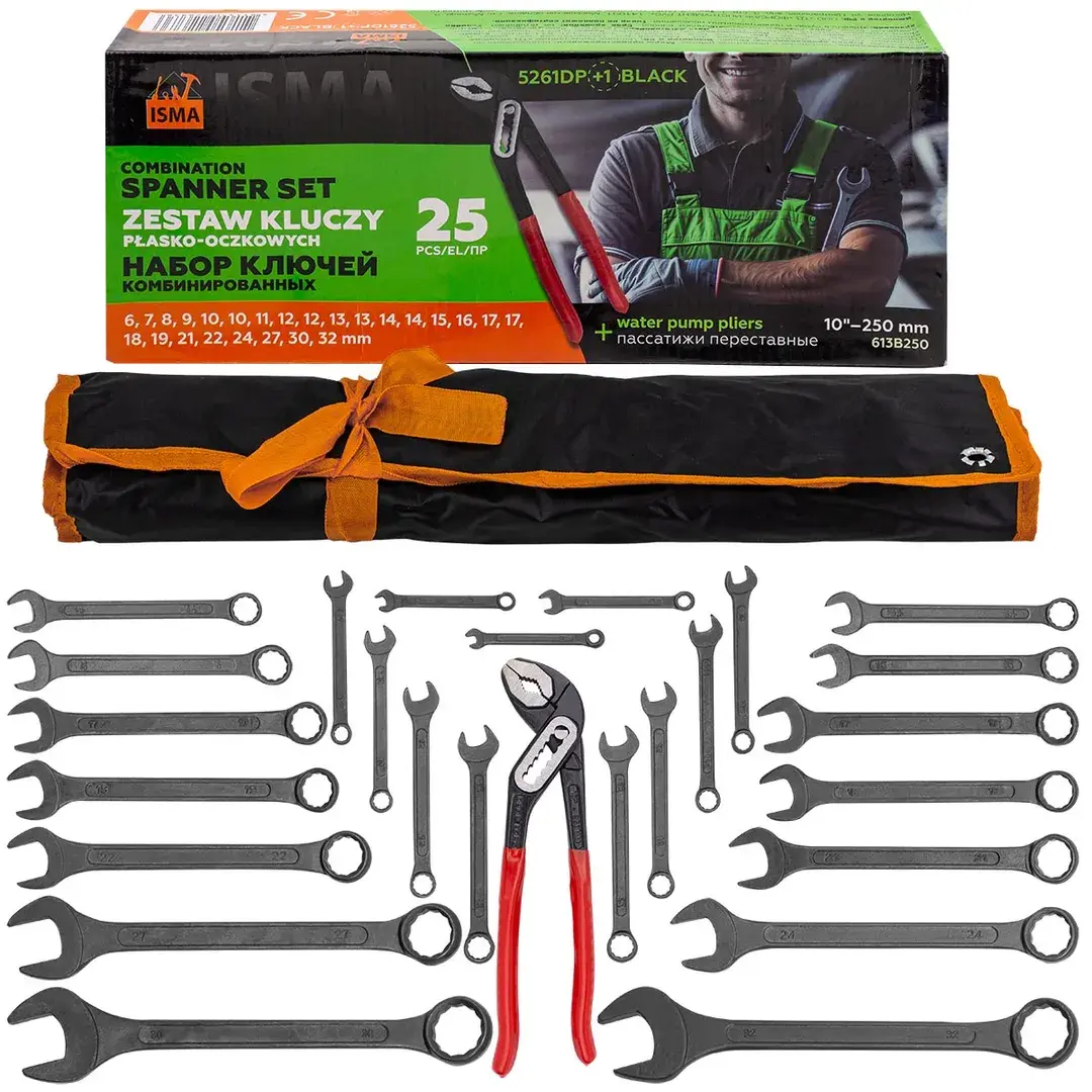 Набор комбинированных ключей представляет собой профессиональный комплект из 25 предметов, включающий ключи размерами 6, 7, 8, 9, 10, 10, 11, 12, 12, 13, 13, 14, 14, 15, 16, 17, 17, 18, 19, 21, 22, 24, 27, 30, 32 мм для выполнения слесарных и ремонтных работ. Ключи гаечные комбинированные - универсальные инструменты, совмещающие функционал рожковых и накидных ключей с одинаковыми размерами зевов, предназначены для монтажа и демонтажа резьбовых соединений. Весь набор организованно размещен в практичном тканевом органайзере с специальными отверстиями в верхних углах полотна для удобной настенной фиксации и транспортировки. В комплект дополнительно входят пассатижи переставные черного цвета длиной 250 мм, оснащенные универсальными губками для надежного захвата предметов различной формы. Эргономичные двукомпонентные рукоятки с матовым покрытием обеспечивают комфортный захват и предотвращают скольжение, а специальная защита от защемления пальцев повышает безопасность при работе. Вся продукция предназначена для исп