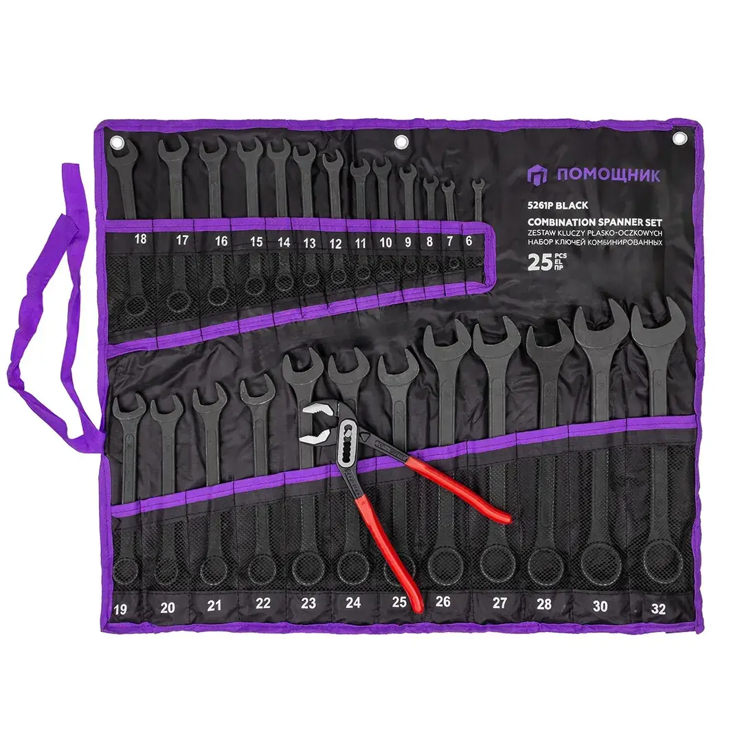 Набор комбинированных ключей представляет собой профессиональный комплект из 25 предметов, включающий ключи размерами 6, 7, 8, 9, 10, 11, 12, 13, 14, 15, 16, 17, 18, 19, 20, 21, 22, 23, 24, 25, 26, 27, 28, 30, 32 мм для выполнения слесарных и ремонтных работ. Ключи гаечные комбинированные - универсальные инструменты, совмещающие функционал рожковых и накидных ключей с одинаковыми размерами зевов, предназначены для монтажа и демонтажа резьбовых соединений. Весь набор организованно размещен в практичном тканевом органайзере с специальными отверстиями в верхних углах полотна для удобной настенной фиксации и транспортировки. В комплект дополнительно входят пассатижи переставные черного цвета длиной 250 мм, оснащенные универсальными губками для надежного захвата предметов различной формы. Эргономичные двукомпонентные рукоятки с матовым покрытием обеспечивают комфортный захват и предотвращают скольжение, а специальная защита от защемления пальцев повышает безопасность при работе. Вся продукция предназначена для исп