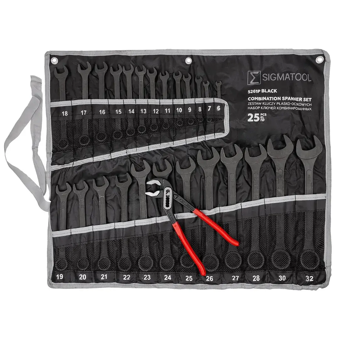 Набор комбинированных ключей представляет собой профессиональный комплект из 25 предметов, включающий ключи размерами 6, 7, 8, 9, 10, 11, 12, 13, 14, 15, 16, 17, 18, 19, 20, 21, 22, 23, 24, 25, 26, 27, 28, 30, 32 мм для выполнения слесарных и ремонтных работ. Ключи гаечные комбинированные - универсальные инструменты, совмещающие функционал рожковых и накидных ключей с одинаковыми размерами зевов, предназначены для монтажа и демонтажа резьбовых соединений. Весь набор организованно размещен в практичном тканевом органайзере с специальными отверстиями в верхних углах полотна для удобной настенной фиксации и транспортировки. В комплект дополнительно входят пассатижи переставные черного цвета длиной 250 мм, оснащенные универсальными губками для надежного захвата предметов различной формы. Эргономичные двукомпонентные рукоятки с матовым покрытием обеспечивают комфортный захват и предотвращают скольжение, а специальная защита от защемления пальцев повышает безопасность при работе. Вся продукция предназначена для исп