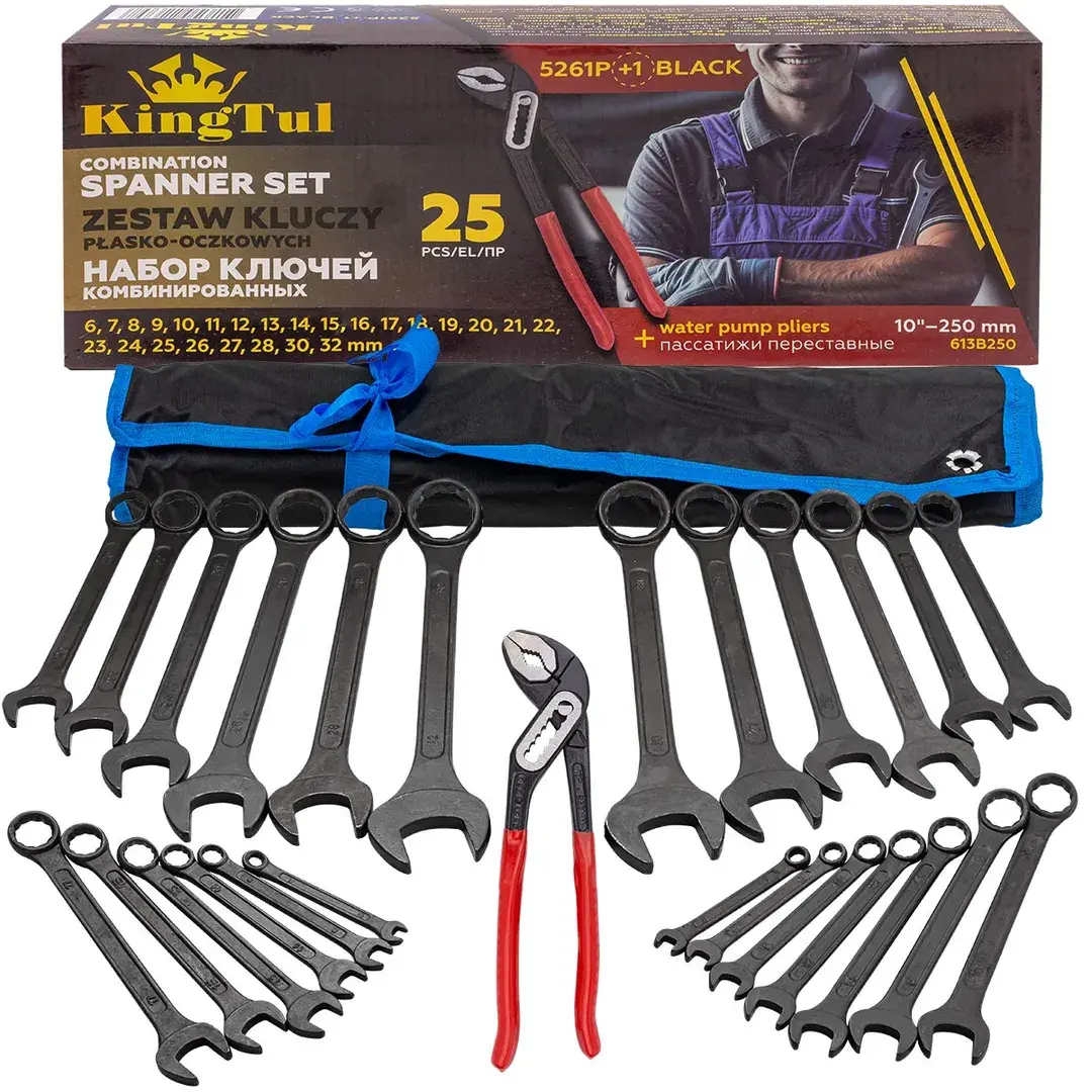 Набор комбинированных ключей представляет собой профессиональный комплект из 25 предметов, включающий ключи размерами 6, 7, 8, 9, 10, 11, 12, 13, 14, 15, 16, 17, 18, 19, 20, 21, 22, 23, 24, 25, 26, 27, 28, 30, 32 мм для выполнения слесарных и ремонтных работ. Ключи гаечные комбинированные - универсальные инструменты, совмещающие функционал рожковых и накидных ключей с одинаковыми размерами зевов, предназначены для монтажа и демонтажа резьбовых соединений. Весь набор организованно размещен в практичном тканевом органайзере с специальными отверстиями в верхних углах полотна для удобной настенной фиксации и транспортировки. В комплект дополнительно входят пассатижи переставные черного цвета длиной 250 мм, оснащенные универсальными губками для надежного захвата предметов различной формы. Эргономичные двукомпонентные рукоятки с матовым покрытием обеспечивают комфортный захват и предотвращают скольжение, а специальная защита от защемления пальцев повышает безопасность при работе. Вся продукция предназначена для исп
