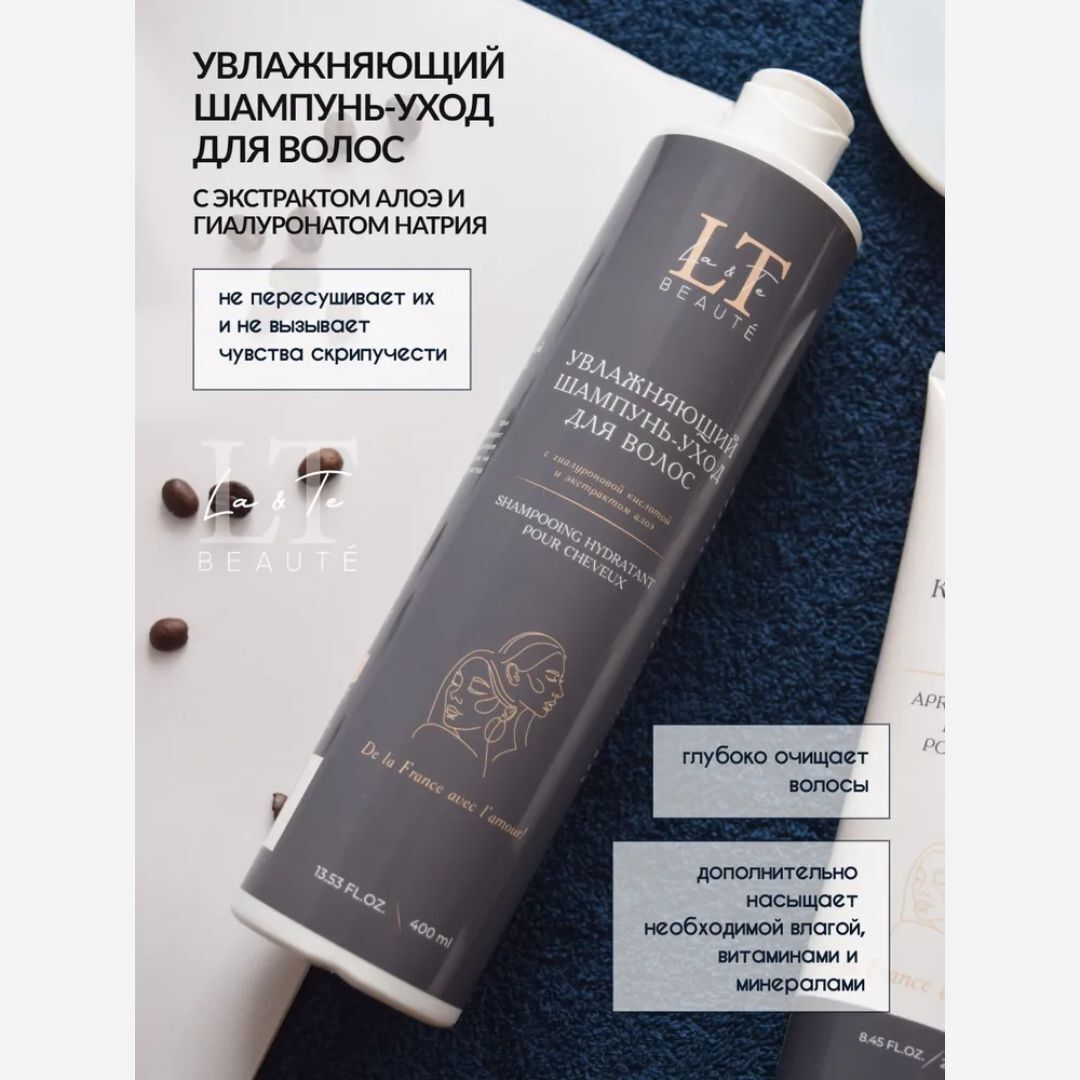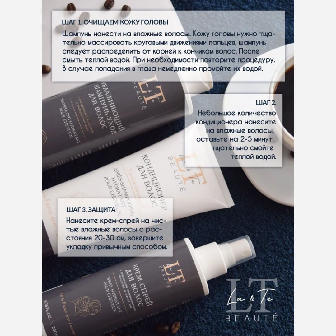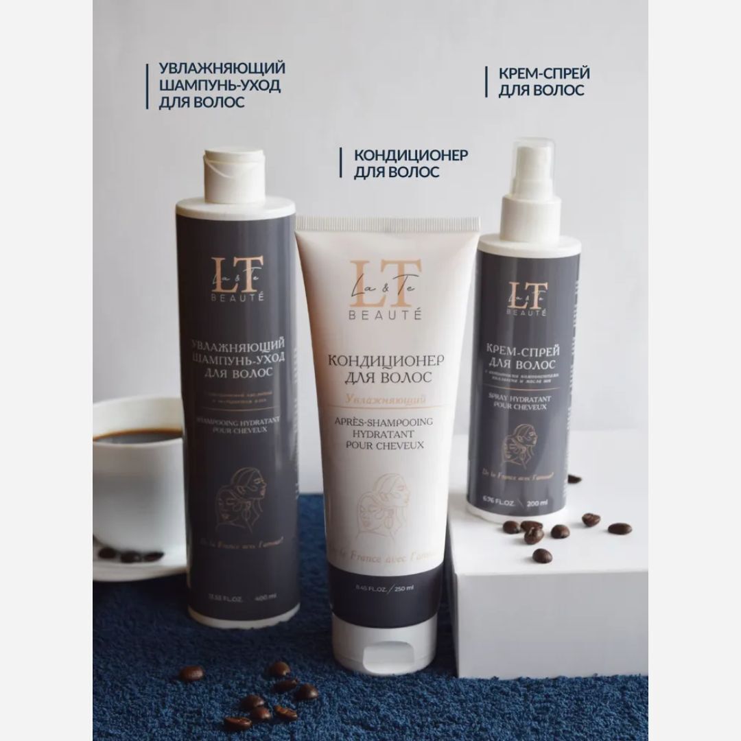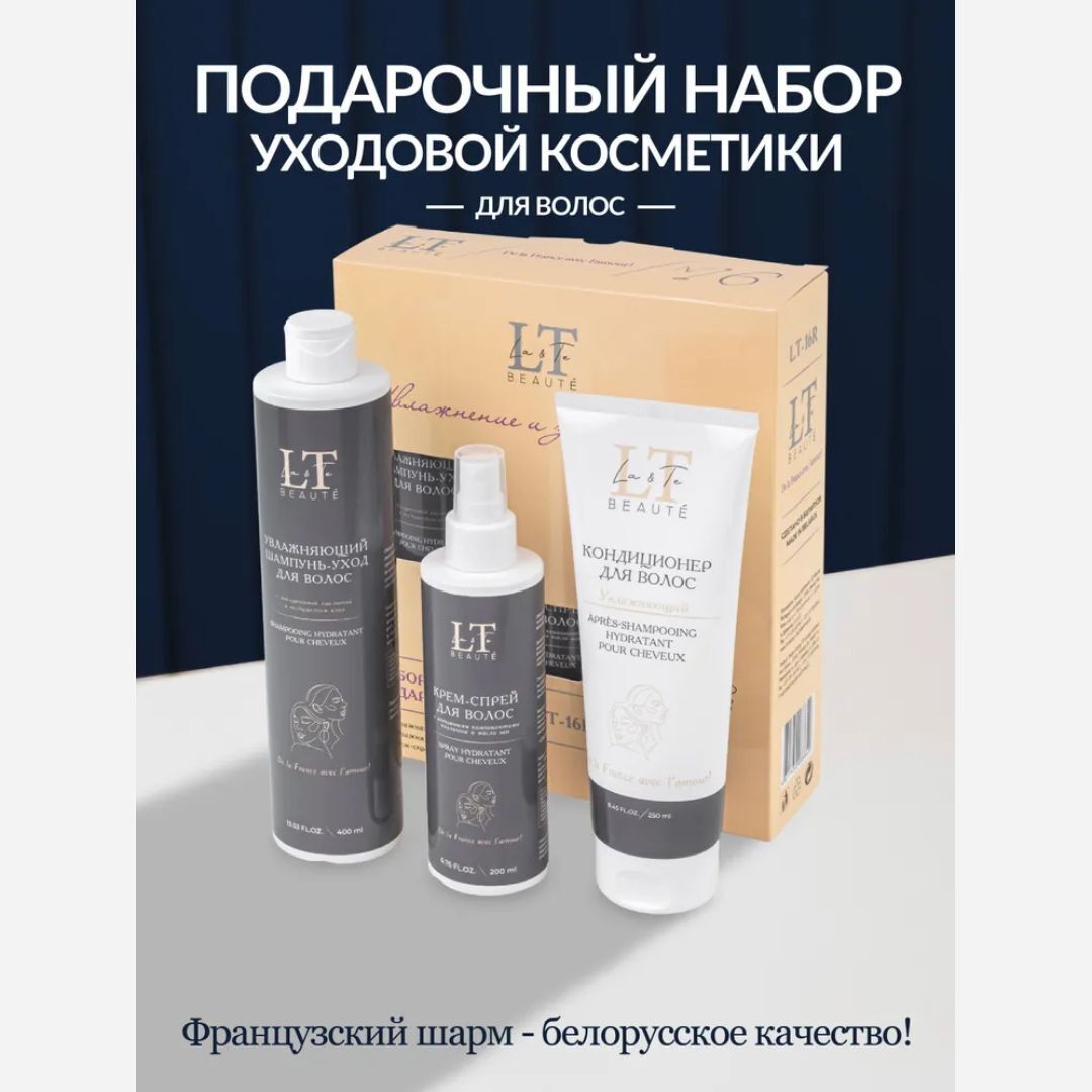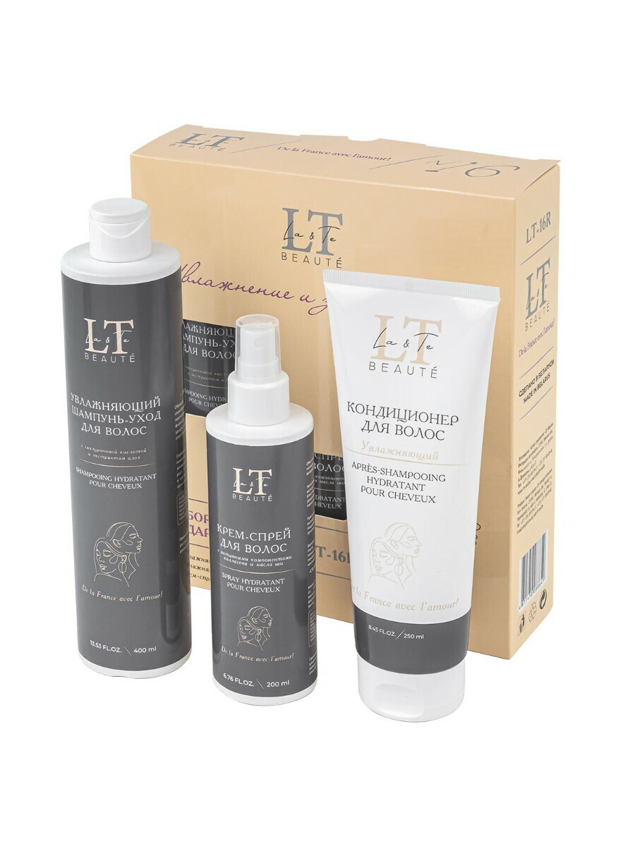 La & Te beauté - это качественная уходовая косметика, которая подходит для всей семьи. В данный набор входит шампунь, кондиционер и крем-спрей для волос. Увлажняющий шампунь-уход для волос с гиалуроновой кислотой и экстрактом алоэ насыщает необходимой влагой, витаминами и минералами. Гиалуронат натрия образует на поверхности волоса своеобразный защитный слой, не просто препятствуя испарению влаги за счет своих физических свойств, но и помогая удерживать ее внутри, благодаря своей способности связывать воду. Экстракт алоэ содержит в себе полисахариды, которые помогают в значительной степени замедлить выпадение волос и ускорить их рост. А витамины и минералы, входящие в состав алоэ, улучшают общее состояние кожи головы, уменьшая количество перхоти. Увлажняющий кондиционер для волос с гиалуроновой кислотой и пантенолом глубоко увлажняет волосы, укрепляя их по всей длине, помогает восстановить гидробаланс и снизить пушистость. Гиалуроновая кислота интенсивно увлажняет волосяные фолликулы, помогает обеспечить прядям гладкий и менее пушистый вид. Увеличивает способность волос удерживать влагу внутри, улучшая их общий вид и текстуру. Пантенол оказывает смягчающее действие на волосы, помогает восстановить грубую текстуру волос и сгладить недостатки волосяного стержня. Нормализует баланс содержания влаги в волосах, улучшая их общее состояние. Масла виноградной косточки и кокоса эффективно регулируют работу сальных желез, помогая бороться с перхотью и чрезмерной жирностью. Крем-спрей для волос. Активные компоненты, входящие в состав, мгновенно восстанавливают волосы по всей длине, придавая им здоровый вид, блеск и гладкость. Эффективно защищает от любого термовоздействия. Предотвращает ломкость и чрезмерную пушистость локонов, борется с секущимися кончиками. Силиконовый комплекс Dowsil 969 мягко восстанавливает поврежденные от ежедневного термовоздействия волосы. Кондиционирует, облегчает расчёсывание.