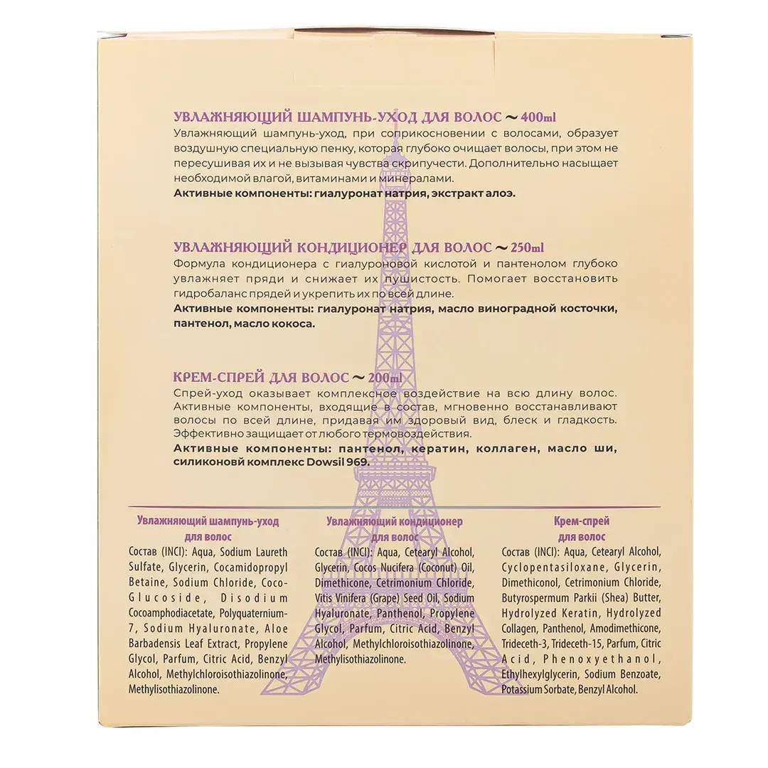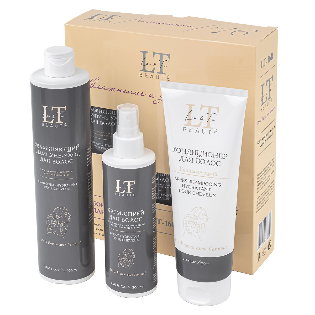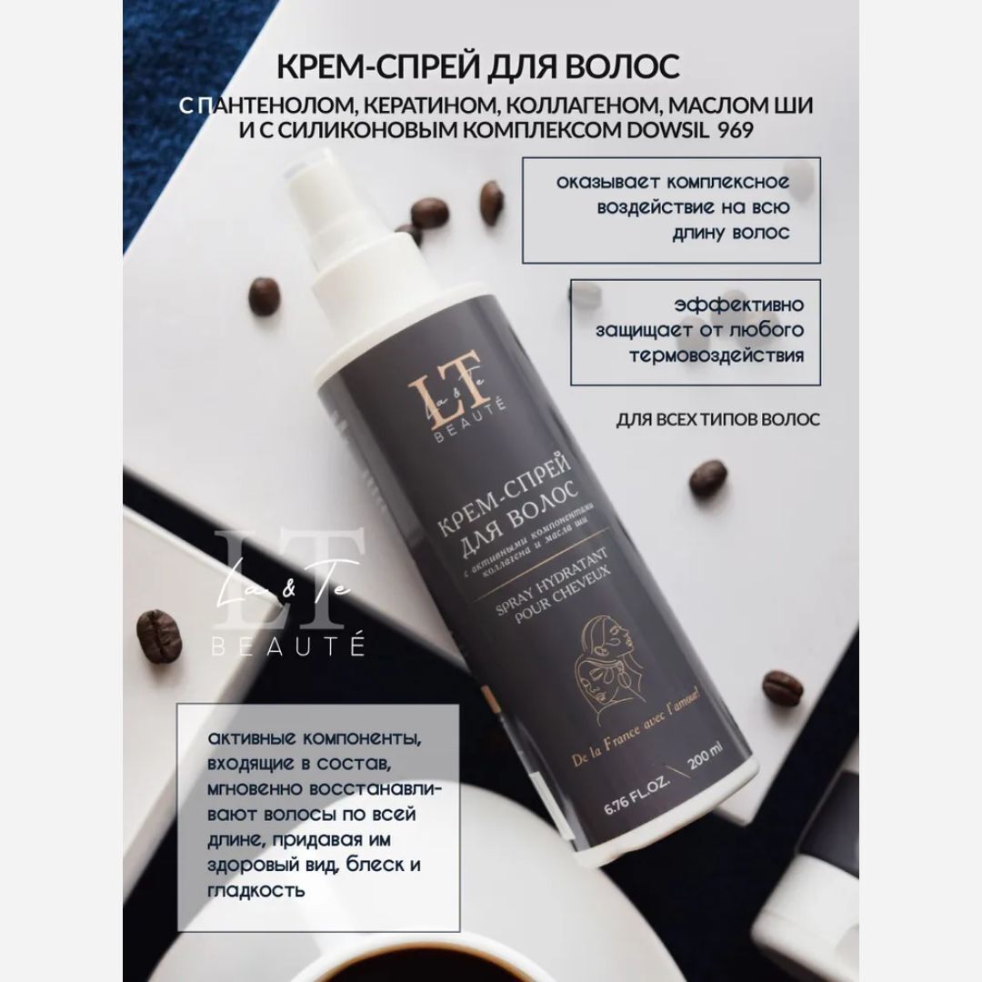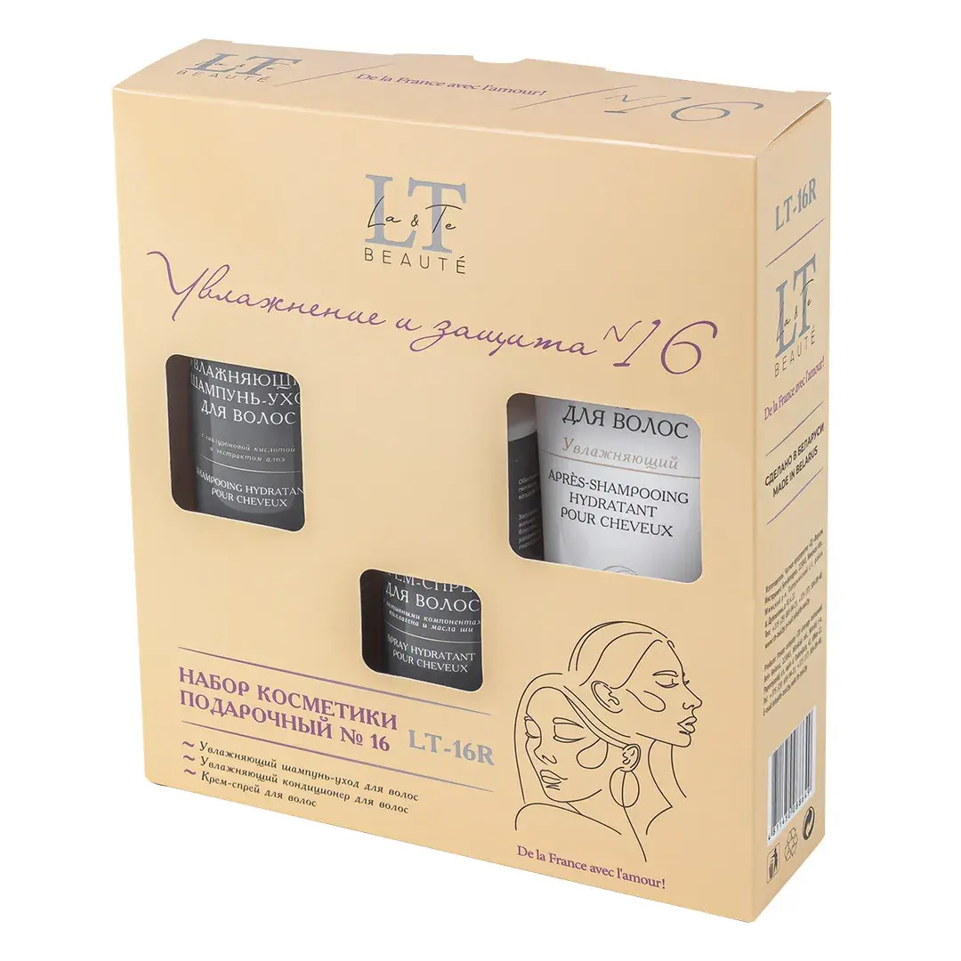La & Te beauté - это качественная уходовая косметика, которая подходит для всей семьи. В данный набор входит шампунь, кондиционер и крем-спрей для волос. Увлажняющий шампунь-уход для волос с гиалуроновой кислотой и экстрактом алоэ насыщает необходимой влагой, витаминами и минералами. Гиалуронат натрия образует на поверхности волоса своеобразный защитный слой, не просто препятствуя испарению влаги за счет своих физических свойств, но и помогая удерживать ее внутри, благодаря своей способности связывать воду. Экстракт алоэ содержит в себе полисахариды, которые помогают в значительной степени замедлить выпадение волос и ускорить их рост. А витамины и минералы, входящие в состав алоэ, улучшают общее состояние кожи головы, уменьшая количество перхоти. Увлажняющий кондиционер для волос с гиалуроновой кислотой и пантенолом глубоко увлажняет волосы, укрепляя их по всей длине, помогает восстановить гидробаланс и снизить пушистость. Гиалуроновая кислота интенсивно увлажняет волосяные фолликулы, помогает обеспечить прядям гладкий и менее пушистый вид. Увеличивает способность волос удерживать влагу внутри, улучшая их общий вид и текстуру. Пантенол оказывает смягчающее действие на волосы, помогает восстановить грубую текстуру волос и сгладить недостатки волосяного стержня. Нормализует баланс содержания влаги в волосах, улучшая их общее состояние. Масла виноградной косточки и кокоса эффективно регулируют работу сальных желез, помогая бороться с перхотью и чрезмерной жирностью. Крем-спрей для волос. Активные компоненты, входящие в состав, мгновенно восстанавливают волосы по всей длине, придавая им здоровый вид, блеск и гладкость. Эффективно защищает от любого термовоздействия. Предотвращает ломкость и чрезмерную пушистость локонов, борется с секущимися кончиками. Силиконовый комплекс Dowsil 969 мягко восстанавливает поврежденные от ежедневного термовоздействия волосы. Кондиционирует, облегчает расчёсывание.