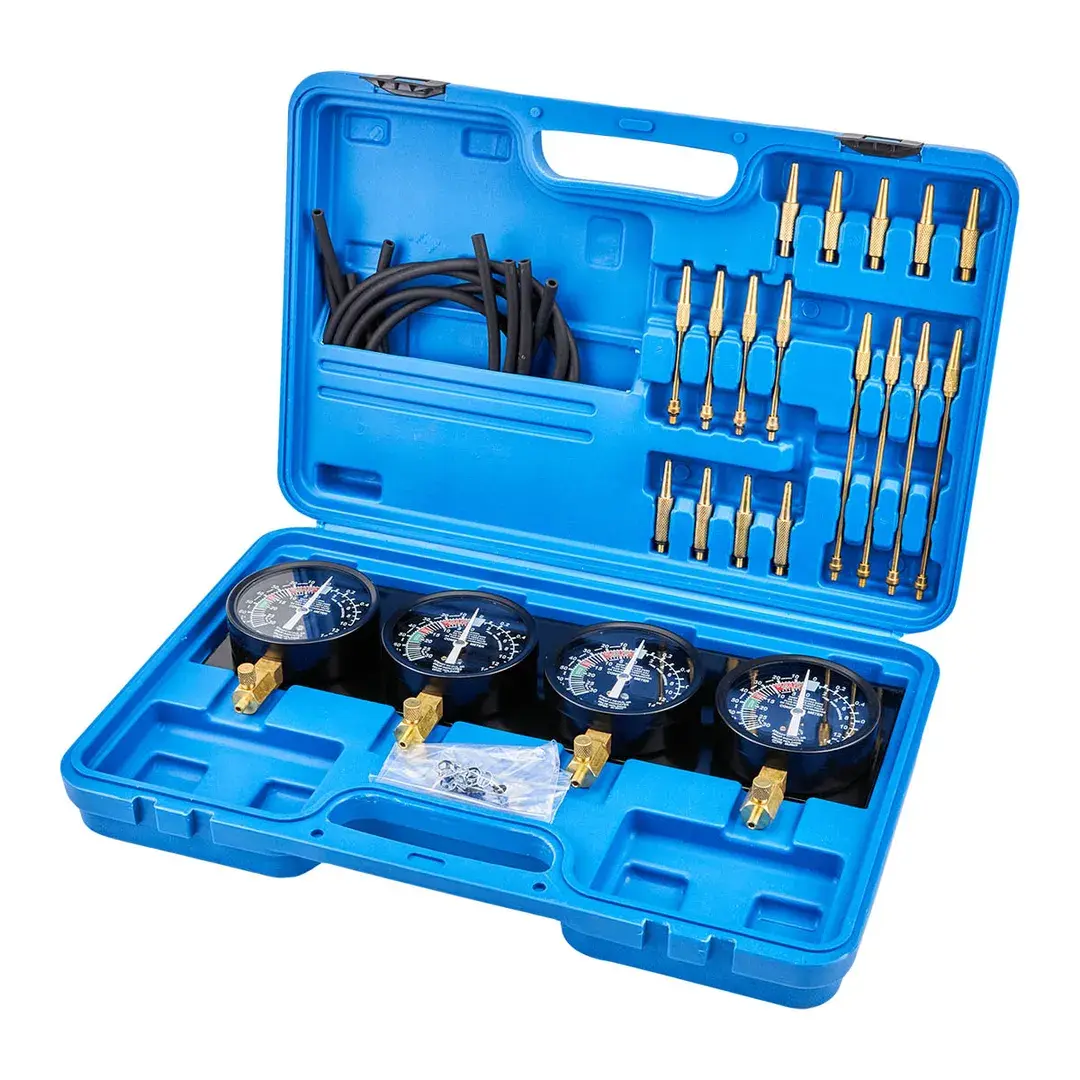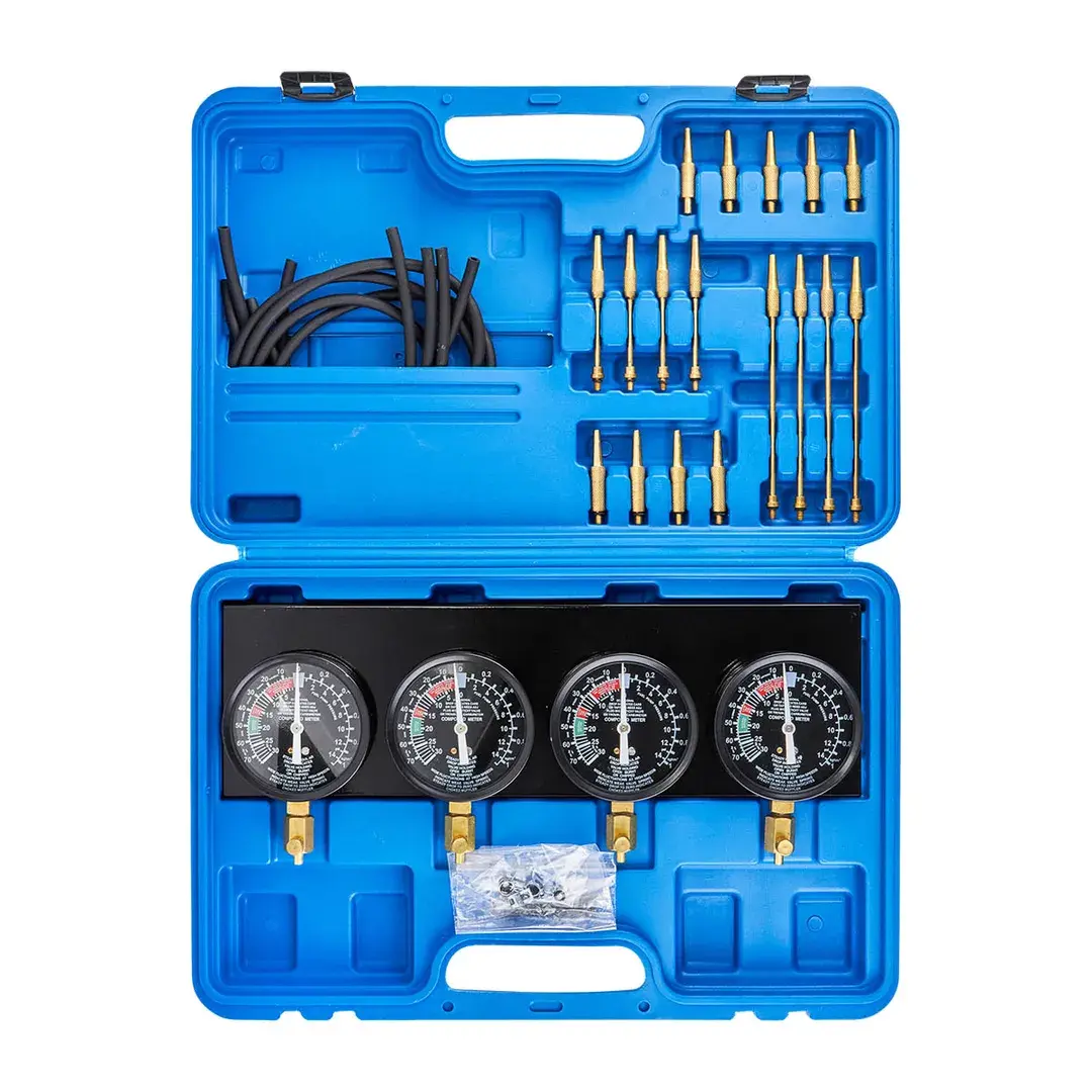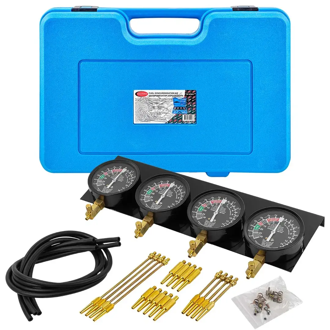 Применяется для тестирования топливного насоса карбюратора и его провода для автомобилей с 2-4 карбюраторами и мотоциклов. Комплектация: - 4 синхронизационных манометра 3-1/2"с неподвижным фиксатором; - 4 резиновых шланга 8*5*750 мм; - по 4 удлинительных трубки размерами: 3.9*52 мм, 3.9*122 мм; - 8 конических соединителей 8*40 мм; - 4 адаптера 10*53 мм (М6*0.75); - 4 адаптера 10*60 мм (М6*1.0). В пластиковом кейсе.