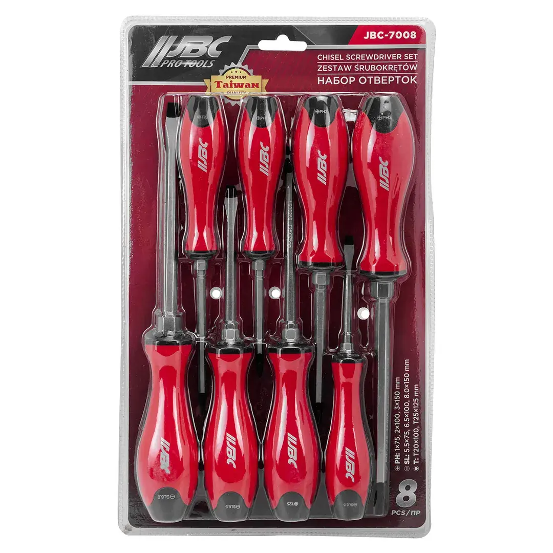 Набор отверток силовых с магнитными наконечниками 8 предметов в блистере - это удобный и надежный инструмент для работы с крепежными элементами. Отвертки имеют магнитные наконечники, которые позволяют легко захватывать и удерживать крепежные элементы, что делает работу более быстрой и удобной. Набор отверток предназначен для использования профессионалами, поэтому все инструменты изготовлены из высококачественной стали S2, которая обеспечивает высокую прочность и долговечность. В набор входят отвертки разных размеров, что позволяет выбрать оптимальный размер для каждой конкретной задачи. Рукоятка каждой отвертки имеет эргономичную форму, что обеспечивает удобство при работе и снижает риск повреждения рук. На конце рукоятки имеется специальный силовой наконечник, который позволяет бить молотком по отвертке при работе с закисшим крепежом. На конце хвостовика имеется расширение под гаечный ключ, благодаря которому на отвертку можно передать большее усилие при работе с крепежом. Комплектация: Отвертки шлицевые: S