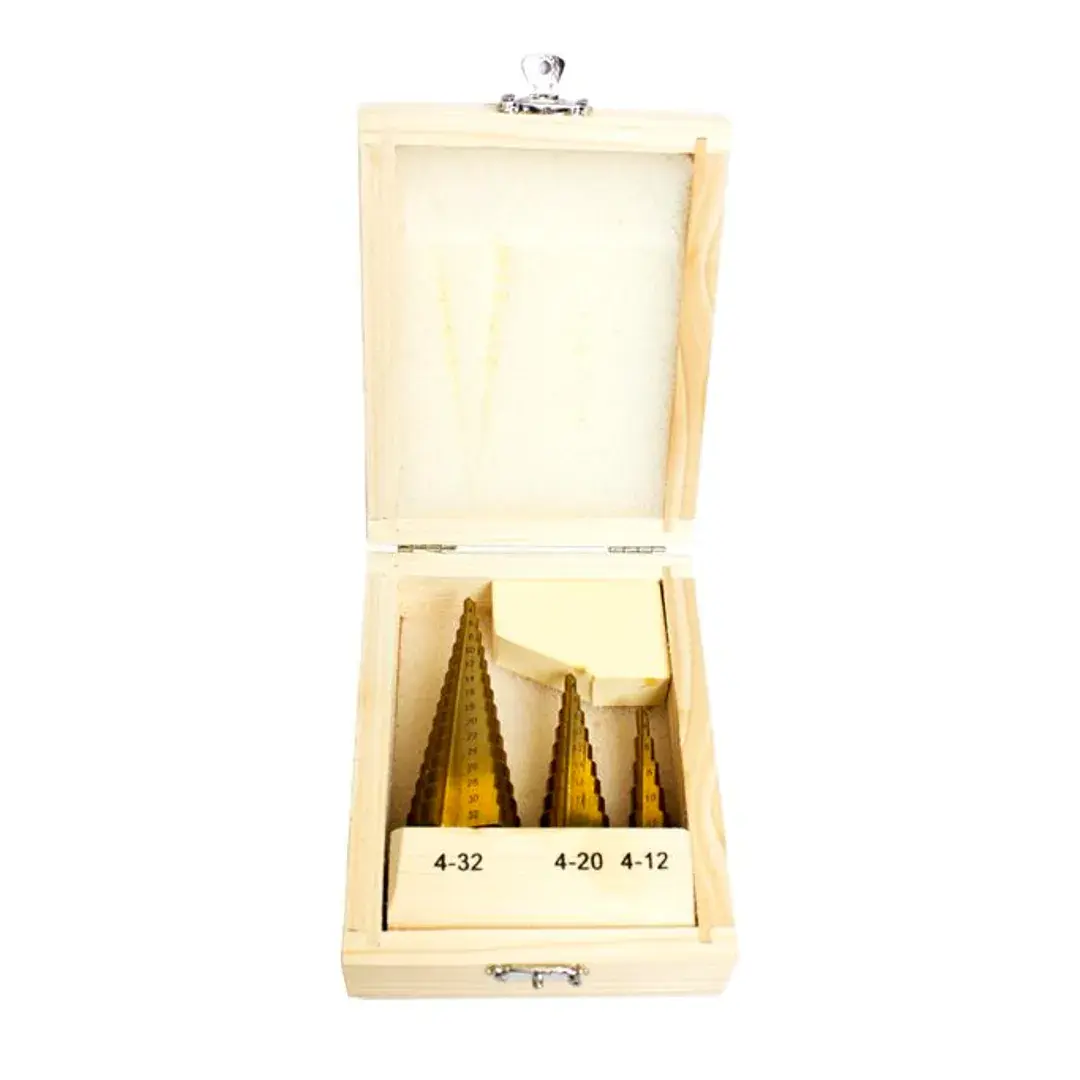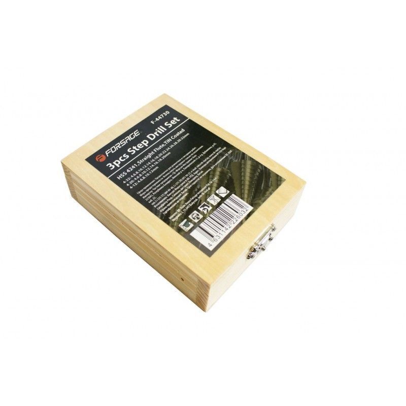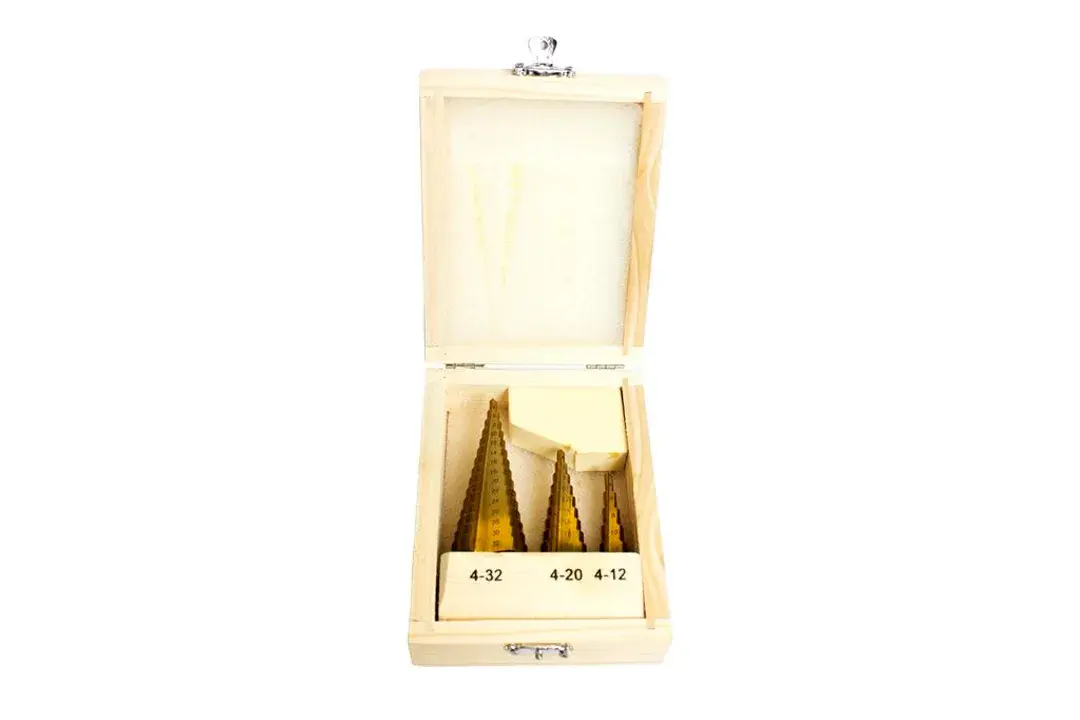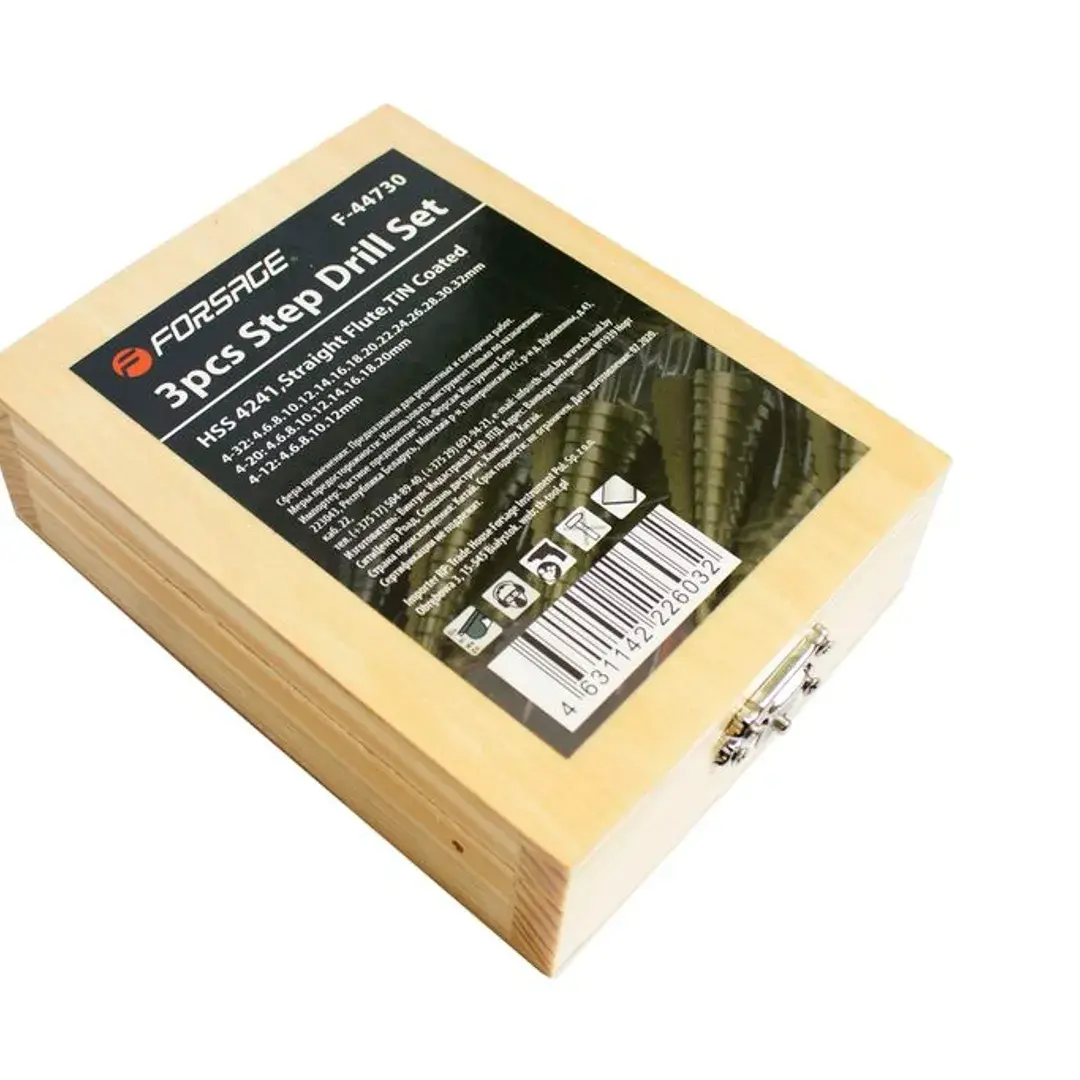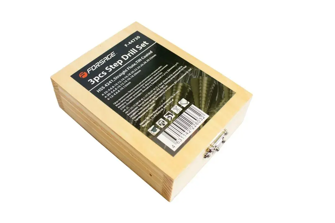 Набор сверл ступенчатых из 3 штук в кейсе изготовлен из высококачественной инструментальной быстрорежущей стали HSS 4241. Ступенчатые сверла предназначены для сверления отверстий разных диаметров в листовых и тонкостенных изделий из стали, цветных металлов, нержавеющей стали и пластика. Принцип работы конусного сверла прост: каждый следующий размер имеет плавный переход в виде ступеньки, что позволяет получать аккуратное отверстие нужного диаметра, не меняя при этом насадки. Преимущество ступенчатых сверл в том, что они позволяют сделать отверстия с более ровными кромками, в сравнении со спиральными и перовыми аналогами. Для отверстий различных диаметров применяется одно ступенчатое сверло. На каждой ступени есть маркировка фактического диаметра. Конусное сверло используется для обработки очень тонкого листового металла и идеально подходит для обработки цветных металлов без деформации. Так же сверло ступенчатое применимо для работы с ПВХ, гипсокартоном, пластиком, древесными плитами. При больших объемах работ позволяет экономить время за счет отсутствия необходимости замены сверл различных диаметров. Сверла совместимы с разными моделями станков и дрелей (сверлильный станок, ручная дрель, аккумуляторная дрель). Именно благодаря своей универсальности ступенчатое сверло по металлу отличается повышенным интересом со стороны профессиональных мастеров. Одно сверло заменяет целый набор традиционных спиральных сверл. Сверла поставляются в практичном деревянном кейсе с удобным доступом. Размеры: 4-12, 4-20, 4-32мм.