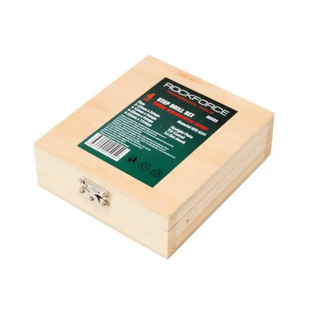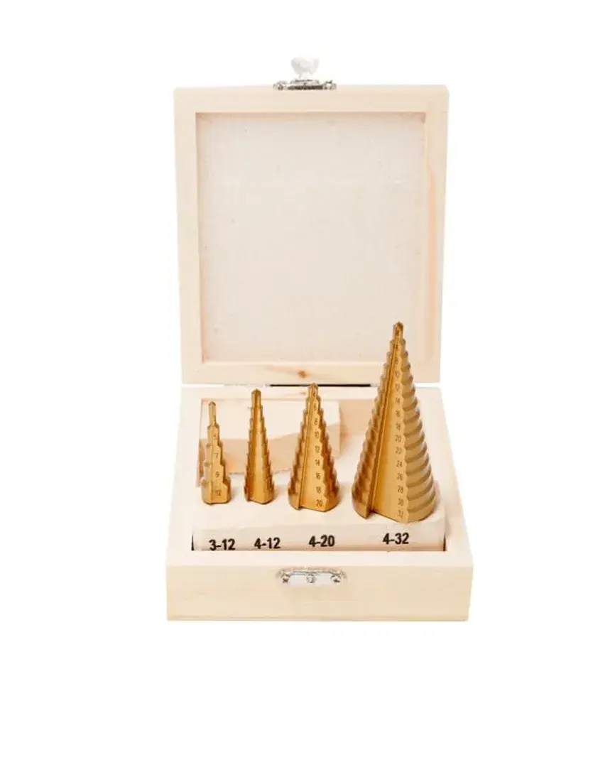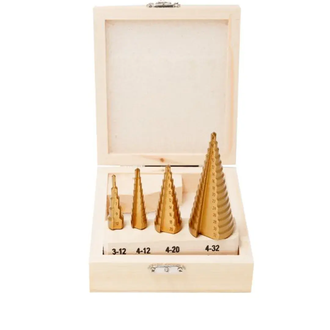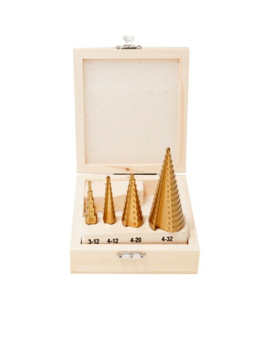 Набор сверл ступенчатых из 4 штук в кейсе изготовлен из высококачественной инструментальной быстрорежущей стали HSS 4241. Ступенчатые сверла предназначены для сверления отверстий разных диаметров в листовых и тонкостенных изделий из стали, цветных металлов, нержавеющей стали и пластика. Принцип работы конусного сверла прост: каждый следующий размер имеет плавный переход в виде ступеньки, что позволяет получать аккуратное отверстие нужного диаметра, не меняя при этом насадки. Преимущество ступенчатых сверл в том, что они позволяют сделать отверстия с более ровными кромками, в сравнении со спиральными и перовыми аналогами. Для отверстий различных диаметров применяется одно ступенчатое сверло. На каждой ступени есть маркировка фактического диаметра. Отверстие центрирует идеально. Конусное сверло используется для обработки очень тонкого листового металла и идеально подходит для обработки цветных металлов без деформации. Так же сверло ступенчатое применимо для работы с ПВХ, гипсокартоном, пластиком, древесными плитами. При больших объемах работ позволяет экономить время за счет отсутствия необходимости замены сверл различных диаметров. Сверла совместимы с разными моделями станков и дрелей (сверлильный станок, ручная дрель, аккумуляторная дрель). Именно благодаря своей универсальности ступенчатое сверло по металлу отличается повышенным интересом со стороны профессиональных мастеров. Одно сверло заменяет целый набор традиционных спиральных сверл. Сверла поставляются в практичном деревянном кейсе с удобным доступом. Размеры: 3-12, 4-12, 4-20, 4-32мм.