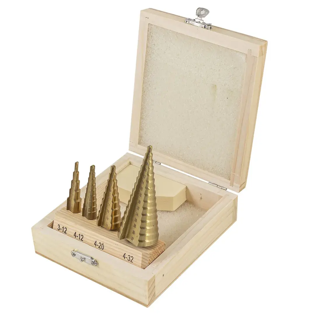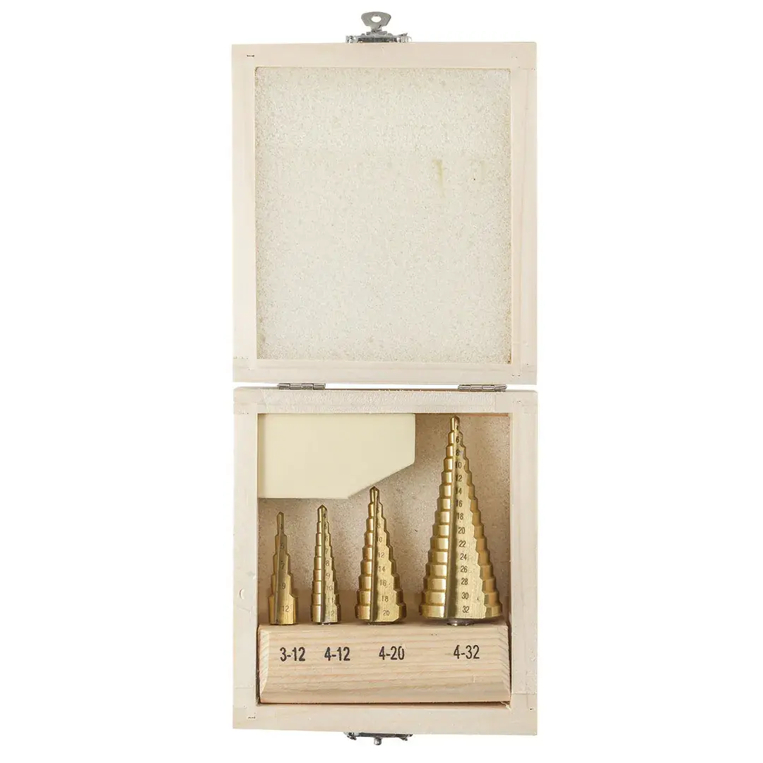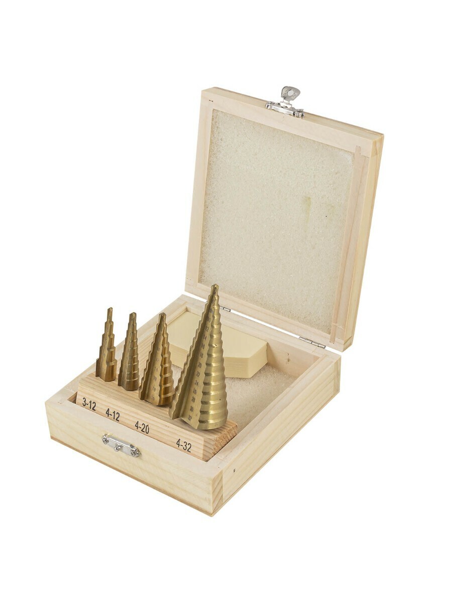 Набор сверл ступенчатых из 4 штук в кейсе изготовлен из высококачественной инструментальной быстрорежущей стали HSS 4241. Ступенчатые сверла предназначены для сверления отверстий разных диаметров в листовых и тонкостенных изделий из стали, цветных металлов, нержавеющей стали и пластика. Принцип работы конусного сверла прост: каждый следующий размер имеет плавный переход в виде ступеньки, что позволяет получать аккуратное отверстие нужного диаметра, не меняя при этом насадки. Преимущество ступенчатых сверл в том, что они позволяют сделать отверстия с более ровными кромками, в сравнении со спиральными и перовыми аналогами. Для отверстий различных диаметров применяется одно ступенчатое сверло. На каждой ступени есть маркировка фактического диаметра. Конусное сверло используется для обработки очень тонкого листового металла и идеально подходит для обработки цветных металлов без деформации. Так же сверло ступенчатое применимо для работы с ПВХ, гипсокартоном, пластиком, древесными плитами. При больших объемах работ позволяет экономить время за счет отсутствия необходимости замены сверл различных диаметров. Сверла совместимы с разными моделями станков и дрелей (сверлильный станок, ручная дрель, аккумуляторная дрель). Именно благодаря своей универсальности ступенчатое сверло по металлу отличается повышенным интересом со стороны профессиональных мастеров. Одно сверло заменяет целый набор традиционных спиральных сверл. Сверла поставляются в практичном деревянном кейсе с удобным доступом. Размеры: 3-12, 4-12, 4-20, 4-32мм.