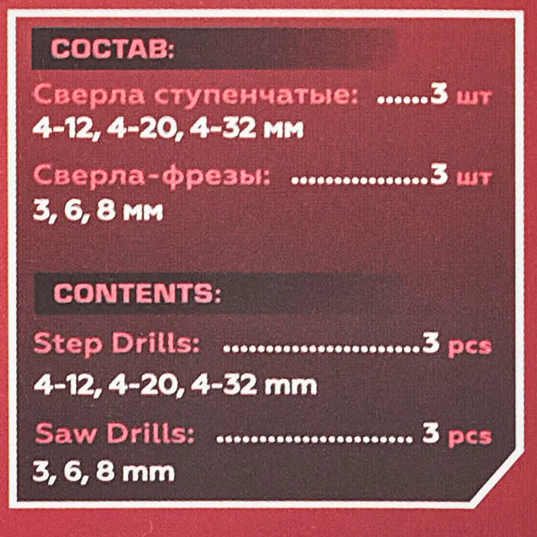 Набор сверл ступенчатых и сверл -фрез по алюминию.меди.дереву,пластику 6 пр (ступенчатые- 4-12,4-20,4-32)( фрезы-3мм,6мм,8мм) JBC JBC-44706
