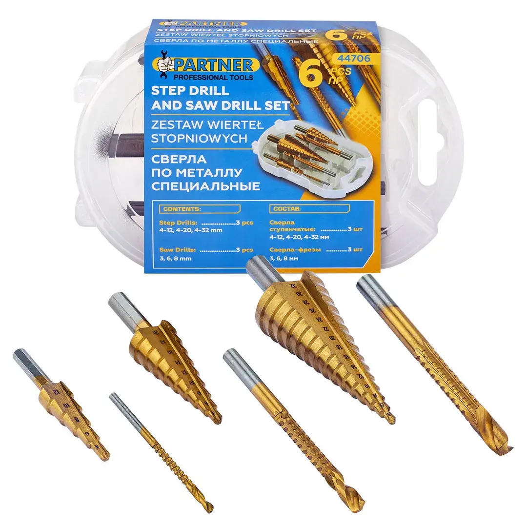 Набор сверл ступенчатых и сверл -фрез по алюминию.меди.дереву,пластику 6 пр (ступенчатые- 4-12,4-20,4-32)( фрезы-3мм,6мм,8мм) Partner PA-44706
