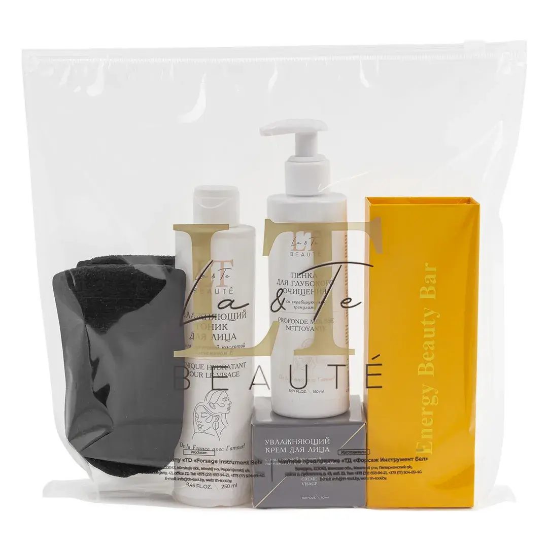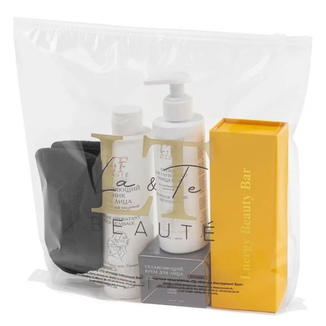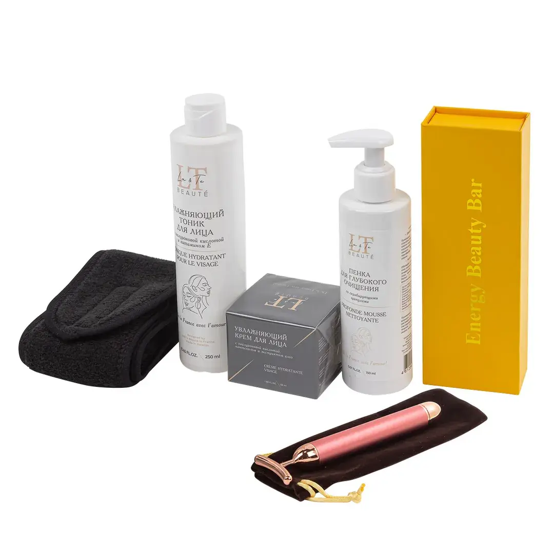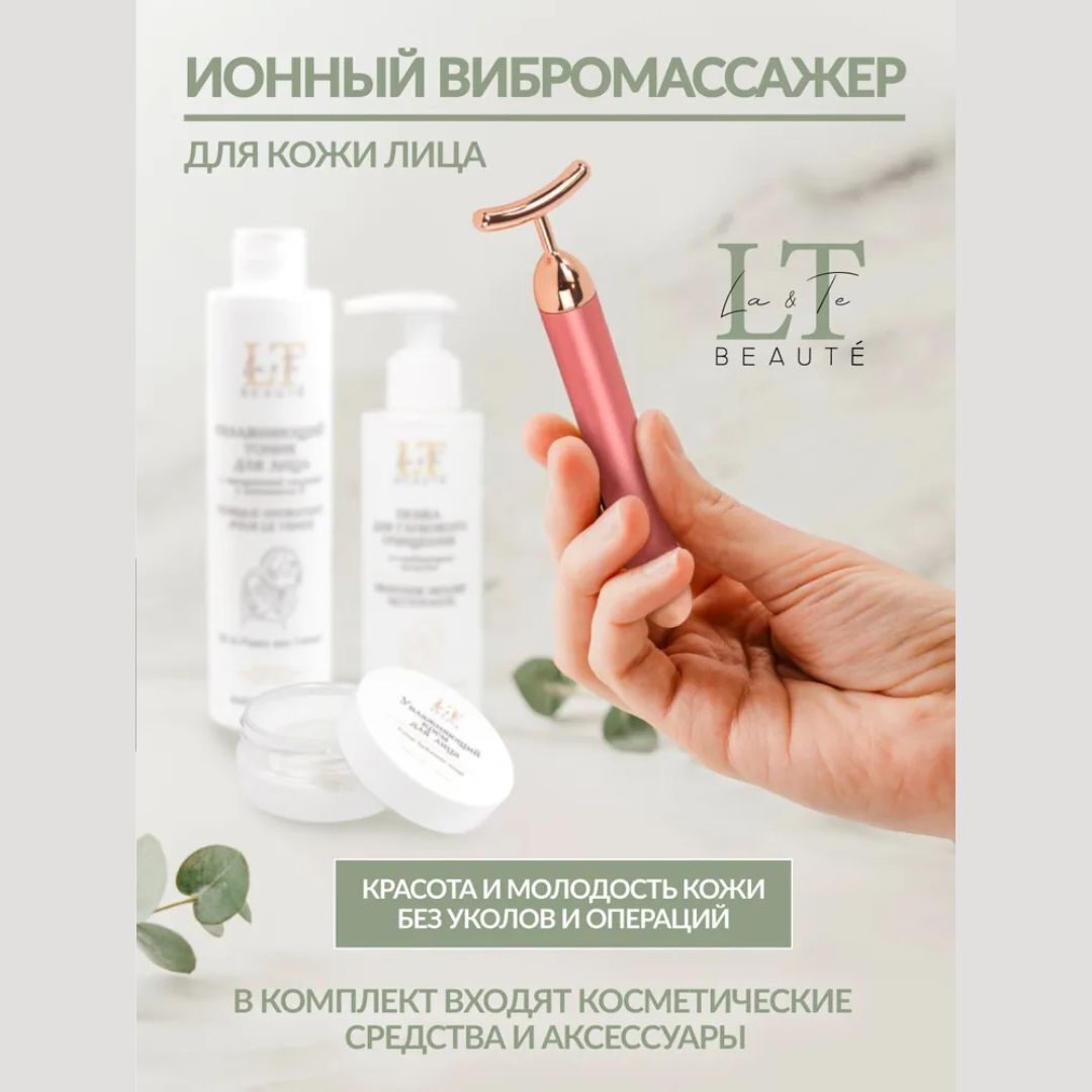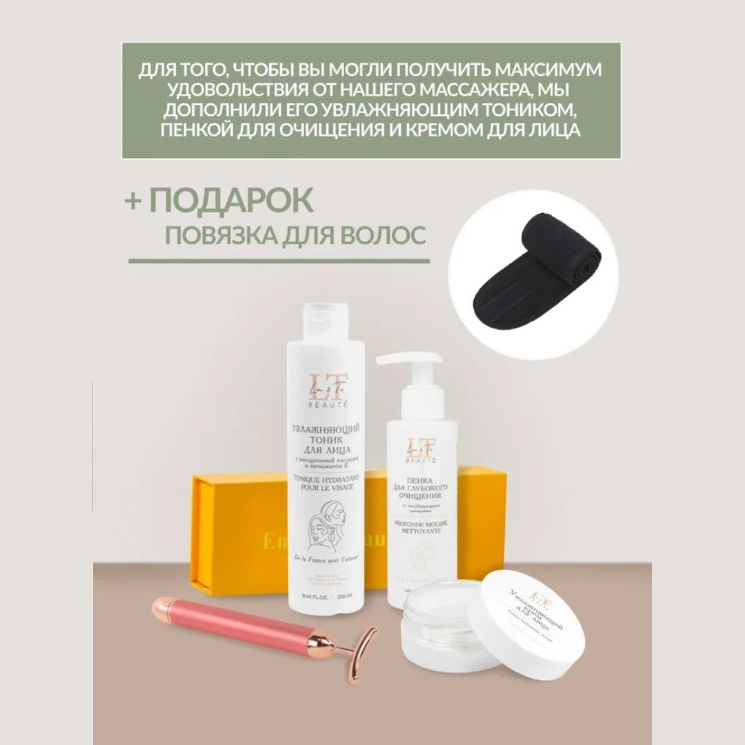 Электромассажер портативный прибор с лифтинг-эффектом. Этот маленький помощник позволит отказаться от походов к косметологу, а также от дополнительных трат. Частота роликовых вибраций достигает 6 тысяч оборотов в минуту. Такой микромассажер помогает вернуть коже красоту, свежесть и бархатистость, улучшает микроциркуляцию крови. Регулярное применение электрического массажера помогает избавиться от отеков на лице, подтягивает овал, разглаживает морщины. Массажер т-образный необходимо использовать от 3 до 5 раз в неделю. Время процедуры от 10 до 20 минут. Пользоваться массажером необходимо, когда Ваша кожа лица и декольте очищена и увлажнена. Перед применением наконечник массажера необходимо смочить водой. Удерживая за рукоятку, поднесите массажер к лицу и без усилия водите прибором по массажным линиям. После сеанса промыть наконечник массажера. Набор очищение укомплектован продуктами для полного цикла проведения процедуры: пенка для очищения кожи лица и декольте, увлажняющий тоник и увлажняющий крем для лица и декольте, а повязка для волос дополнительный аксессуар, чтобы прическа не мешала во время проведения процедуры. Все наборы упакованы в бренд пакет La&Te Beauté.