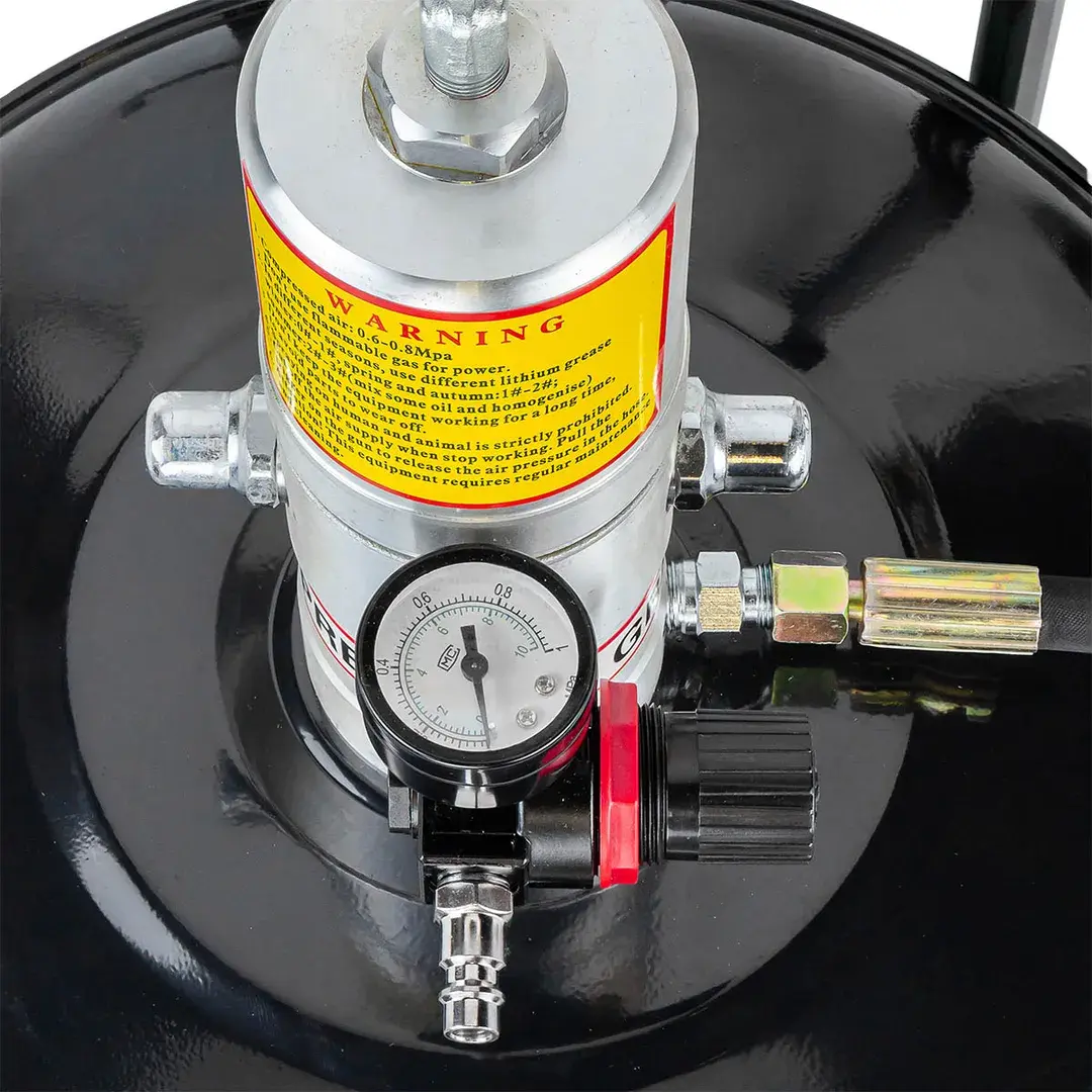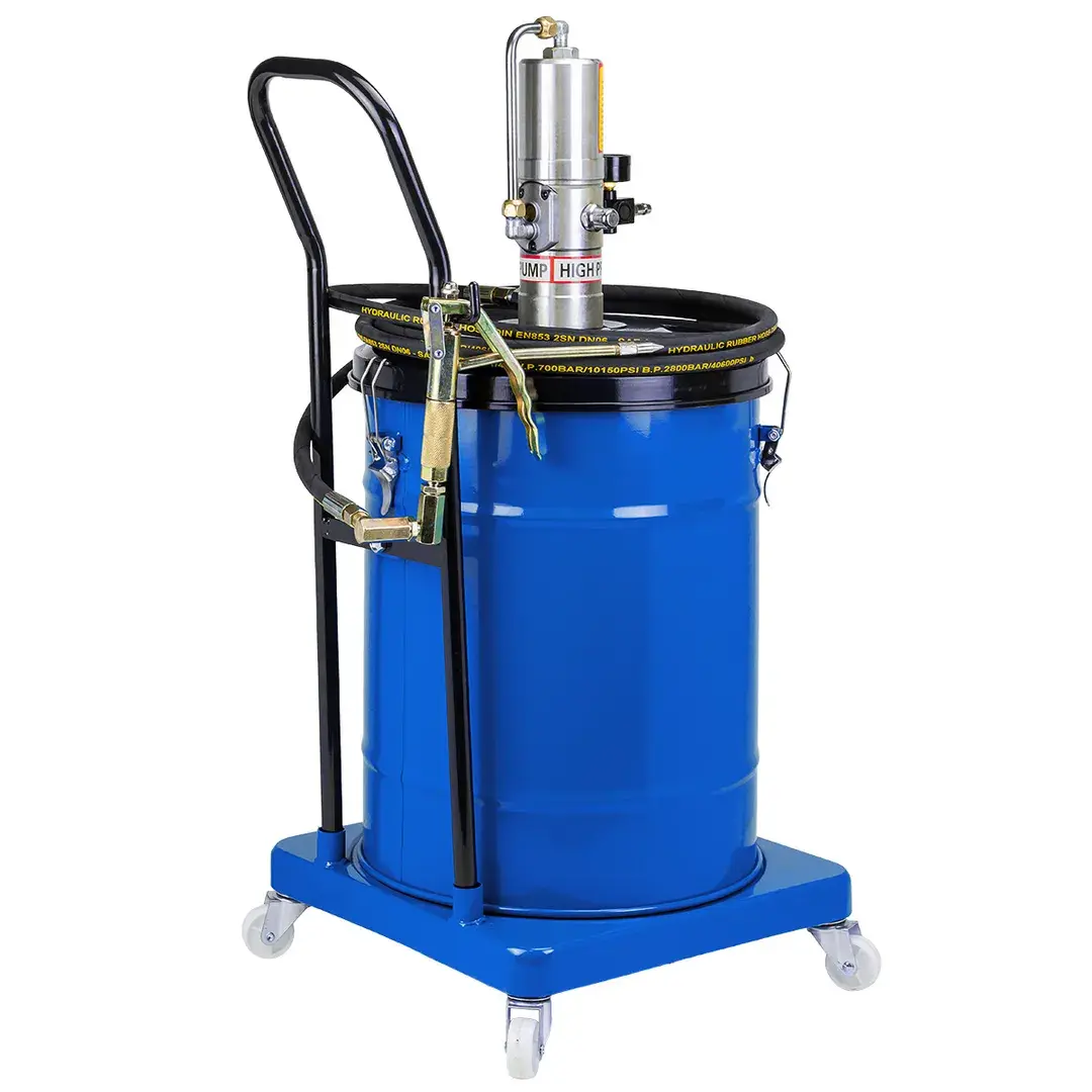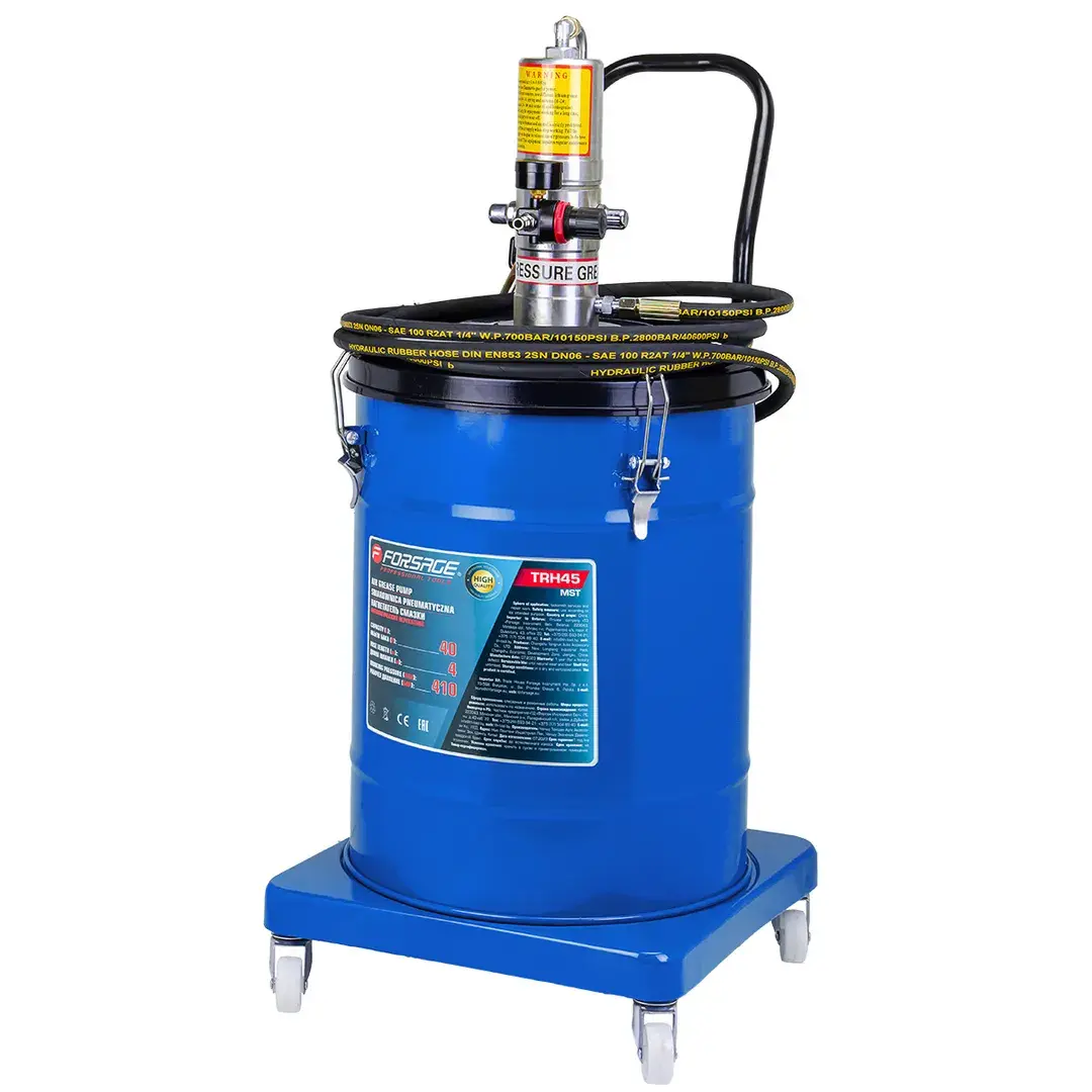 Нагнетатель смазки пневматический перекатной с емкостью 40л. Рабочее давление - 410bar, длина шланга - 4м. Нагнетатели смазки предназначаются для перекачивания консистентных смазок из ёмкостей. Этот вид оборудования широко применяется при ремонте и обслуживании легковых и грузовых автомобилей, спецтехники. Передвижные системы раздачи смазки незаменимы при обслуживании шестерённых передач станков, различных механизмов, узлов и агрегатов. Устройства просты и удобны в эксплуатации и могут применяться как на крупных предприятиях, так и в условиях небольших автосервисов, мастерских и гаражей. Конструкция насосной установки состоит из пневматического насоса, прижимного диска, крышки, крепления ёмкости. Смазка подаётся по шлангу высокого давления и поступает, непосредственно, к трущимся частям механизмов. При этом не требуется прилагать дополнительных усилий.
