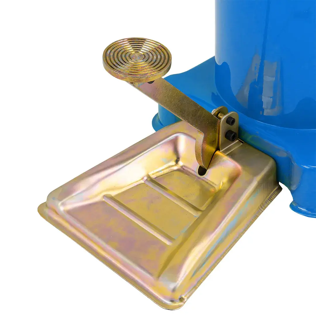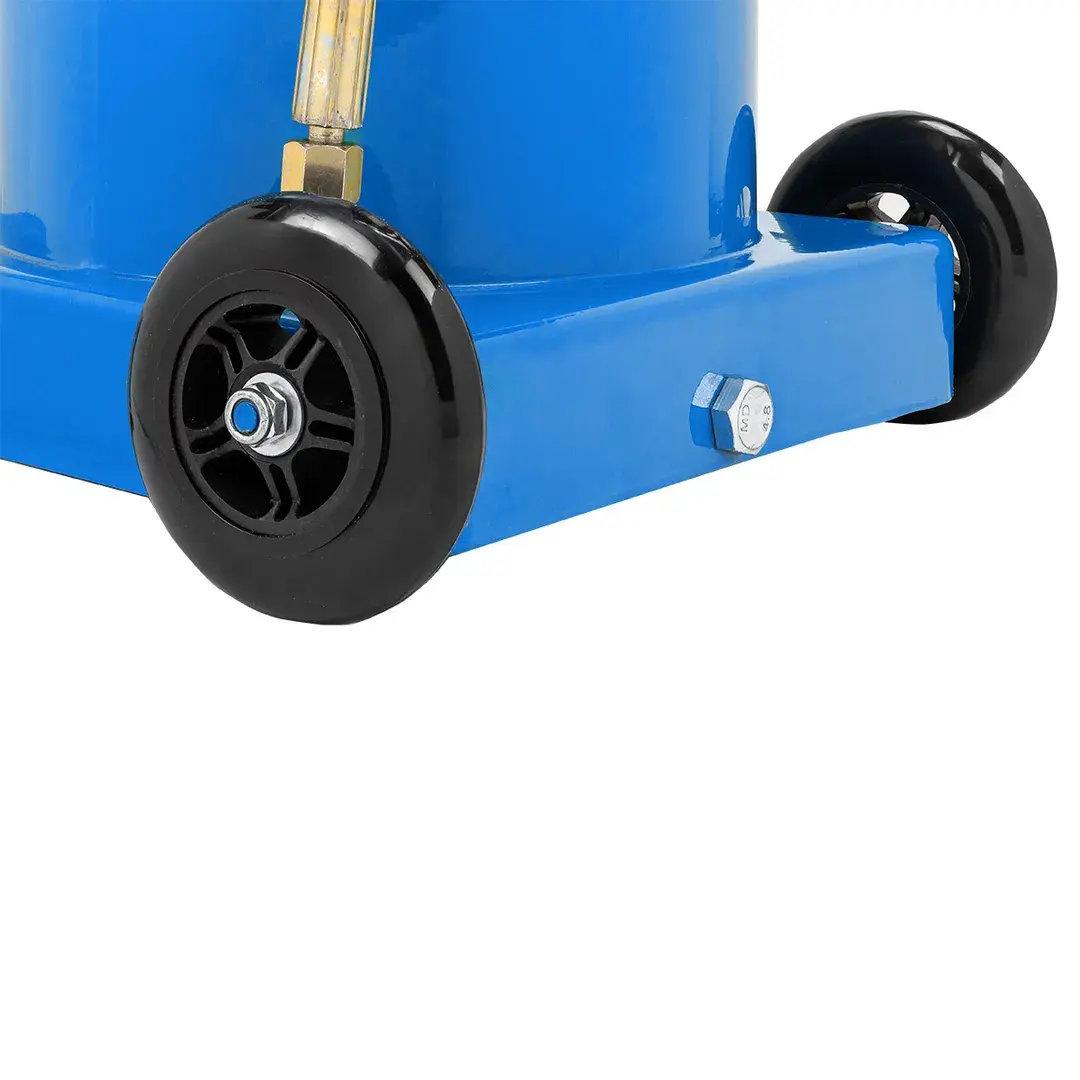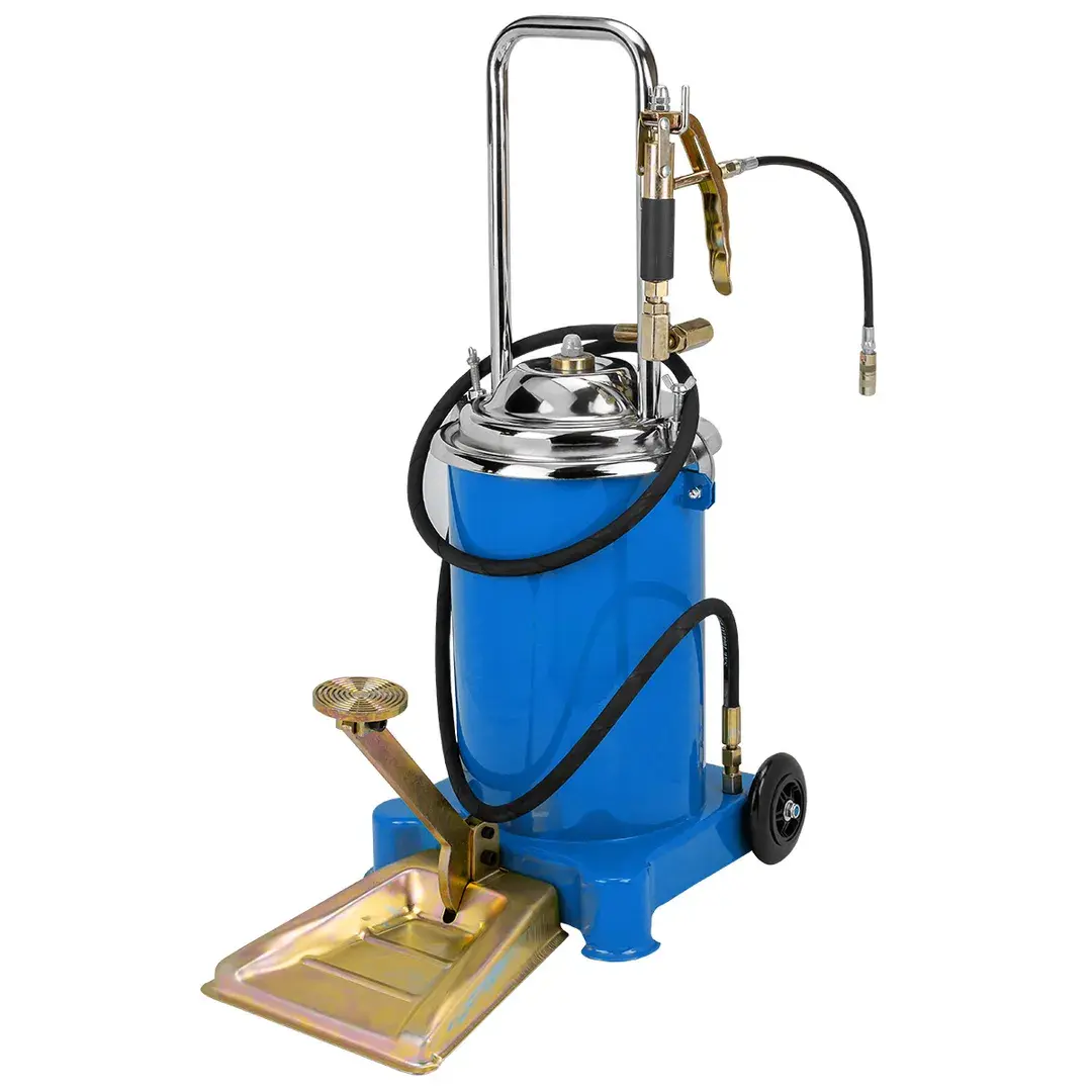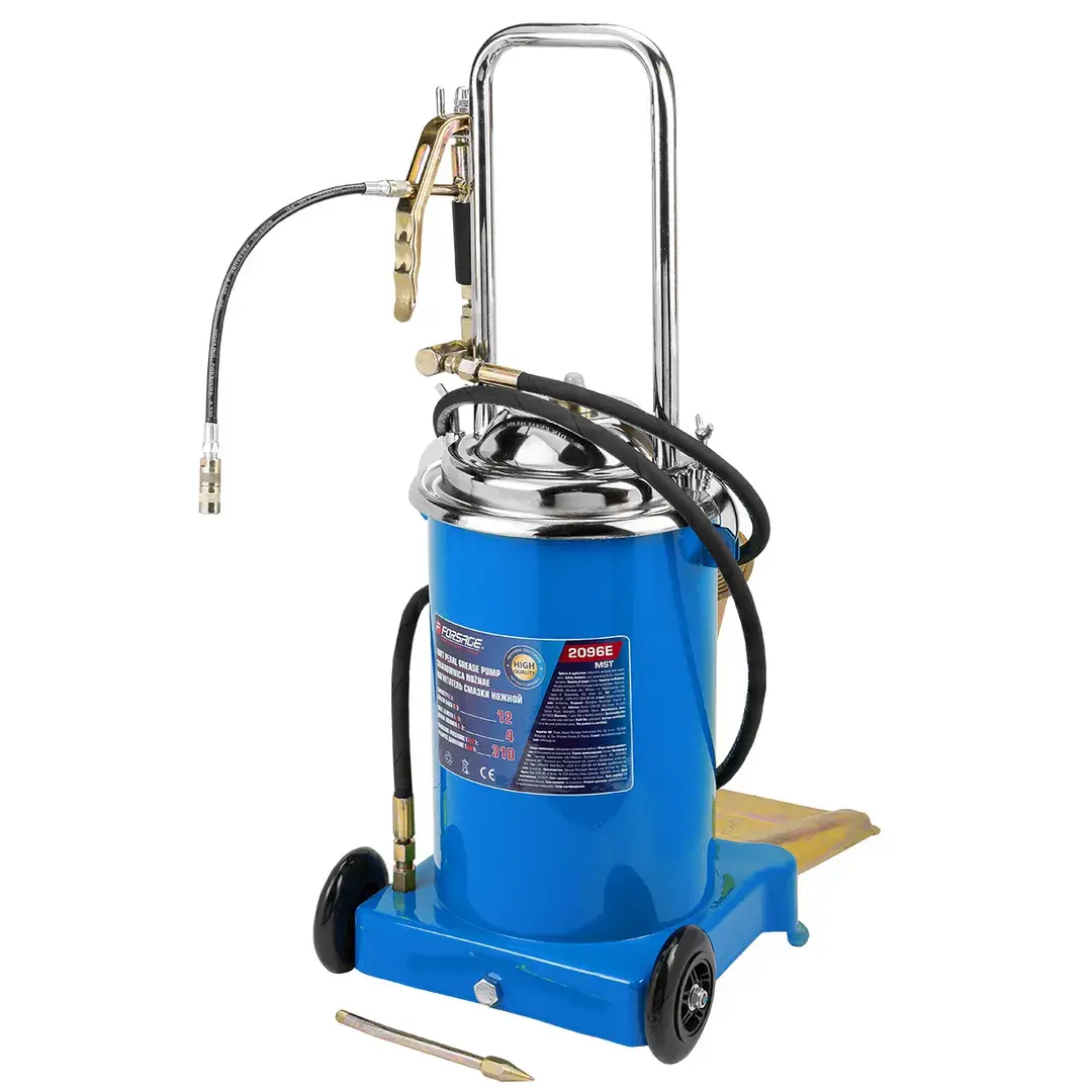 Мобильная установка на платформе с ножным насосом предназначена для смазывания элементов ходовой части и шарнирных соединений грузовых, легковых автомобилей и других транспортных средств в сфере ремонта и обслуживания механизмов и агрегатов. Фиксация насоса с крышкой к баку для смазки производится с помощью металлических защелок с резьбой. Для удобства транспортировки нагнетатель оборудован металлической ручкой в верхней части корпуса и двумя пластиковыми колесами. Ножной привод позволяет за два-три качка ногой смазывать большинство шарнирных соединений. Объем бака 12л Рабочее давление 310бар Длина шланга 4м
