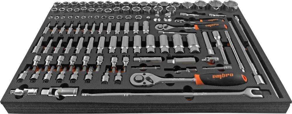 Зеркально отполированное хромоникелевое покрытие придает инструменту OMBRA безупречный вид и облегчает удаление загрязнений после работы. Накатка на переходах позволит надежно удерживать головку в руках, работая с крепежом при свободном вращении без использования дополнительных приводов. Торцевые головки OMBRA изготовлены из легированной хромованадиевой стали по технологии, позволяющей при использовании прилагать нагрузку, превышающие предельно допустимые для подобного инструмента на 30-50%. Область применения Универсальный набор инструмента, применяющийся для обслуживания резьбовых деталей с внешним рабочим шестигранным профилем от 4 до 32 мм. Расширенный выбор аксессуаров для торцевых головок и изделий для производства работ с крепежными деталями с внутренними рабочими профилями, включая внутренний TORX значительно расширяет область применения набора.