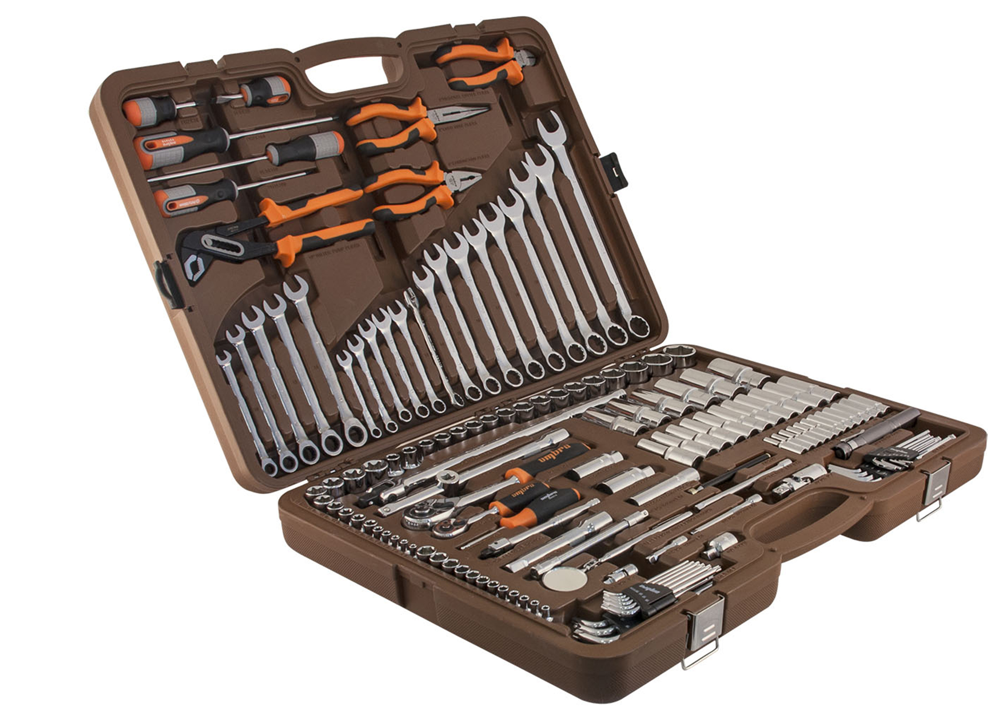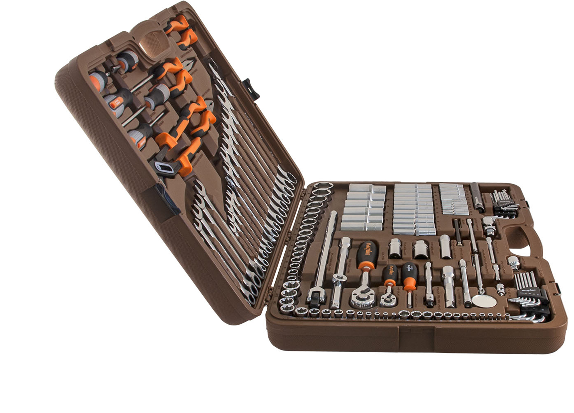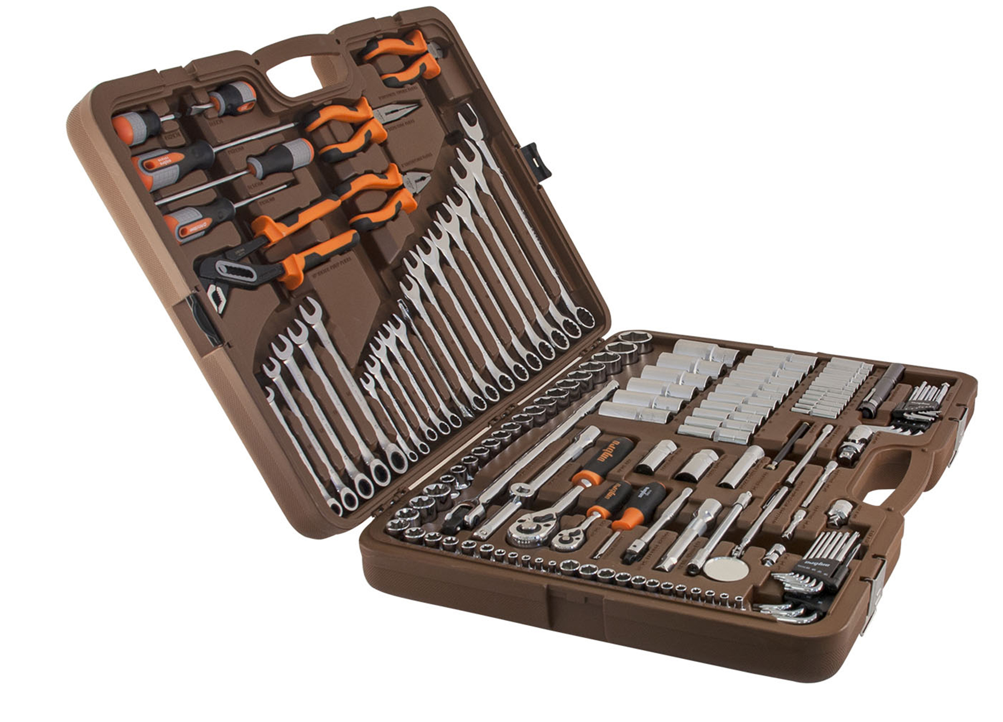 Головки торцевые 1/4''DR, 12 шт.: 4, 4.5, 5, 5.5, 6, 7, 8, 9, 10, 11, 12, 13 мм; Головки торцевые глубокие 1/4''DR, 12 шт.: 4, 4.5, 5, 5.5, 6, 7, 8, 9, 10, 11, 12, 13 мм; Головки торцевые 1/4"DR, внешний TORX®, 5 шт.: E4, E5, E6, E7, E8; Рукоятка трещоточная 1/4"DR, 72 зубца; Шарнир карданный 1/4"DR; Вороток шарнирный 1/4”DR, 150 мм Удлинитель гибкий 1/4"DR, 150 мм; Удлинители 1/4"DR, 3 шт.: 50, 100 и 150 мм; Рукоятка отверточная 1/4"DR; Головки торцевые 3/8"DR, внешний TORX®, 6 шт.: E10, E11, E12, E14, E16, E18; Головки торцевые свечные 3/8"DR, 3 шт.: 14, 16, 21 мм; Переходник 3/8"DR(F)*1/2"DR(M); Головки торцевые 1/2''DR, 17 шт.: 10, 11, 12, 13, 14, 15, 16, 17, 18, 19, 20, 21, 22, 24, 27, 30, 32 мм; Головки торцевые глубокие 1/2''DR, 17 шт.: 10, 11, 12, 13, 14, 15, 16, 17, 18, 19, 20, 21, 22, 24, 27, 30, 32 мм; Головки торцевые 1/2"DR, внешний TORX®, 3 шт.: E20, E22, E24; Удлинители 1/2"DR, 2 шт.: 125 и 250 мм; Рукоятка трещоточная 1/2"DR, 72 зубца; Шарнир карданный 1/2"DR; Вороток шарнирный 1/2”DR, 380 мм; Адаптер 3-х сторонний 1/2DR; Ключи гаечные комбинированные, 15 шт.: 8, 9, 10, 11, 12, 13, 14, 15, 16, 17, 18, 19, 21, 22, 24 мм; Ключи гаечные комбинированные трещоточные, 5 шт.: 8, 10, 12, 13, 14 мм; Набор ключей торцевых шестигранных с шаром H1.5-H10, 10 предметов; Набор ключей торцевых TORX® Т10-T50, 9 предметов; Отвертки стрежневые крестовые ROUND GRIP, 3 шт.: PH1x100, PH2x38, PH2x150 мм; Отвертки стрежневые шлицевые ROUND GRIP, 2 шт.: SL5x150, SL6x38 мм; Пассатижи, 160 мм; Бокорезы, 160 мм; Длинногубцы, 180 мм; Клещи переставные, 250 мм; Рукоятка телескопическая, магнитная, 640 мм; Зеркало телескопическое с магнитом, Ø-38 мм; Фонарь светодиодный, карманный, с фокусированным световым пучком, L-140 мм, Ø-15 мм; Кейс пластиковый