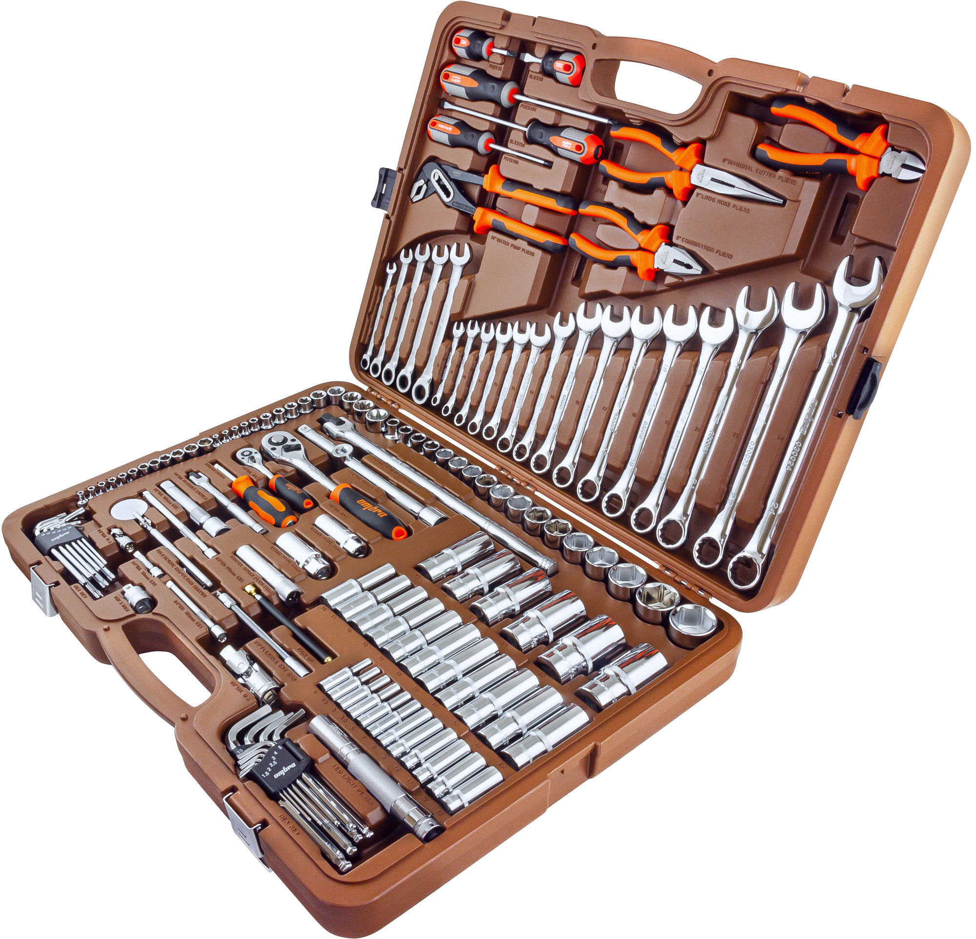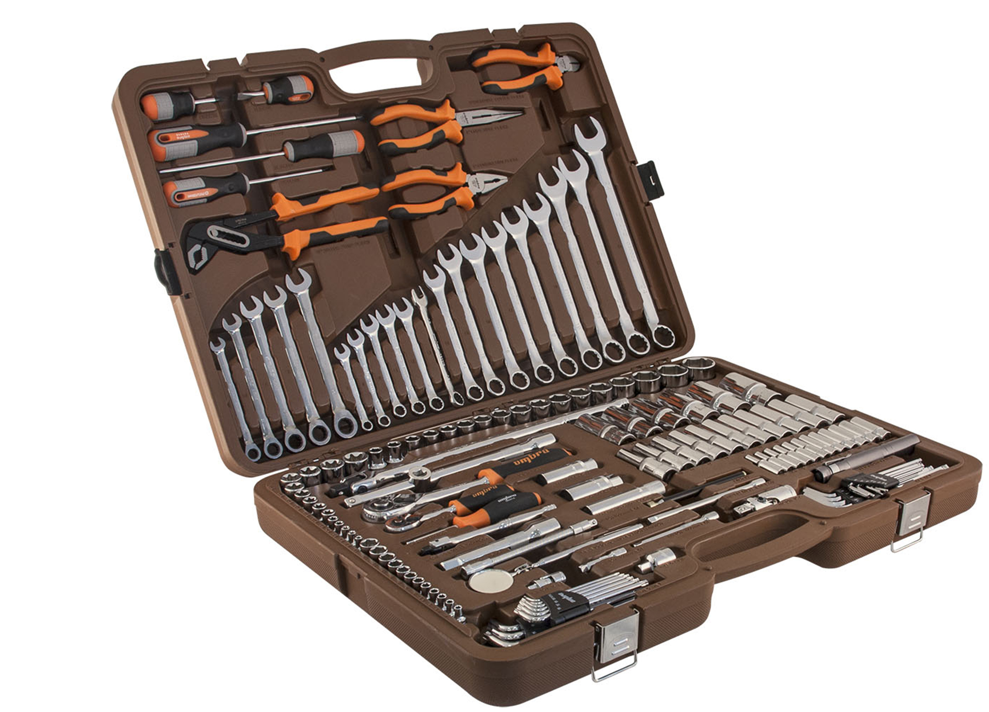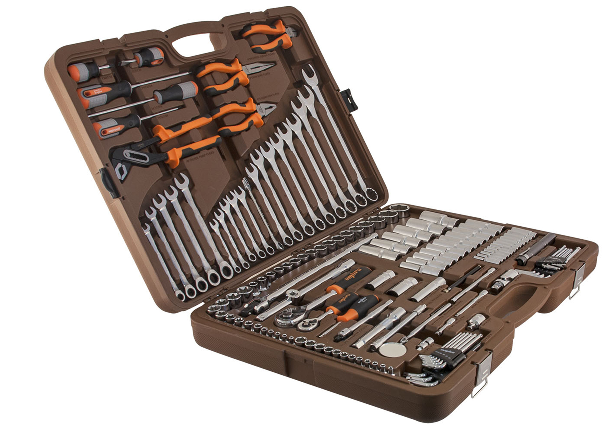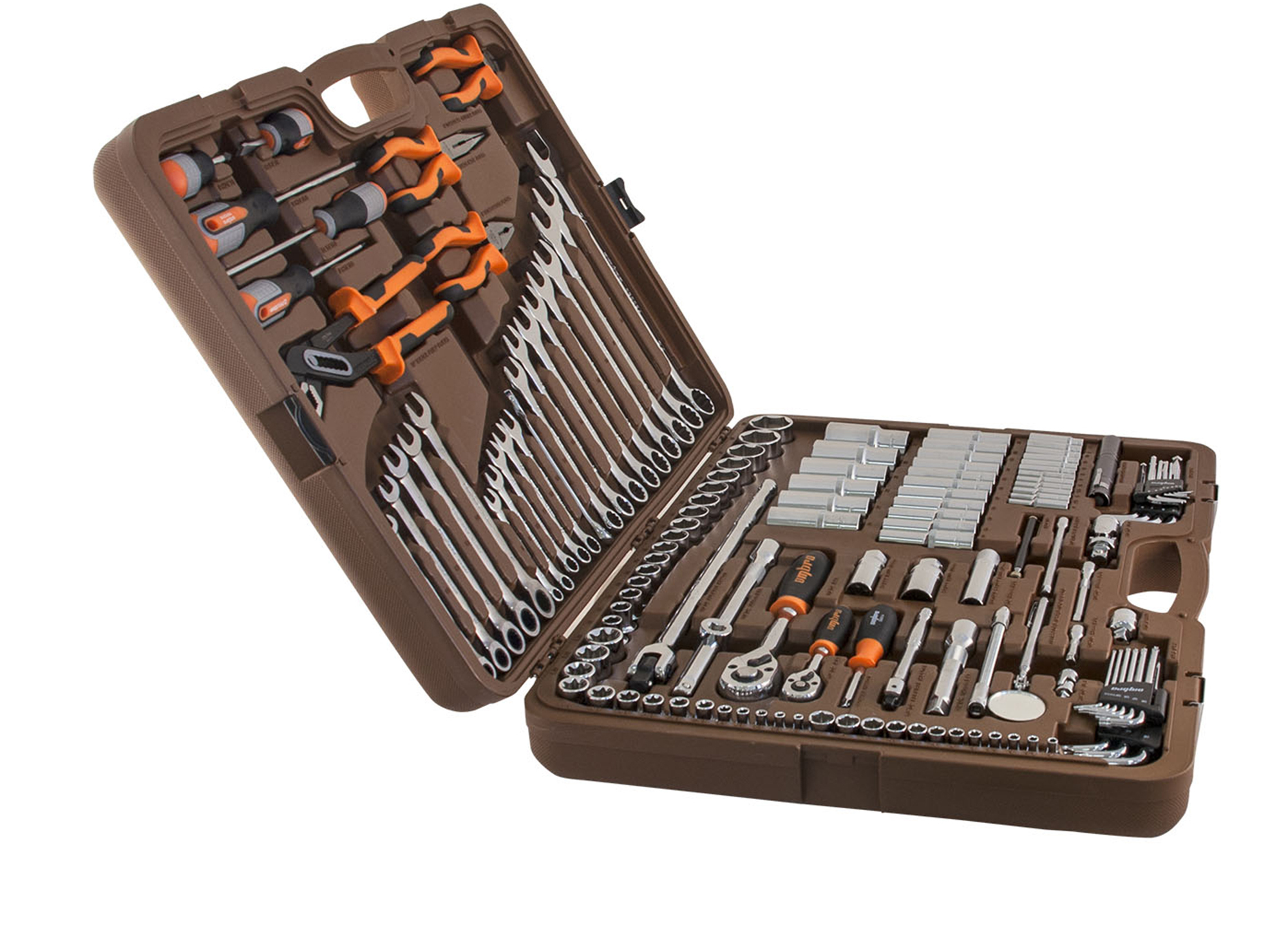 Головки торцевые 1/4''DR, 12 шт.: 4, 4.5, 5, 5.5, 6, 7, 8, 9, 10, 11, 12, 13 мм; Головки торцевые глубокие 1/4''DR, 12 шт.: 4, 4.5, 5, 5.5, 6, 7, 8, 9, 10, 11, 12, 13 мм; Головки торцевые 1/4"DR, внешний TORX®, 5 шт.: E4, E5, E6, E7, E8; Рукоятка трещоточная 1/4"DR, 72 зубца; Шарнир карданный 1/4"DR; Вороток шарнирный 1/4”DR, 150 мм Удлинитель гибкий 1/4"DR, 150 мм; Удлинители 1/4"DR, 3 шт.: 50, 100 и 150 мм; Рукоятка отверточная 1/4"DR; Головки торцевые 3/8"DR, внешний TORX®, 6 шт.: E10, E11, E12, E14, E16, E18; Головки торцевые свечные 3/8"DR, 3 шт.: 14, 16, 21 мм; Переходник 3/8"DR(F)*1/2"DR(M); Головки торцевые 1/2''DR, 17 шт.: 10, 11, 12, 13, 14, 15, 16, 17, 18, 19, 20, 21, 22, 24, 27, 30, 32 мм; Головки торцевые глубокие 1/2''DR, 17 шт.: 10, 11, 12, 13, 14, 15, 16, 17, 18, 19, 20, 21, 22, 24, 27, 30, 32 мм; Головки торцевые 1/2"DR, внешний TORX®, 3 шт.: E20, E22, E24; Удлинители 1/2"DR, 2 шт.: 125 и 250 мм; Рукоятка трещоточная 1/2"DR, 72 зубца; Шарнир карданный 1/2"DR; Вороток шарнирный 1/2”DR, 380 мм; Адаптер 3-х сторонний 1/2DR; Ключи гаечные комбинированные, 15 шт.: 8, 9, 10, 11, 12, 13, 14, 15, 16, 17, 18, 19, 21, 22, 24 мм; Ключи гаечные комбинированные трещоточные, 5 шт.: 8, 10, 12, 13, 14 мм; Набор ключей торцевых шестигранных с шаром H1.5-H10, 10 предметов; Набор ключей торцевых TORX® Т10-T50, 9 предметов; Отвертки стрежневые крестовые ROUND GRIP, 3 шт.: PH1x100, PH2x38, PH2x150 мм; Отвертки стрежневые шлицевые ROUND GRIP, 2 шт.: SL5x150, SL6x38 мм; Пассатижи, 160 мм; Бокорезы, 160 мм; Длинногубцы, 180 мм; Клещи переставные, 250 мм; Рукоятка телескопическая, магнитная, 640 мм; Зеркало телескопическое с магнитом, Ø-38 мм; Фонарь светодиодный, карманный, с фокусированным световым пучком, L-140 мм, Ø-15 мм; Кейс пластиковый