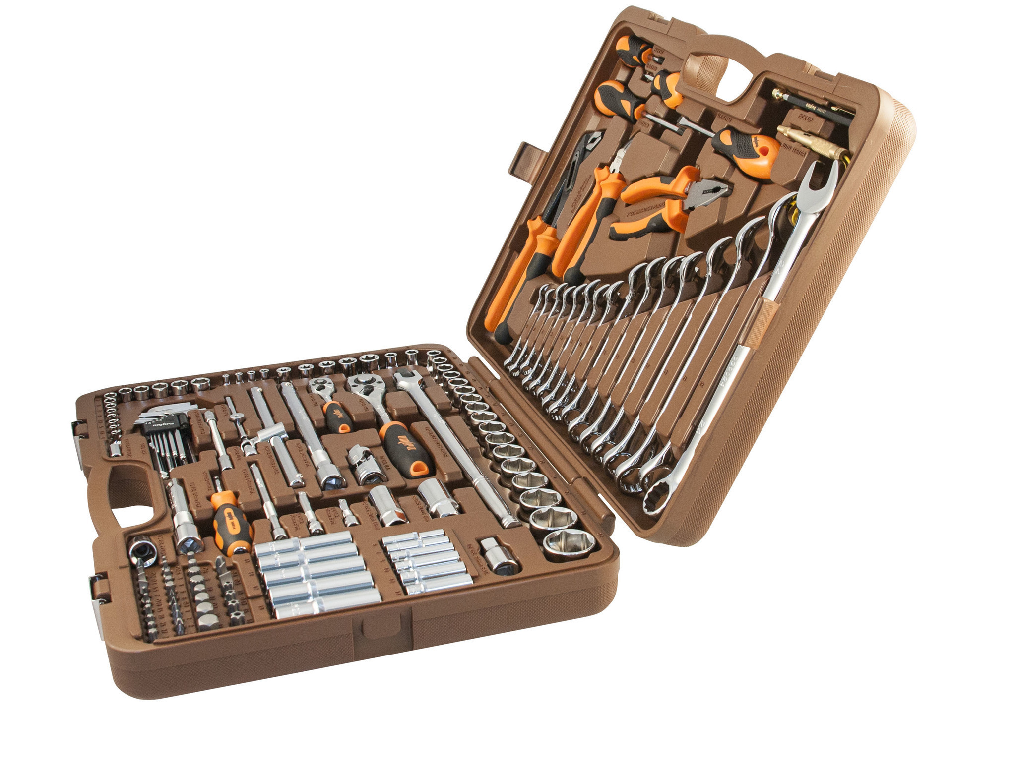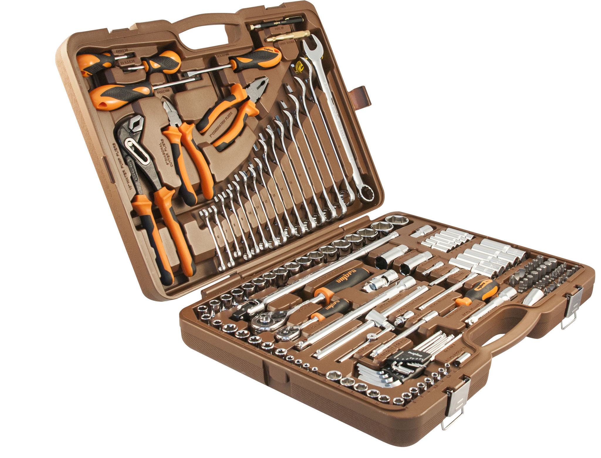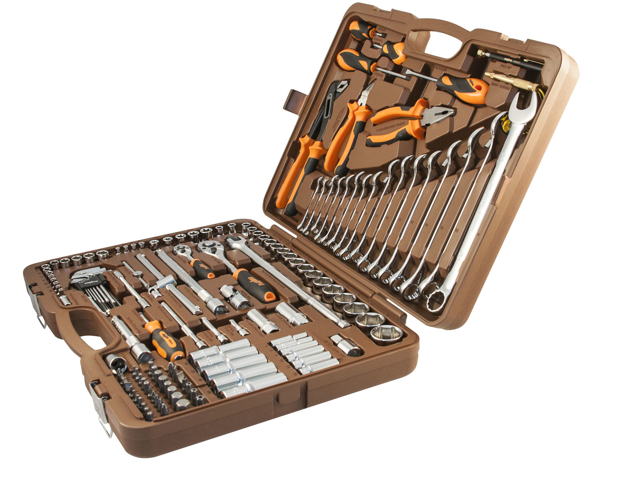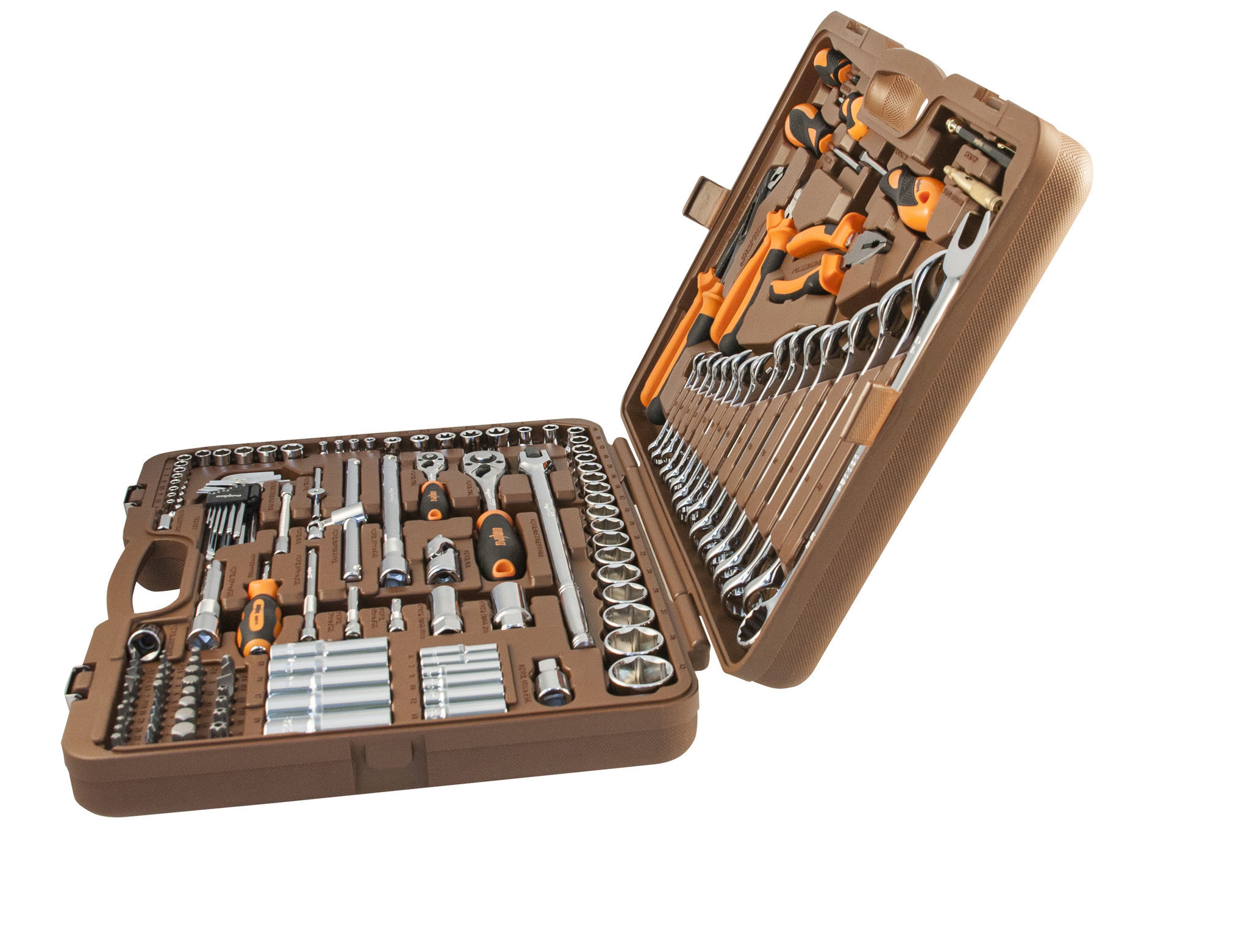 Головки торцевые 1/4''DR, 13 шт.: 4, 4.5, 5, 5.5, 6, 7, 8, 9, 10, 11, 12, 13, 14 мм; Головки торцевые глубокие 1/4''DR, 6 шт.: 6, 7, 8, 10, 12, 13 мм; Головки торцевые 1/4"DR, внешний TORX®, 4 шт.: E5, E6, E7, E8; Рукоятка трещоточная 1/4"DR, 72 зубца; Вороток Т-образный 1/4"DR, 120 мм; Рукоятка отверточная 1/4"DR; Удлинители, 3 шт.: 50, 75, 150 мм; Удлинитель гибкий 1/4"DR, 130 мм Шарнир карданный 1/4"DR; Адаптер для бит 1/4"; Вставка-бита 1/4"DR крестовая, 25 мм, 5шт.: PH0, PH1, PH2 х 2, PH3; Вставка-бита 1/4"DR POZIDRIVE®, 25 мм, 2 шт.: PZ1, PZ2; Вставка-бита 1/4"DR шлицевая, 25 мм, 3 шт.: SL4.0, SL5.5, SL7.0; Вставка-бита 1/4"DR шестигранная, 25 мм, 5 шт.: H2.5, H3, H4, H5, H6; Вставка-бита 1/4"DR T-TORX®, 25 мм, : Т10H, Т15H, Т20H, Т25H, Т27H, Т30H, Т40H; Головка торцевая 1/2"DR, 19 шт.: 8, 9, 10, 11, 12, 13, 14, 15, 16, 17, 18, 19, 21, 22, 23, 24, 27, 30, 32 мм; Головка торцевая глубокая 1/2"DR, 5 шт.: 13, 14, 17, 19, 22 мм; Головка торцевая 1/2"DR, внешний TORX®, 5 шт. E10, E12, E14, E16, E18 Головка торцевая свечная 1/2"DR, 2 шт.: 16, 21 мм; Рукоятка трещоточная 1/2"DR, 72 зубца; Вороток Т-образный 1/2"DR, 250 мм; Вороток шарнирный 1/2"DR, 380 мм; Удлинители, 3 шт.: 50, 125, 250 мм; Шарнир карданный 1/2"DR; Переходник для вставок-бит 1/2"DRx5/16"HDR; Вставка-бита 5/16"DR крестовая, 30 мм, 1 шт.: PH4; Вставка-бита 5/16"DR шлицевая, 30 мм, 2 шт.: SL8.0, SL10.0; Вставка-бита 5/16"DR шестигранная, 30 мм, 4 шт.: H8, H10, H12, H14; Вставка-бита 5/16"DR TAMPERPROOF TORX®, 30 мм: Т40H, Т45H, Т50H, Т55H; Вставка-бита 5/16"DR SPLINE, 30 мм: М6, М8, М10, М12; Ключи гаечные комбинированные, 16 шт.: 6, 7, 8, 9, 10, 11, 12, 13, 14, 15, 16, 17, 19, 21, 22, 24 мм; Набор ключей торцевых шестигранных с шаром H1.5-H10, 10 предметов; Отвертка стержневая шлицевая BASIC, 2 шт.: SL6.5х38, SL6.5х100; Отвертка стержневая крестовая BASIC, 2 шт.: РН2х38, РН2х100; Пассатижи 180 мм; Бокорезы 160 мм; Клещи переставные, 250 мм; Тестер электросистемы автомобиля 6-24V: Рукоятка телескопическая, магнитная, 640 мм; Пластиковый кейс.