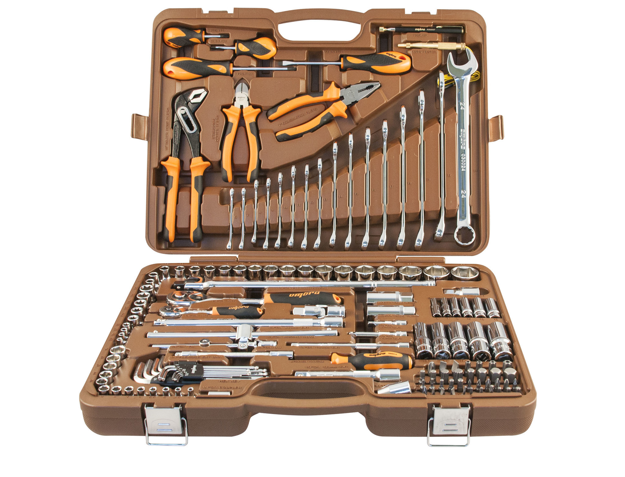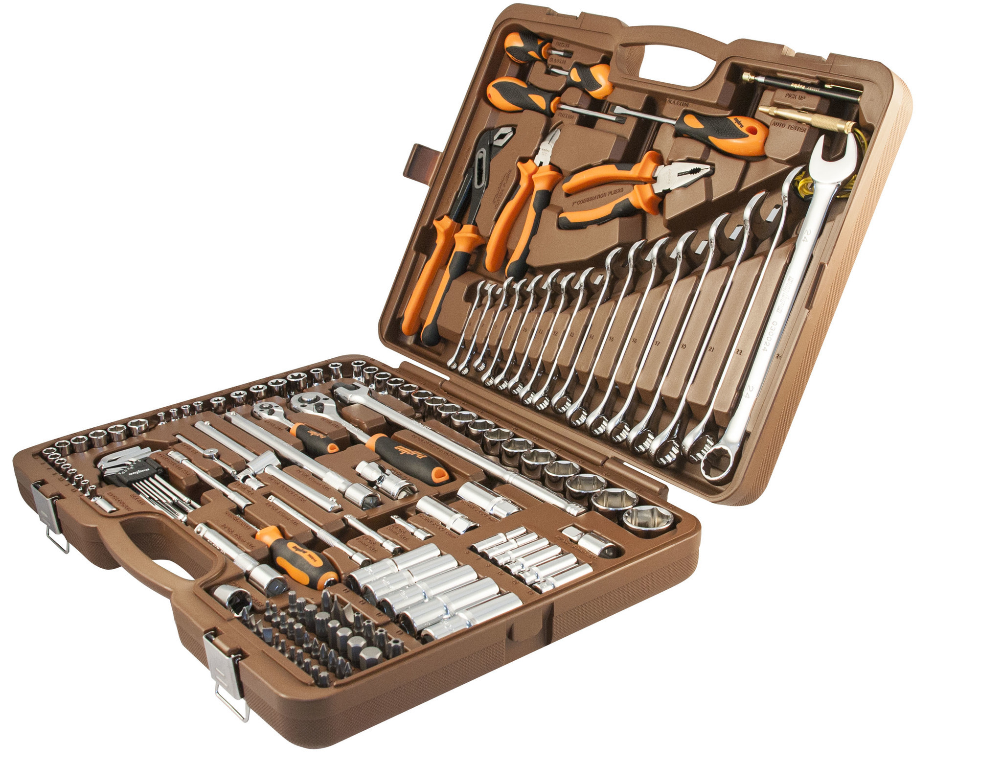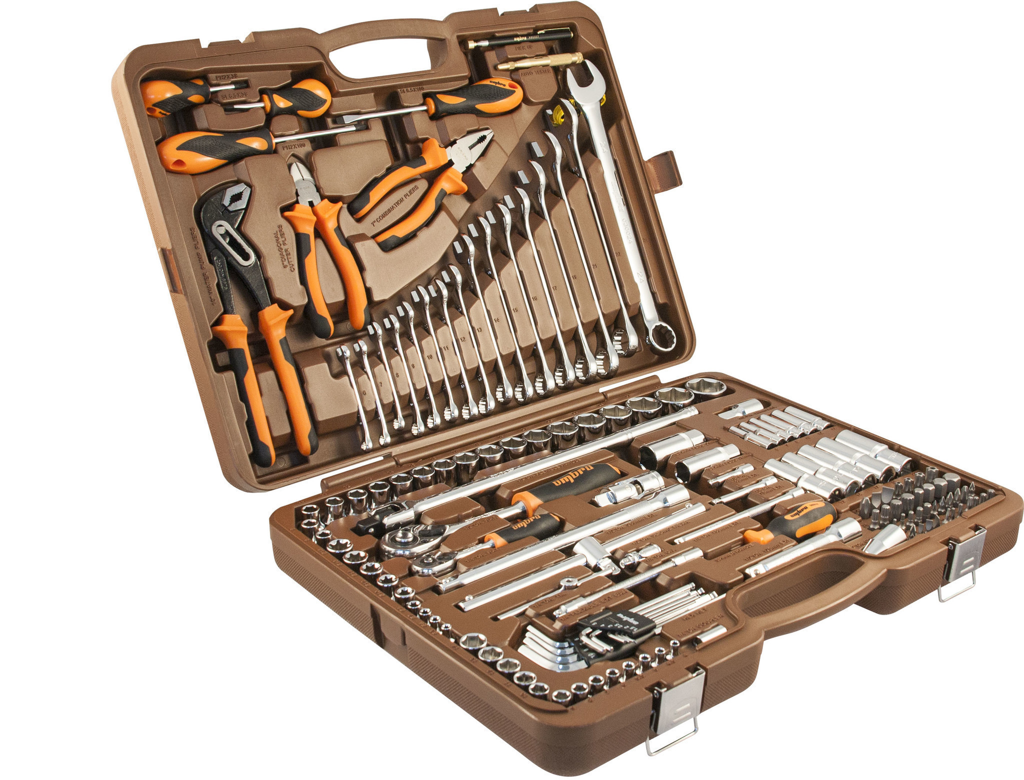 Головки торцевые 1/4''DR, 13 шт.: 4, 4.5, 5, 5.5, 6, 7, 8, 9, 10, 11, 12, 13, 14 мм; Головки торцевые глубокие 1/4''DR, 6 шт.: 6, 7, 8, 10, 12, 13 мм; Головки торцевые 1/4"DR, внешний TORX®, 4 шт.: E5, E6, E7, E8; Рукоятка трещоточная 1/4"DR, 72 зубца; Вороток Т-образный 1/4"DR, 120 мм; Рукоятка отверточная 1/4"DR; Удлинители, 3 шт.: 50, 75, 150 мм; Удлинитель гибкий 1/4"DR, 130 мм Шарнир карданный 1/4"DR; Адаптер для бит 1/4"; Вставка-бита 1/4"DR крестовая, 25 мм, 5шт.: PH0, PH1, PH2 х 2, PH3; Вставка-бита 1/4"DR POZIDRIVE®, 25 мм, 2 шт.: PZ1, PZ2; Вставка-бита 1/4"DR шлицевая, 25 мм, 3 шт.: SL4.0, SL5.5, SL7.0; Вставка-бита 1/4"DR шестигранная, 25 мм, 5 шт.: H2.5, H3, H4, H5, H6; Вставка-бита 1/4"DR T-TORX®, 25 мм, : Т10H, Т15H, Т20H, Т25H, Т27H, Т30H, Т40H; Головка торцевая 1/2"DR, 19 шт.: 8, 9, 10, 11, 12, 13, 14, 15, 16, 17, 18, 19, 21, 22, 23, 24, 27, 30, 32 мм; Головка торцевая глубокая 1/2"DR, 5 шт.: 13, 14, 17, 19, 22 мм; Головка торцевая 1/2"DR, внешний TORX®, 5 шт. E10, E12, E14, E16, E18 Головка торцевая свечная 1/2"DR, 2 шт.: 16, 21 мм; Рукоятка трещоточная 1/2"DR, 72 зубца; Вороток Т-образный 1/2"DR, 250 мм; Вороток шарнирный 1/2"DR, 380 мм; Удлинители, 3 шт.: 50, 125, 250 мм; Шарнир карданный 1/2"DR; Переходник для вставок-бит 1/2"DRx5/16"HDR; Вставка-бита 5/16"DR крестовая, 30 мм, 1 шт.: PH4; Вставка-бита 5/16"DR шлицевая, 30 мм, 2 шт.: SL8.0, SL10.0; Вставка-бита 5/16"DR шестигранная, 30 мм, 4 шт.: H8, H10, H12, H14; Вставка-бита 5/16"DR TAMPERPROOF TORX®, 30 мм: Т40H, Т45H, Т50H, Т55H; Вставка-бита 5/16"DR SPLINE, 30 мм: М6, М8, М10, М12; Ключи гаечные комбинированные, 16 шт.: 6, 7, 8, 9, 10, 11, 12, 13, 14, 15, 16, 17, 19, 21, 22, 24 мм; Набор ключей торцевых шестигранных с шаром H1.5-H10, 10 предметов; Отвертка стержневая шлицевая BASIC, 2 шт.: SL6.5х38, SL6.5х100; Отвертка стержневая крестовая BASIC, 2 шт.: РН2х38, РН2х100; Пассатижи 180 мм; Бокорезы 160 мм; Клещи переставные, 250 мм; Тестер электросистемы автомобиля 6-24V: Рукоятка телескопическая, магнитная, 640 мм; Пластиковый кейс.