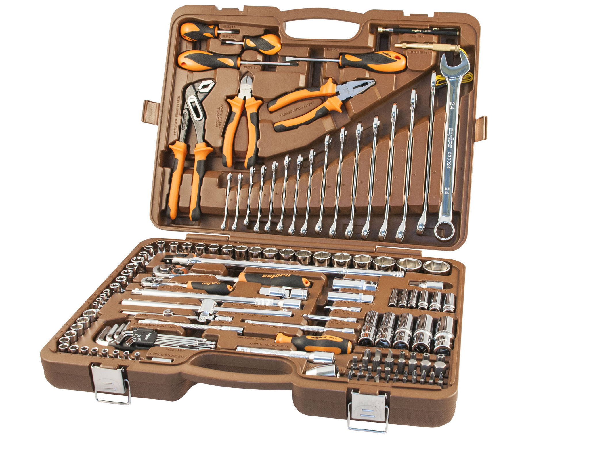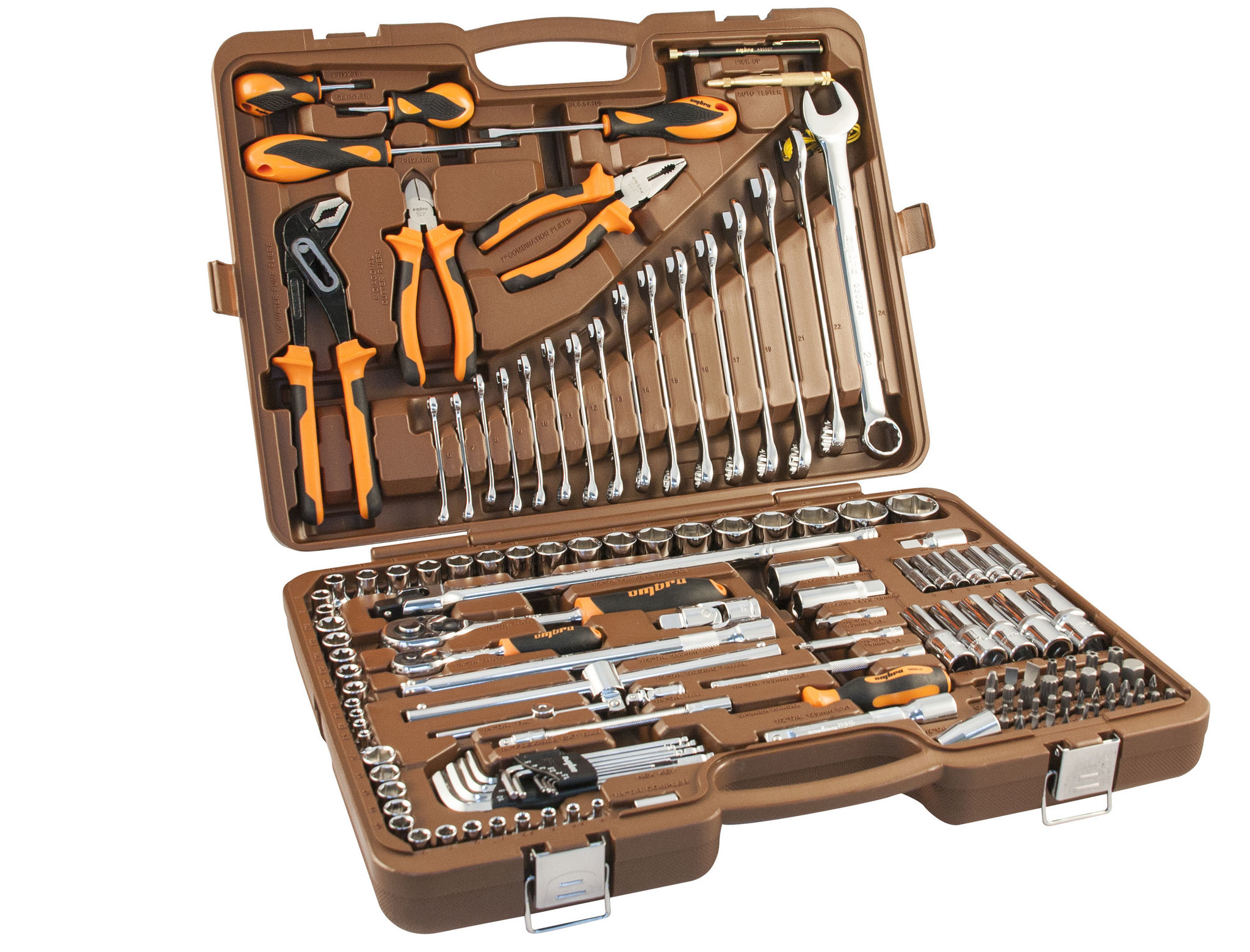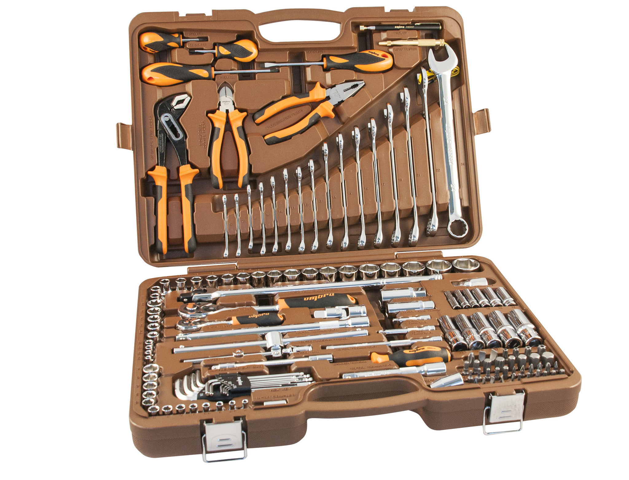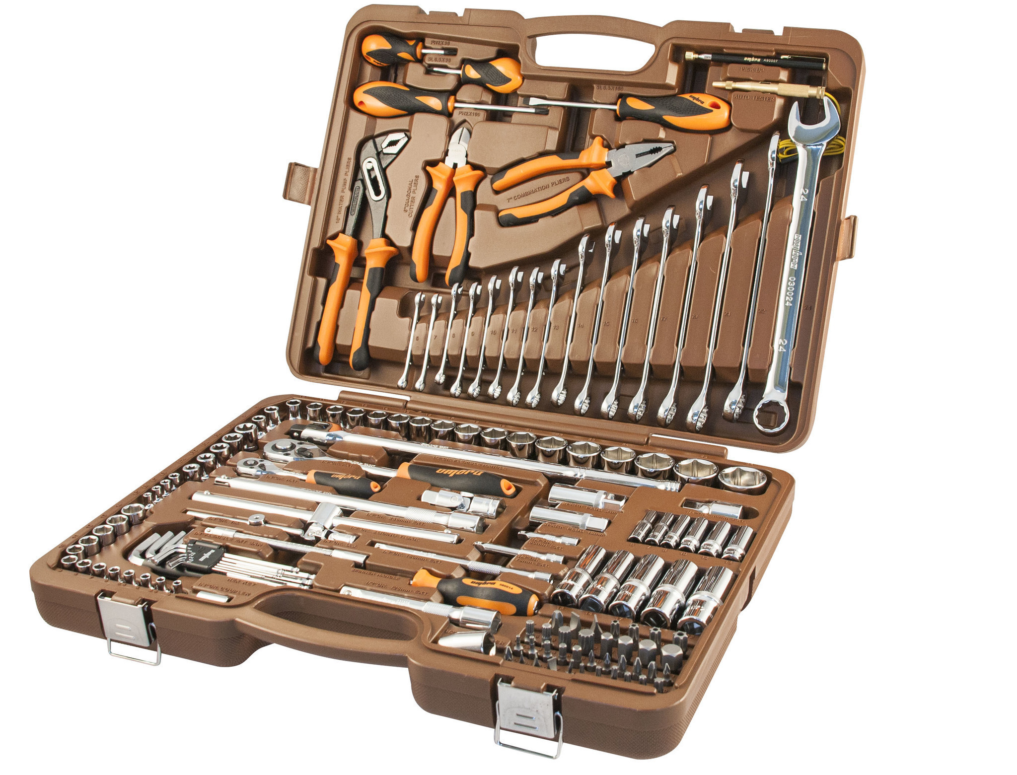 Головки торцевые 1/4''DR, 13 шт.: 4, 4.5, 5, 5.5, 6, 7, 8, 9, 10, 11, 12, 13, 14 мм; Головки торцевые глубокие 1/4''DR, 6 шт.: 6, 7, 8, 10, 12, 13 мм; Головки торцевые 1/4"DR, внешний TORX®, 4 шт.: E5, E6, E7, E8; Рукоятка трещоточная 1/4"DR, 72 зубца; Вороток Т-образный 1/4"DR, 120 мм; Рукоятка отверточная 1/4"DR; Удлинители, 3 шт.: 50, 75, 150 мм; Удлинитель гибкий 1/4"DR, 130 мм Шарнир карданный 1/4"DR; Адаптер для бит 1/4"; Вставка-бита 1/4"DR крестовая, 25 мм, 5шт.: PH0, PH1, PH2 х 2, PH3; Вставка-бита 1/4"DR POZIDRIVE®, 25 мм, 2 шт.: PZ1, PZ2; Вставка-бита 1/4"DR шлицевая, 25 мм, 3 шт.: SL4.0, SL5.5, SL7.0; Вставка-бита 1/4"DR шестигранная, 25 мм, 5 шт.: H2.5, H3, H4, H5, H6; Вставка-бита 1/4"DR T-TORX®, 25 мм, : Т10H, Т15H, Т20H, Т25H, Т27H, Т30H, Т40H; Головка торцевая 1/2"DR, 19 шт.: 8, 9, 10, 11, 12, 13, 14, 15, 16, 17, 18, 19, 21, 22, 23, 24, 27, 30, 32 мм; Головка торцевая глубокая 1/2"DR, 5 шт.: 13, 14, 17, 19, 22 мм; Головка торцевая 1/2"DR, внешний TORX®, 5 шт. E10, E12, E14, E16, E18 Головка торцевая свечная 1/2"DR, 2 шт.: 16, 21 мм; Рукоятка трещоточная 1/2"DR, 72 зубца; Вороток Т-образный 1/2"DR, 250 мм; Вороток шарнирный 1/2"DR, 380 мм; Удлинители, 3 шт.: 50, 125, 250 мм; Шарнир карданный 1/2"DR; Переходник для вставок-бит 1/2"DRx5/16"HDR; Вставка-бита 5/16"DR крестовая, 30 мм, 1 шт.: PH4; Вставка-бита 5/16"DR шлицевая, 30 мм, 2 шт.: SL8.0, SL10.0; Вставка-бита 5/16"DR шестигранная, 30 мм, 4 шт.: H8, H10, H12, H14; Вставка-бита 5/16"DR TAMPERPROOF TORX®, 30 мм: Т40H, Т45H, Т50H, Т55H; Вставка-бита 5/16"DR SPLINE, 30 мм: М6, М8, М10, М12; Ключи гаечные комбинированные, 16 шт.: 6, 7, 8, 9, 10, 11, 12, 13, 14, 15, 16, 17, 19, 21, 22, 24 мм; Набор ключей торцевых шестигранных с шаром H1.5-H10, 10 предметов; Отвертка стержневая шлицевая BASIC, 2 шт.: SL6.5х38, SL6.5х100; Отвертка стержневая крестовая BASIC, 2 шт.: РН2х38, РН2х100; Пассатижи 180 мм; Бокорезы 160 мм; Клещи переставные, 250 мм; Тестер электросистемы автомобиля 6-24V: Рукоятка телескопическая, магнитная, 640 мм; Пластиковый кейс.