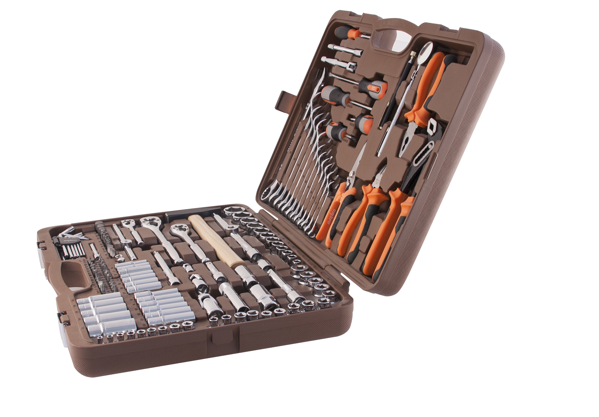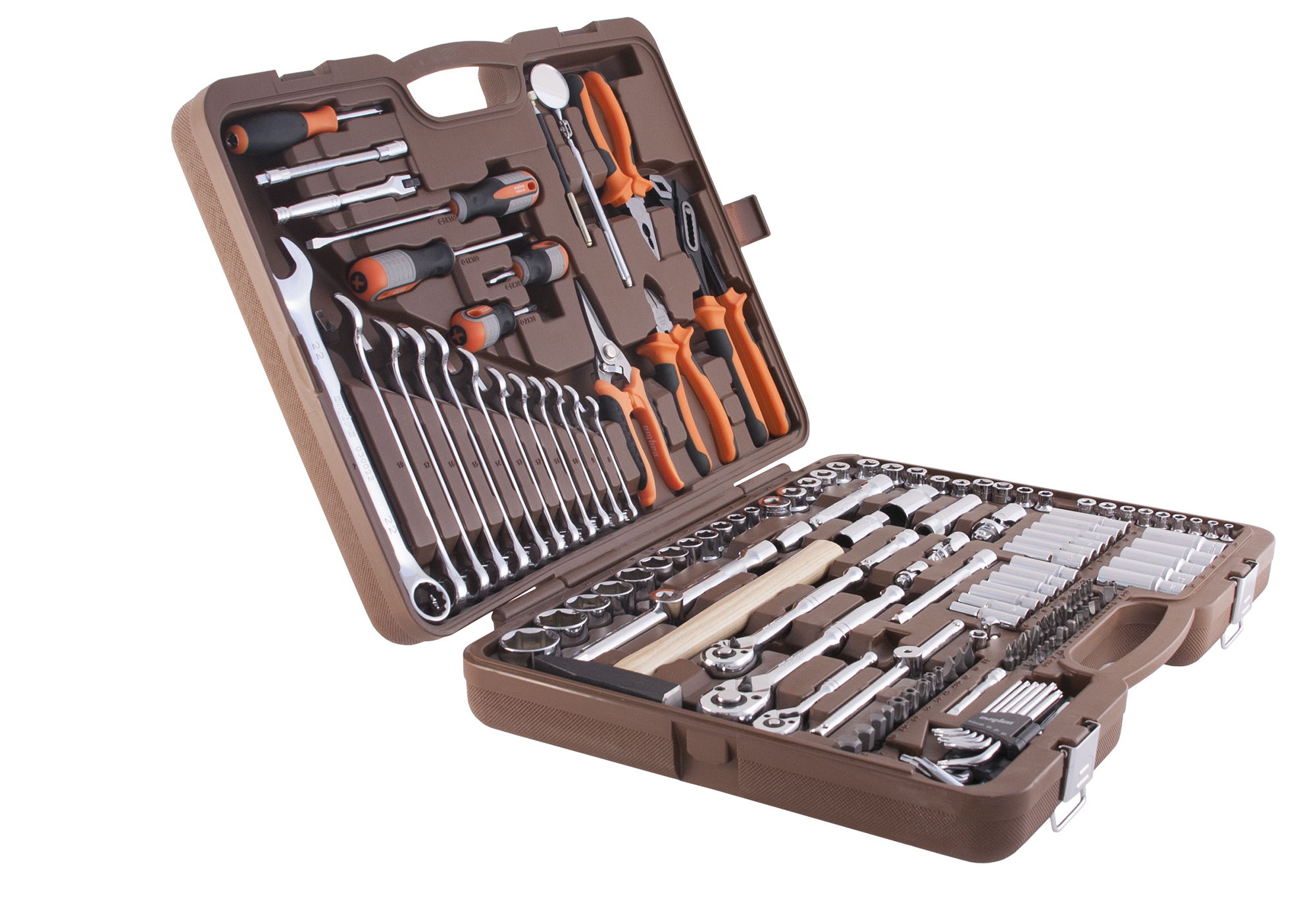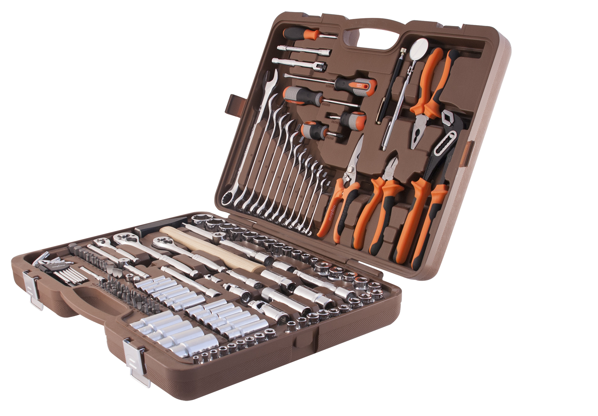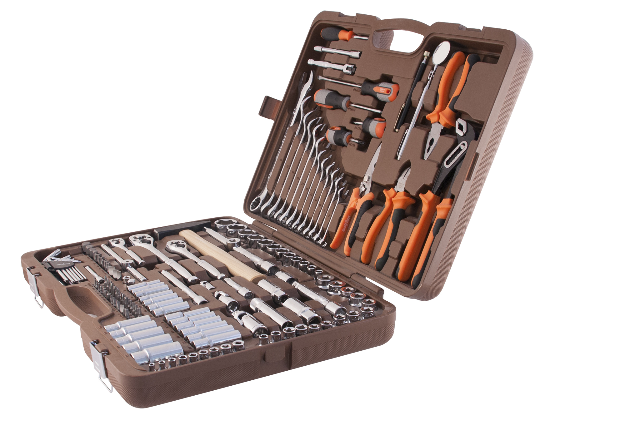 Головки торцевые 1/4''DR, 9 шт.: 4, 5, 6, 7, 8, 9, 10, 11, 12 мм; Головки торцевые глубокие 1/4''DR, 7 шт.: 6, 7, 8, 9, 10, 11, 12 мм; Рукоятка трещоточная 1/4"DR, 72 зубца; Шарнир карданный 1/4"DR; Вороток шарнирный 1/4”DR, 150 мм; Удлинитель гибкий 1/4"DR, 150 мм; Удлинитель 1/4"DR, 75 мм; Переходник 1/4"DR(F)*3/8"DR(M); Рукоятка отверточная 1/4"DR; Переходник для вставок-бит 1/4"DR*1/4"HDR; Вставки-биты крестовые (PH) 1/4"HDR, 25 мм, 5 шт.: PH0, PH1, PH2, PH3, PH4; Вставки-биты POZIDRIV® (PZ) 1/4"HDR, 25 мм, 5 шт.: PZ0, PZ1, PZ2, PZ3, PZ4; Вставки-биты TORX® (T) 1/4"HDR, 25 мм, 6 шт.: T10, T15, T20, T25, T27, T30; Вставки-биты шестигранные (H) 1/4"HDR, 25 мм, 7 шт.: H1.5, H2, H2.5, H3, H4, H5, H6 мм; Вставки-биты шлицевые (SL) 1/4"HDR, 25 мм, 7 шт.: SL3, SL4, SL4.5, SL5, SL5.5, SL6, SL7 мм; Головки торцевые 3/8''DR, 14 шт.: 8, 9, 10, 11, 12, 13, 14, 15, 16, 17, 18, 19, 21, 22 мм; Головки торцевые глубокие 3/8''DR, 11 шт.: 8, 9, 10, 11, 12, 13, 14, 15, 17, 19, 22 мм; Головки торцевые свечные 3/8"DR, 2 шт.: 14, 16 мм; Рукоятка трещоточная 3/8"DR, 72 зубца; Шарнир карданный 3/8"DR; Вороток Т-образный 3/8"DR, 200 мм; Удлинители 3/8"DR, 2 шт.: 75, 150 мм; Переходник 3/8"DR(F)*1/4"DR(M); Переходник 3/8"DR(F)*1/2"DR(M); Головки торцевые 1/2''DR, 12 шт.: 8, 10, 12, 13, 14, 17, 19, 21, 22, 24, 27, 30 мм; Головка торцевая свечная 1/2"DR, 21 мм; Рукоятка трещоточная 1/2"DR, 72 зубца; Шарнир карданный 1/2"DR; Удлинители 1/2"DR, 2 шт.: 125, 250 мм; Переходник для вставок-бит 1/2"DR*5/16"HDR; Биты 5/16" TORX TAMPER RESISTANT, 30 мм, 5 шт.: T40, T45, T50, T55, T60; Вставки-биты шлицевые (SL) 5/16"HDR, 30 мм., 3 шт.: SL8, SL10, SL12; Вставки-биты шестигранные (H) 5/16"HDR, 30 мм., 4 шт.: H8, H10, H12, H14; Ключи гаечные комбинированные, 12 шт.: 8, 9, 10, 11, 12, 13, 14, 15, 16, 17, 19, 22 мм; Набор ключей торцевых TORX® Т10-T50, 9 предметов; Пассатижи, 160 мм; Бокорезы, 160 мм; Молоток с деревянной рукояткой 300 гр.; Ножницы универсальные, 175 мм; Клещи переставные, 250 мм; Отвертки стрежневые крестовые ROUND GRIP, 2 шт.: PH1x100, PH2x38 мм; Отвертки стрежневые шлицевые ROUND GRIP, 2 шт.: SL5x150, SL6x38 мм; Рукоятка телескопическая, магнитная, 640 мм; Зеркало телескопическое с магнитом, Ø-38 мм; Кейс пластиковый.