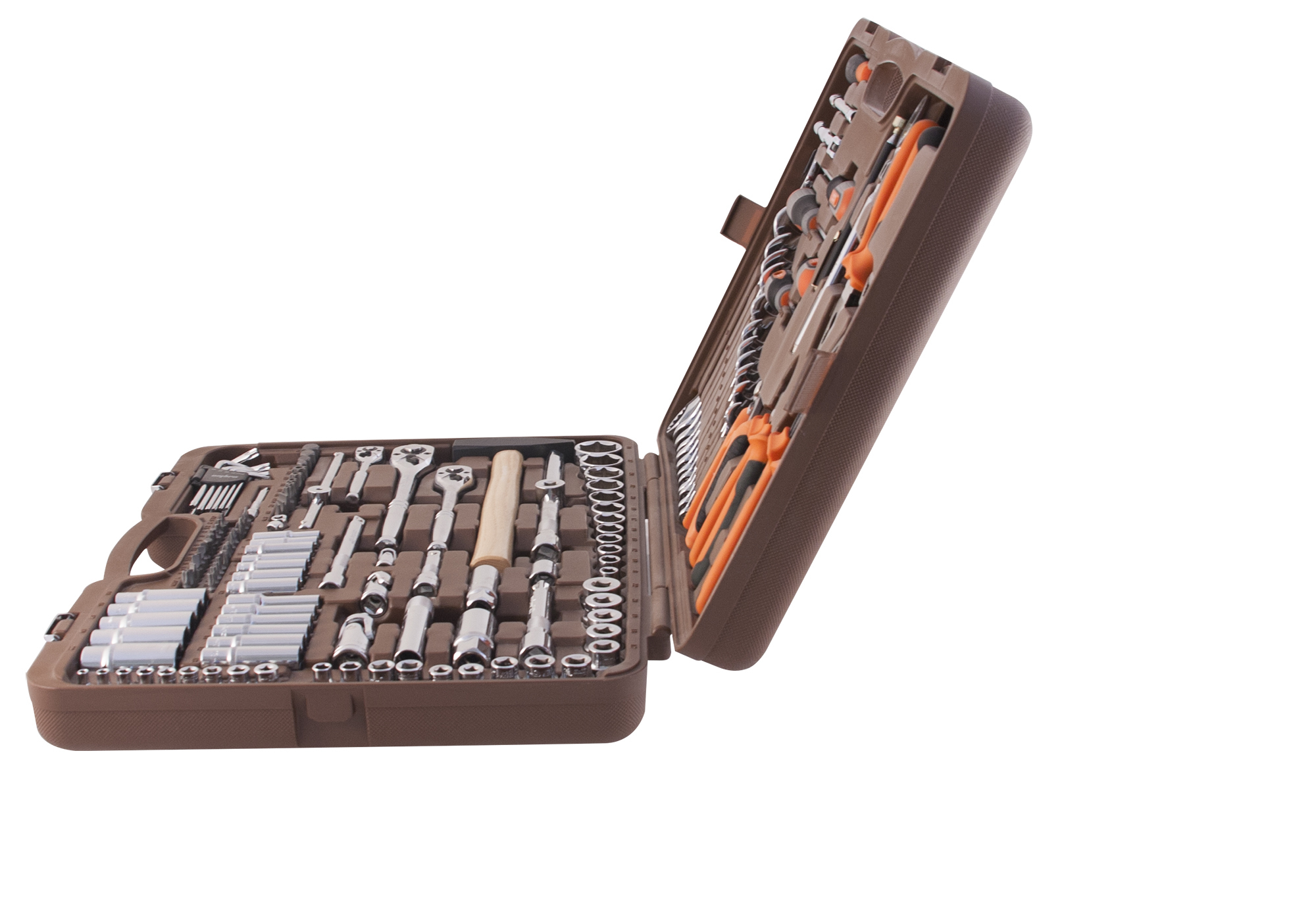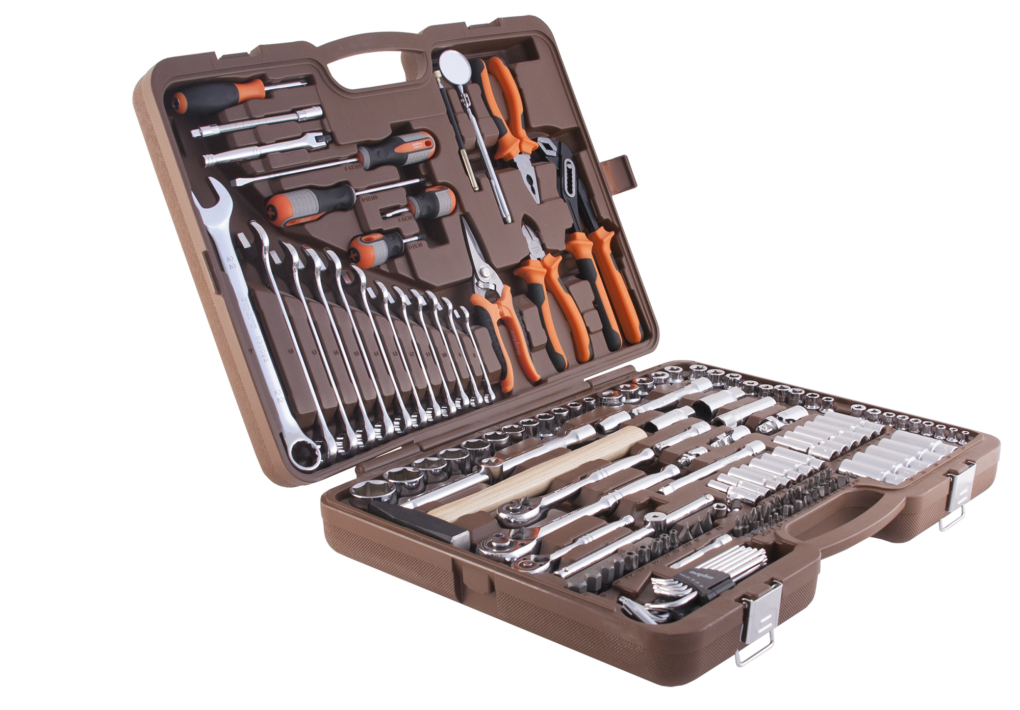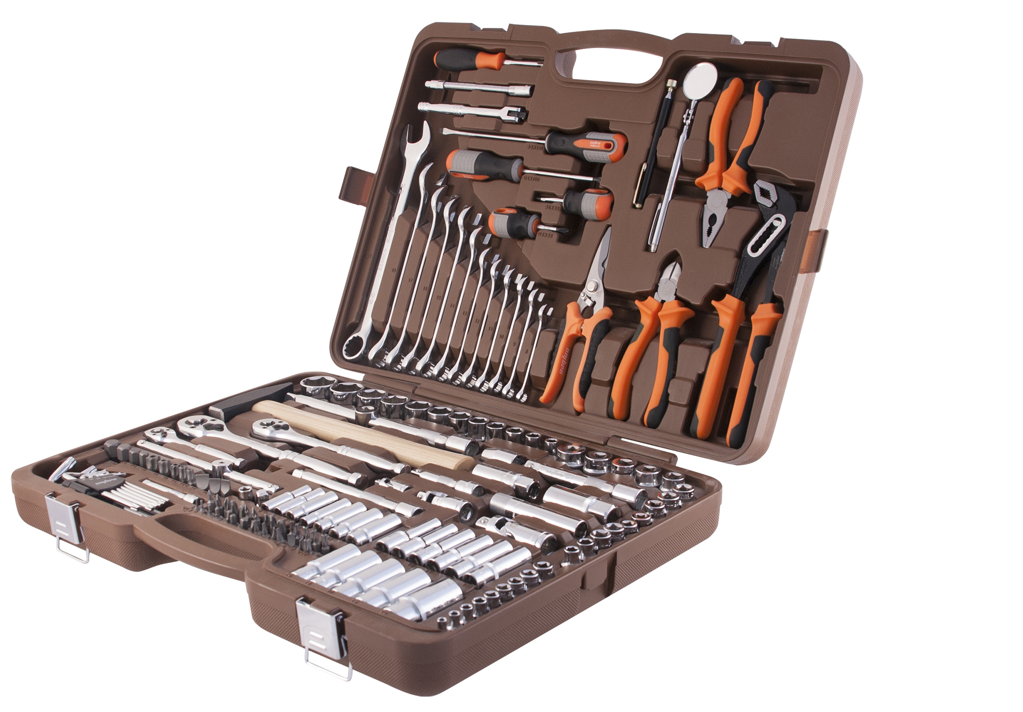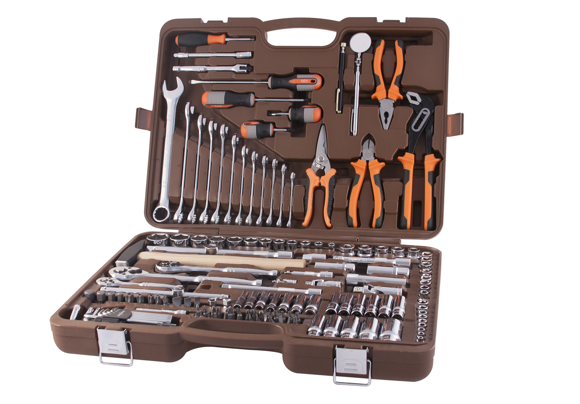 Головки торцевые 1/4''DR, 9 шт.: 4, 5, 6, 7, 8, 9, 10, 11, 12 мм; Головки торцевые глубокие 1/4''DR, 7 шт.: 6, 7, 8, 9, 10, 11, 12 мм; Рукоятка трещоточная 1/4"DR, 72 зубца; Шарнир карданный 1/4"DR; Вороток шарнирный 1/4”DR, 150 мм; Удлинитель гибкий 1/4"DR, 150 мм; Удлинитель 1/4"DR, 75 мм; Переходник 1/4"DR(F)*3/8"DR(M); Рукоятка отверточная 1/4"DR; Переходник для вставок-бит 1/4"DR*1/4"HDR; Вставки-биты крестовые (PH) 1/4"HDR, 25 мм, 5 шт.: PH0, PH1, PH2, PH3, PH4; Вставки-биты POZIDRIV® (PZ) 1/4"HDR, 25 мм, 5 шт.: PZ0, PZ1, PZ2, PZ3, PZ4; Вставки-биты TORX® (T) 1/4"HDR, 25 мм, 6 шт.: T10, T15, T20, T25, T27, T30; Вставки-биты шестигранные (H) 1/4"HDR, 25 мм, 7 шт.: H1.5, H2, H2.5, H3, H4, H5, H6 мм; Вставки-биты шлицевые (SL) 1/4"HDR, 25 мм, 7 шт.: SL3, SL4, SL4.5, SL5, SL5.5, SL6, SL7 мм; Головки торцевые 3/8''DR, 14 шт.: 8, 9, 10, 11, 12, 13, 14, 15, 16, 17, 18, 19, 21, 22 мм; Головки торцевые глубокие 3/8''DR, 11 шт.: 8, 9, 10, 11, 12, 13, 14, 15, 17, 19, 22 мм; Головки торцевые свечные 3/8"DR, 2 шт.: 14, 16 мм; Рукоятка трещоточная 3/8"DR, 72 зубца; Шарнир карданный 3/8"DR; Вороток Т-образный 3/8"DR, 200 мм; Удлинители 3/8"DR, 2 шт.: 75, 150 мм; Переходник 3/8"DR(F)*1/4"DR(M); Переходник 3/8"DR(F)*1/2"DR(M); Головки торцевые 1/2''DR, 12 шт.: 8, 10, 12, 13, 14, 17, 19, 21, 22, 24, 27, 30 мм; Головка торцевая свечная 1/2"DR, 21 мм; Рукоятка трещоточная 1/2"DR, 72 зубца; Шарнир карданный 1/2"DR; Удлинители 1/2"DR, 2 шт.: 125, 250 мм; Переходник для вставок-бит 1/2"DR*5/16"HDR; Биты 5/16" TORX TAMPER RESISTANT, 30 мм, 5 шт.: T40, T45, T50, T55, T60; Вставки-биты шлицевые (SL) 5/16"HDR, 30 мм., 3 шт.: SL8, SL10, SL12; Вставки-биты шестигранные (H) 5/16"HDR, 30 мм., 4 шт.: H8, H10, H12, H14; Ключи гаечные комбинированные, 12 шт.: 8, 9, 10, 11, 12, 13, 14, 15, 16, 17, 19, 22 мм; Набор ключей торцевых TORX® Т10-T50, 9 предметов; Пассатижи, 160 мм; Бокорезы, 160 мм; Молоток с деревянной рукояткой 300 гр.; Ножницы универсальные, 175 мм; Клещи переставные, 250 мм; Отвертки стрежневые крестовые ROUND GRIP, 2 шт.: PH1x100, PH2x38 мм; Отвертки стрежневые шлицевые ROUND GRIP, 2 шт.: SL5x150, SL6x38 мм; Рукоятка телескопическая, магнитная, 640 мм; Зеркало телескопическое с магнитом, Ø-38 мм; Кейс пластиковый.