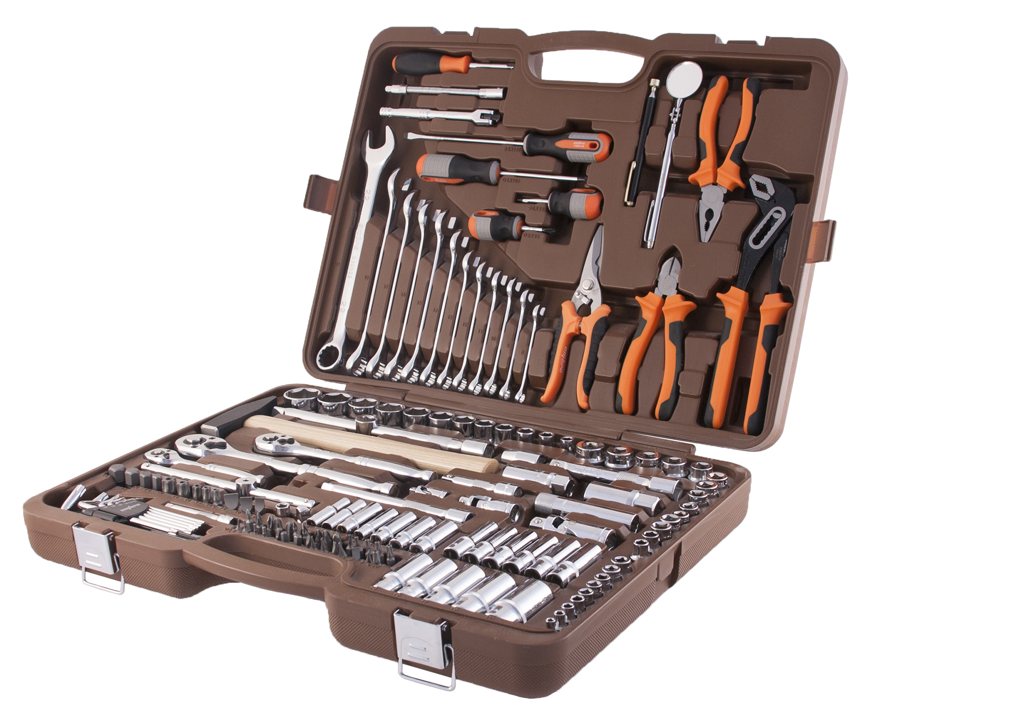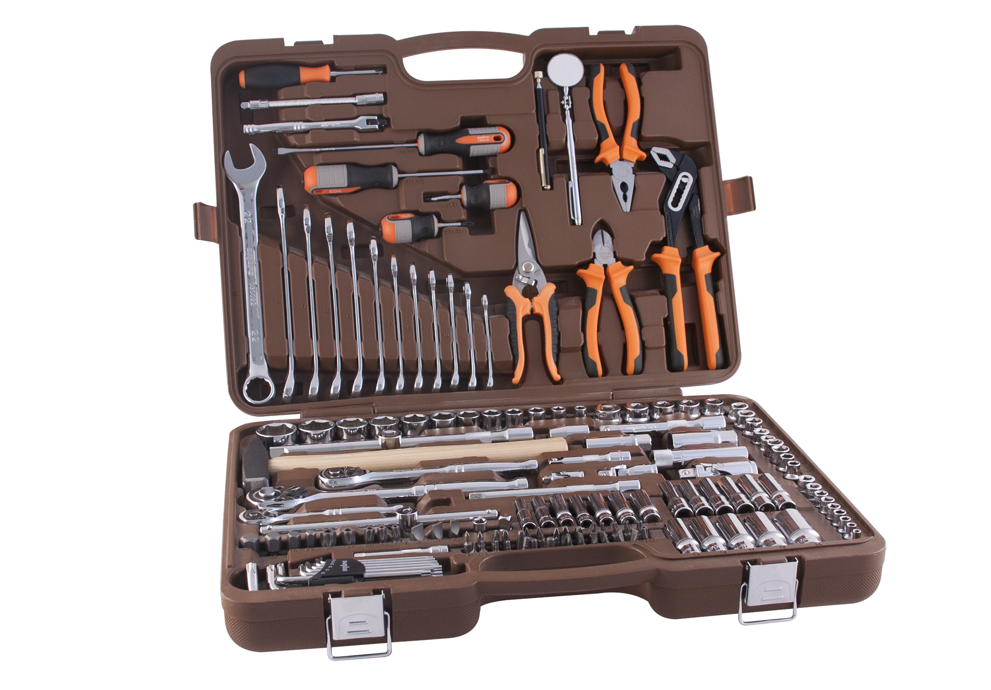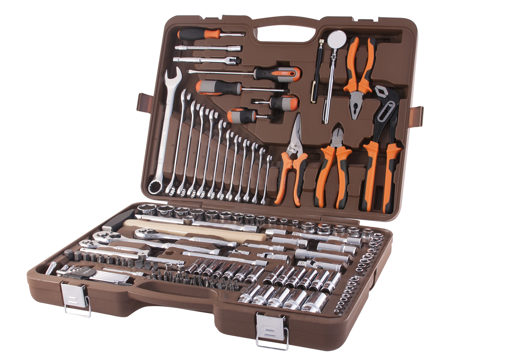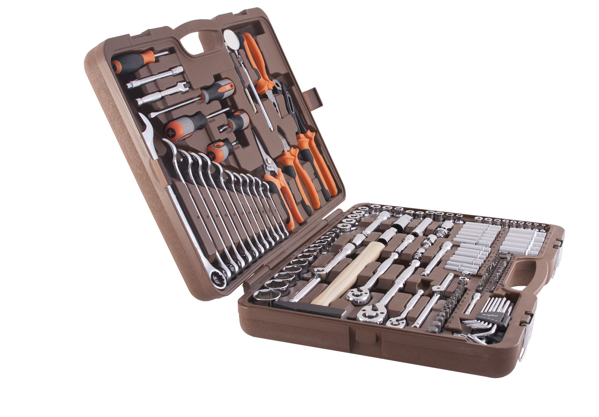 Головки торцевые 1/4''DR, 9 шт.: 4, 5, 6, 7, 8, 9, 10, 11, 12 мм; Головки торцевые глубокие 1/4''DR, 7 шт.: 6, 7, 8, 9, 10, 11, 12 мм; Рукоятка трещоточная 1/4"DR, 72 зубца; Шарнир карданный 1/4"DR; Вороток шарнирный 1/4”DR, 150 мм; Удлинитель гибкий 1/4"DR, 150 мм; Удлинитель 1/4"DR, 75 мм; Переходник 1/4"DR(F)*3/8"DR(M); Рукоятка отверточная 1/4"DR; Переходник для вставок-бит 1/4"DR*1/4"HDR; Вставки-биты крестовые (PH) 1/4"HDR, 25 мм, 5 шт.: PH0, PH1, PH2, PH3, PH4; Вставки-биты POZIDRIV® (PZ) 1/4"HDR, 25 мм, 5 шт.: PZ0, PZ1, PZ2, PZ3, PZ4; Вставки-биты TORX® (T) 1/4"HDR, 25 мм, 6 шт.: T10, T15, T20, T25, T27, T30; Вставки-биты шестигранные (H) 1/4"HDR, 25 мм, 7 шт.: H1.5, H2, H2.5, H3, H4, H5, H6 мм; Вставки-биты шлицевые (SL) 1/4"HDR, 25 мм, 7 шт.: SL3, SL4, SL4.5, SL5, SL5.5, SL6, SL7 мм; Головки торцевые 3/8''DR, 14 шт.: 8, 9, 10, 11, 12, 13, 14, 15, 16, 17, 18, 19, 21, 22 мм; Головки торцевые глубокие 3/8''DR, 11 шт.: 8, 9, 10, 11, 12, 13, 14, 15, 17, 19, 22 мм; Головки торцевые свечные 3/8"DR, 2 шт.: 14, 16 мм; Рукоятка трещоточная 3/8"DR, 72 зубца; Шарнир карданный 3/8"DR; Вороток Т-образный 3/8"DR, 200 мм; Удлинители 3/8"DR, 2 шт.: 75, 150 мм; Переходник 3/8"DR(F)*1/4"DR(M); Переходник 3/8"DR(F)*1/2"DR(M); Головки торцевые 1/2''DR, 12 шт.: 8, 10, 12, 13, 14, 17, 19, 21, 22, 24, 27, 30 мм; Головка торцевая свечная 1/2"DR, 21 мм; Рукоятка трещоточная 1/2"DR, 72 зубца; Шарнир карданный 1/2"DR; Удлинители 1/2"DR, 2 шт.: 125, 250 мм; Переходник для вставок-бит 1/2"DR*5/16"HDR; Биты 5/16" TORX TAMPER RESISTANT, 30 мм, 5 шт.: T40, T45, T50, T55, T60; Вставки-биты шлицевые (SL) 5/16"HDR, 30 мм., 3 шт.: SL8, SL10, SL12; Вставки-биты шестигранные (H) 5/16"HDR, 30 мм., 4 шт.: H8, H10, H12, H14; Ключи гаечные комбинированные, 12 шт.: 8, 9, 10, 11, 12, 13, 14, 15, 16, 17, 19, 22 мм; Набор ключей торцевых TORX® Т10-T50, 9 предметов; Пассатижи, 160 мм; Бокорезы, 160 мм; Молоток с деревянной рукояткой 300 гр.; Ножницы универсальные, 175 мм; Клещи переставные, 250 мм; Отвертки стрежневые крестовые ROUND GRIP, 2 шт.: PH1x100, PH2x38 мм; Отвертки стрежневые шлицевые ROUND GRIP, 2 шт.: SL5x150, SL6x38 мм; Рукоятка телескопическая, магнитная, 640 мм; Зеркало телескопическое с магнитом, Ø-38 мм; Кейс пластиковый.