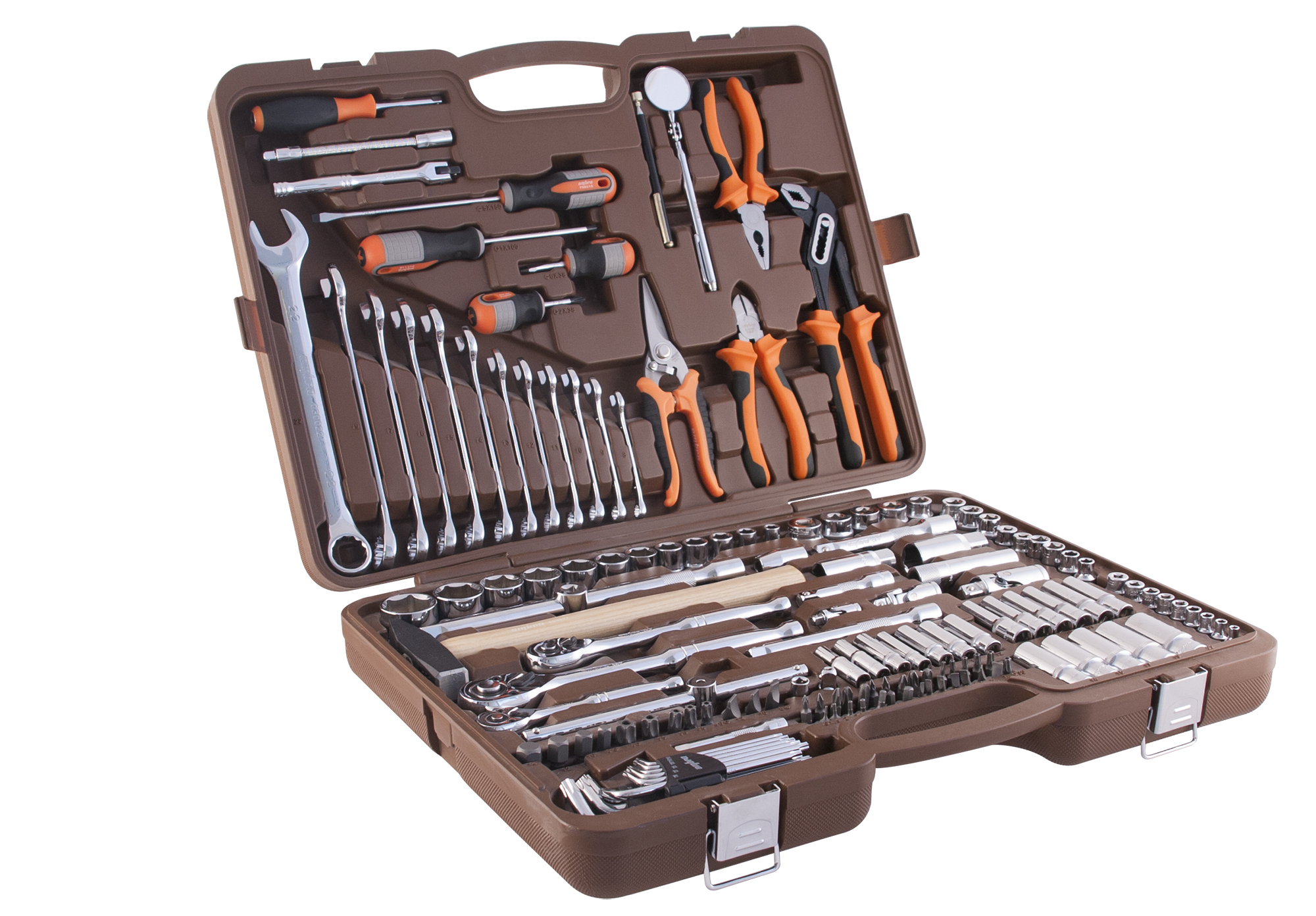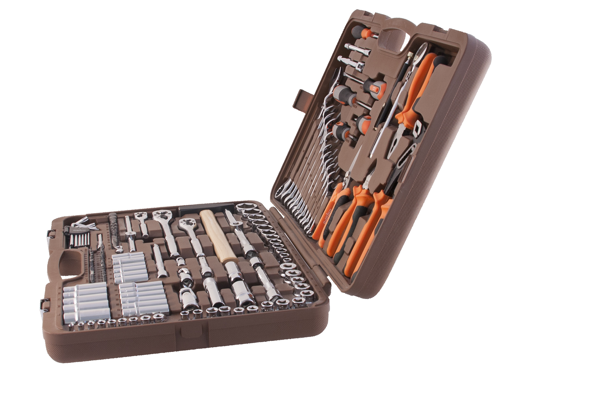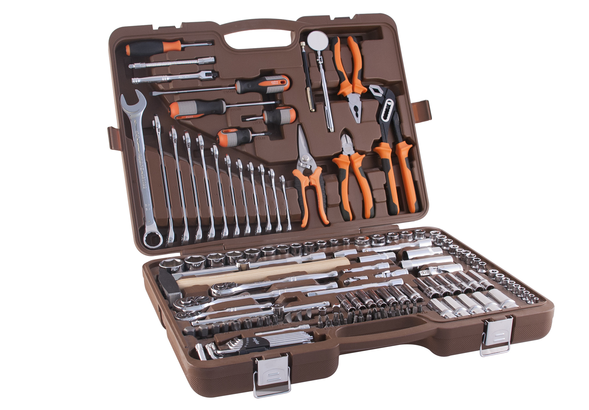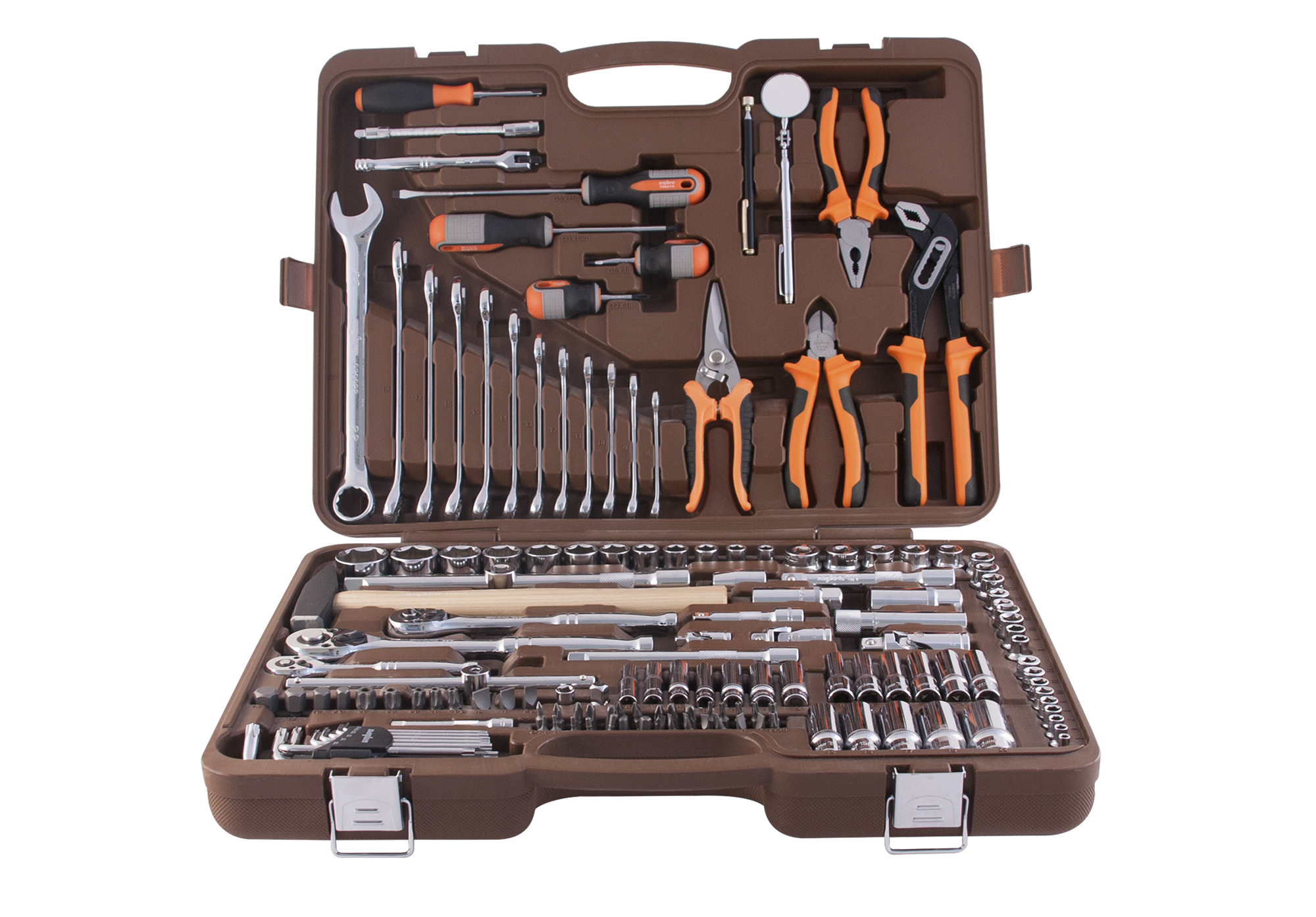 Головки торцевые 1/4''DR, 9 шт.: 4, 5, 6, 7, 8, 9, 10, 11, 12 мм; Головки торцевые глубокие 1/4''DR, 7 шт.: 6, 7, 8, 9, 10, 11, 12 мм; Рукоятка трещоточная 1/4"DR, 72 зубца; Шарнир карданный 1/4"DR; Вороток шарнирный 1/4”DR, 150 мм; Удлинитель гибкий 1/4"DR, 150 мм; Удлинитель 1/4"DR, 75 мм; Переходник 1/4"DR(F)*3/8"DR(M); Рукоятка отверточная 1/4"DR; Переходник для вставок-бит 1/4"DR*1/4"HDR; Вставки-биты крестовые (PH) 1/4"HDR, 25 мм, 5 шт.: PH0, PH1, PH2, PH3, PH4; Вставки-биты POZIDRIV® (PZ) 1/4"HDR, 25 мм, 5 шт.: PZ0, PZ1, PZ2, PZ3, PZ4; Вставки-биты TORX® (T) 1/4"HDR, 25 мм, 6 шт.: T10, T15, T20, T25, T27, T30; Вставки-биты шестигранные (H) 1/4"HDR, 25 мм, 7 шт.: H1.5, H2, H2.5, H3, H4, H5, H6 мм; Вставки-биты шлицевые (SL) 1/4"HDR, 25 мм, 7 шт.: SL3, SL4, SL4.5, SL5, SL5.5, SL6, SL7 мм; Головки торцевые 3/8''DR, 14 шт.: 8, 9, 10, 11, 12, 13, 14, 15, 16, 17, 18, 19, 21, 22 мм; Головки торцевые глубокие 3/8''DR, 11 шт.: 8, 9, 10, 11, 12, 13, 14, 15, 17, 19, 22 мм; Головки торцевые свечные 3/8"DR, 2 шт.: 14, 16 мм; Рукоятка трещоточная 3/8"DR, 72 зубца; Шарнир карданный 3/8"DR; Вороток Т-образный 3/8"DR, 200 мм; Удлинители 3/8"DR, 2 шт.: 75, 150 мм; Переходник 3/8"DR(F)*1/4"DR(M); Переходник 3/8"DR(F)*1/2"DR(M); Головки торцевые 1/2''DR, 12 шт.: 8, 10, 12, 13, 14, 17, 19, 21, 22, 24, 27, 30 мм; Головка торцевая свечная 1/2"DR, 21 мм; Рукоятка трещоточная 1/2"DR, 72 зубца; Шарнир карданный 1/2"DR; Удлинители 1/2"DR, 2 шт.: 125, 250 мм; Переходник для вставок-бит 1/2"DR*5/16"HDR; Биты 5/16" TORX TAMPER RESISTANT, 30 мм, 5 шт.: T40, T45, T50, T55, T60; Вставки-биты шлицевые (SL) 5/16"HDR, 30 мм., 3 шт.: SL8, SL10, SL12; Вставки-биты шестигранные (H) 5/16"HDR, 30 мм., 4 шт.: H8, H10, H12, H14; Ключи гаечные комбинированные, 12 шт.: 8, 9, 10, 11, 12, 13, 14, 15, 16, 17, 19, 22 мм; Набор ключей торцевых TORX® Т10-T50, 9 предметов; Пассатижи, 160 мм; Бокорезы, 160 мм; Молоток с деревянной рукояткой 300 гр.; Ножницы универсальные, 175 мм; Клещи переставные, 250 мм; Отвертки стрежневые крестовые ROUND GRIP, 2 шт.: PH1x100, PH2x38 мм; Отвертки стрежневые шлицевые ROUND GRIP, 2 шт.: SL5x150, SL6x38 мм; Рукоятка телескопическая, магнитная, 640 мм; Зеркало телескопическое с магнитом, Ø-38 мм; Кейс пластиковый.