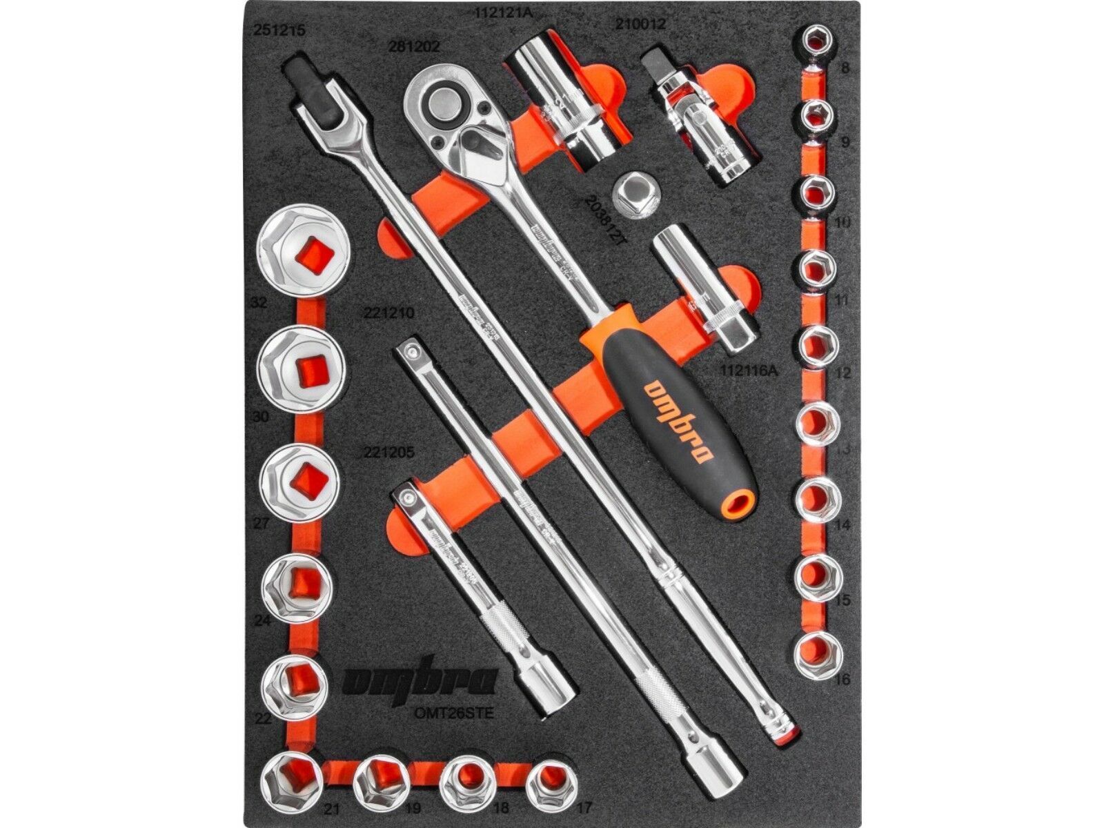 Инструменты, представленные в наборе, относятся к системе сборного инструмента с присоединительным квадратом 1/2"DR, которая является основной при проведениислесарно-монтажных работ по обслуживанию автомобильной техники.