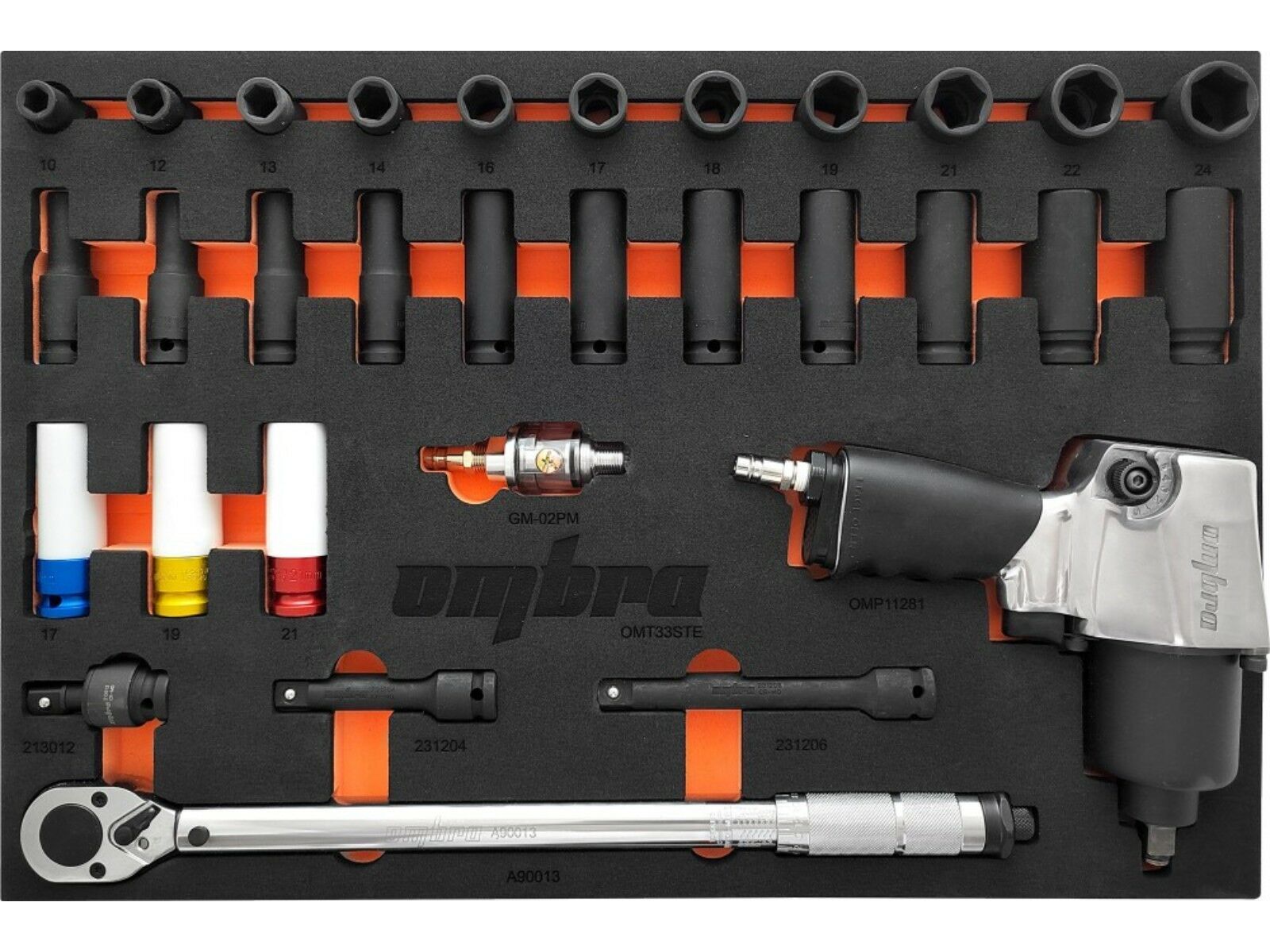 OMP11281 Гайковерт пневматический ударный 1/2"DR, 8000 об/мин., 815 Нм 112410 Головка торцевая ударная 1/2"DR, 10 мм 112412 Головка торцевая ударная 1/2"DR, 12 мм 112413 Головка торцевая ударная 1/2"DR, 13 мм 112414 Головка торцевая ударная 1/2"DR, 14 мм 112416 Головка торцевая ударная 1/2"DR, 16 мм 112417 Головка торцевая ударная 1/2"DR, 17 мм 112418 Головка торцевая ударная 1/2"DR, 18 мм 112419 Головка торцевая ударная 1/2"DR, 19 мм 112421 Головка торцевая ударная 1/2"DR, 21 мм 112422 Головка торцевая ударная 1/2"DR, 22 мм 112421 Головка торцевая ударная 1/2"DR, 24 мм 112510 Головка торцевая ударная глубокая 1/2"DR, 10 мм 112512 Головка торцевая ударная глубокая 1/2"DR, 12 мм 112513 Головка торцевая ударная глубокая 1/2"DR, 13 мм 112514 Головка торцевая ударная глубокая 1/2"DR, 14 мм 112516 Головка торцевая ударная глубокая 1/2"DR, 16 мм 112517 Головка торцевая ударная глубокая 1/2"DR, 17 мм 112518 Головка торцевая ударная глубокая 1/2"DR, 18 мм 112519 Головка торцевая ударная глубокая 1/2"DR,19 мм 112521 Головка торцевая ударная глубокая 1/2"DR, 21 мм 112522 Головка торцевая ударная глубокая 1/2"DR, 22 мм 112524 Головка торцевая ударная глубокая 1/2"DR, 24 мм 912503 Набор головок торцевых глубоких для ударного инструмента 1/2"DR, для лекгосплавных колесных дисков, 17,19,21 мм, 3 предмета 231204 Удлинитель для ударного инструмента 1/2"DR, 100 мм 231206 Удлинитель для ударного инструмента 1/2"DR, 150 мм 213012 Шарнир карданный для ударного инструмента 1/2"DR A90013 Ключ динамометрический 1/2"DR, 42-210 Нм JA-7253 Линейное смазочное устройство "лубрикатор" для пневматического инструмента 1/4" GM-02PM Штуцер БРС европейского типа с наружной резьбовой частью BSPT 1/4" - 2 шт. OMT29ET Ложемент EVA для набора инструмента 29 предметов, 280*375*35 мм
