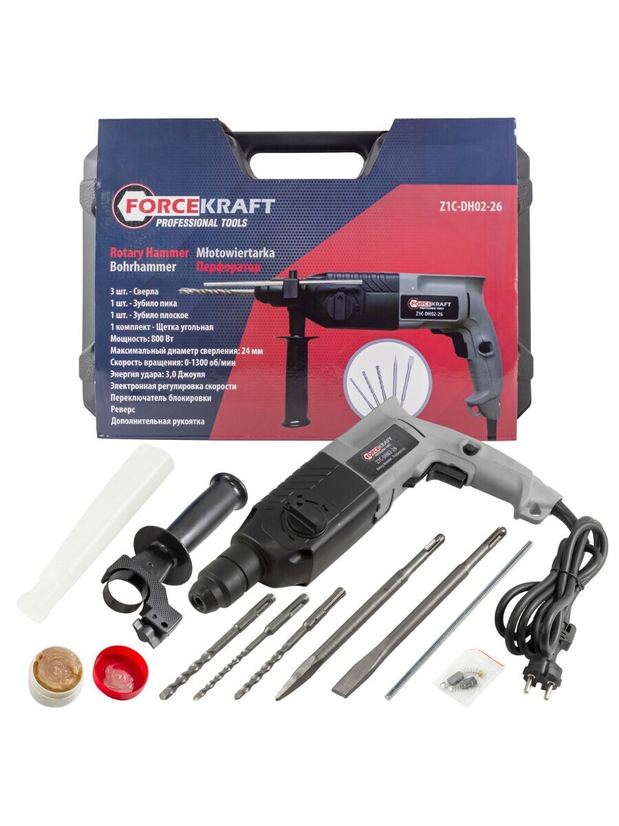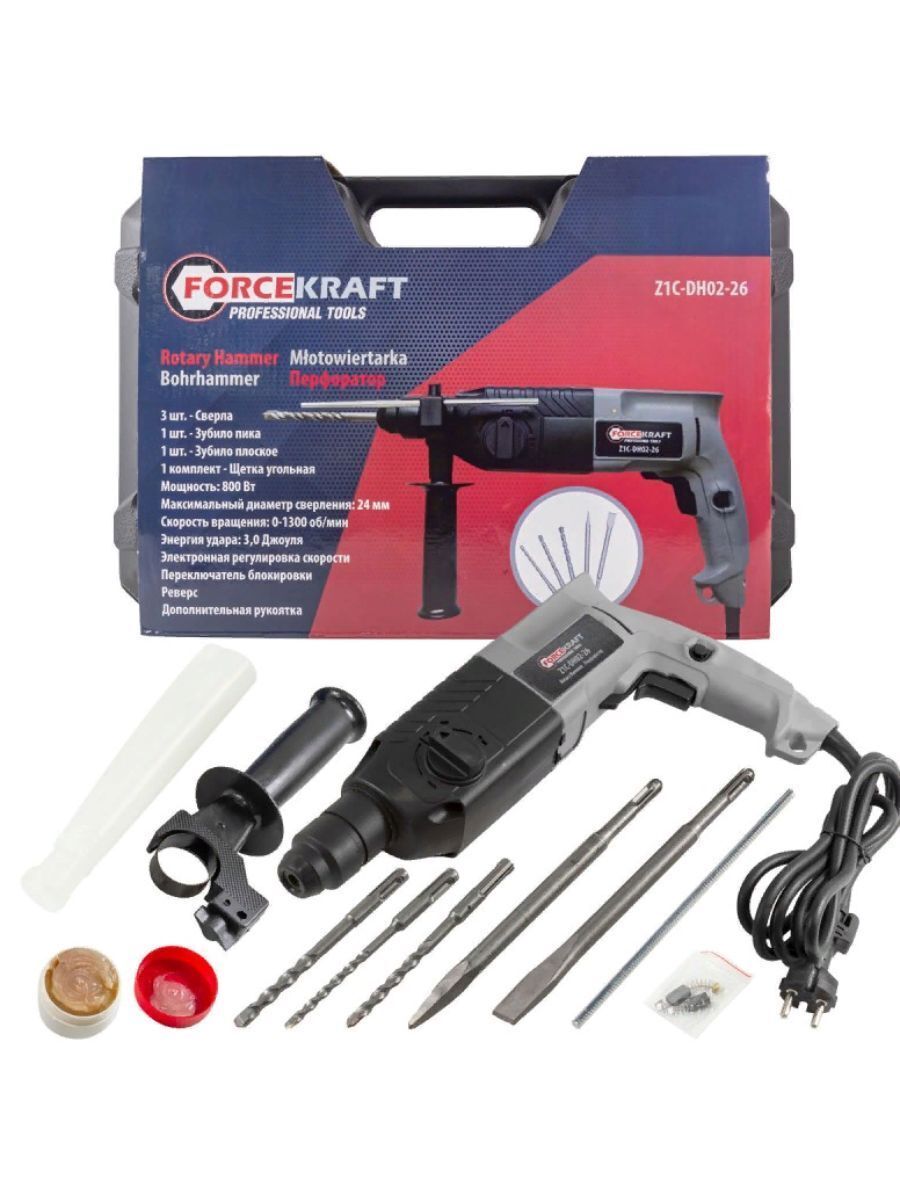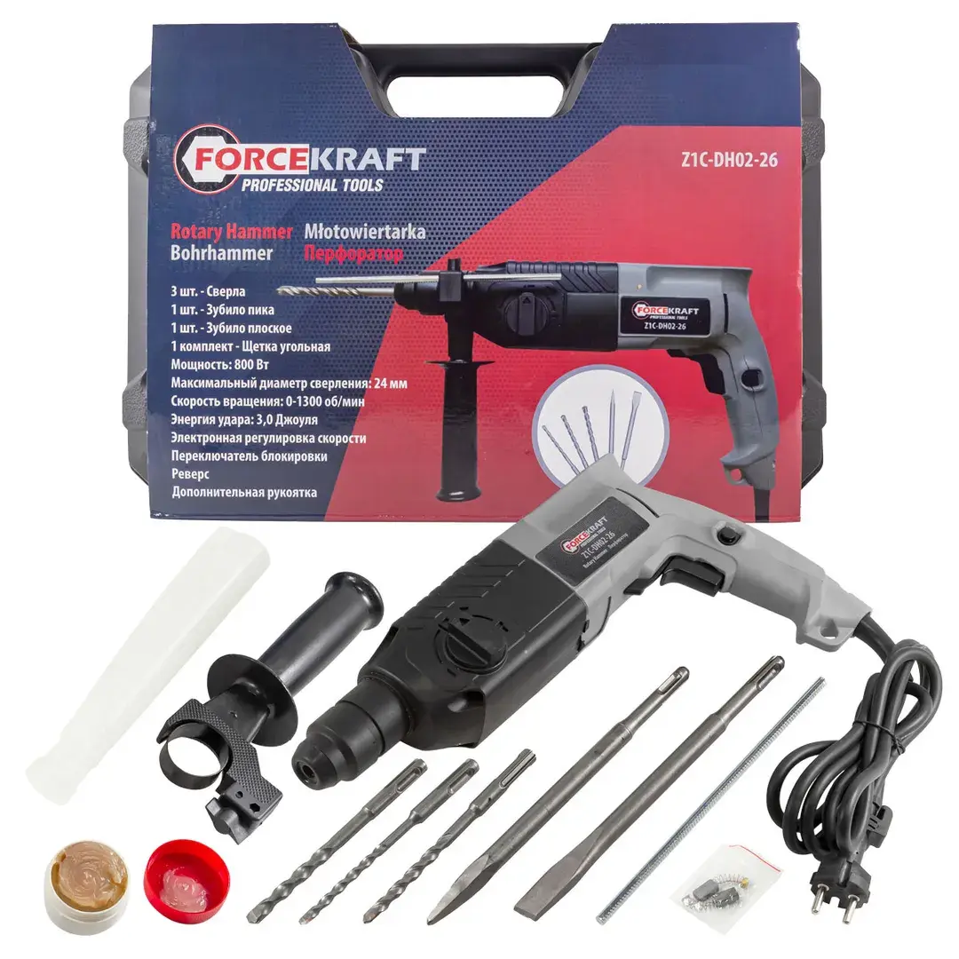 Перфоратор электрический пригодится в арсенале мастера как инструмент, который предназначен для проведения строительных, монтажных и ремонтных работ. Работает с деревом, бетоном, камнем, кирпичом. Широкая комплектация позволяет использовать электроперфоратор сразу, нет необходимости искать расходные материалы. Реверс служит для легкого выкручивания сверла из материала. Перфоратор имеет резиновый кабель питания, который стоек к механической нагрузке (ударам, перегибам, порезам). Технические характеристики: Мощность 800Вт; Напряжение 220В ~50-60Гц; Скорость вращения при холостом ходе 0-1300 об/мин; Энергия удара 2,8Дж; Максимальный диаметр сверления 24мм; В комплект также входят: Сверла 5х140мм, 7х140мм, 8х140мм; Зубило плосткое 20х220мм; Зубило пика 220мм; Угольная щётка.