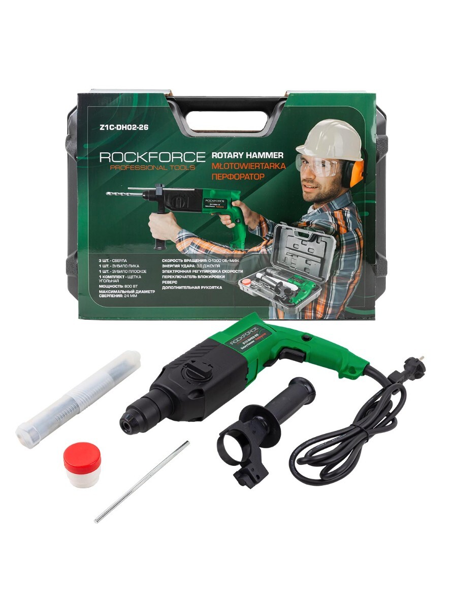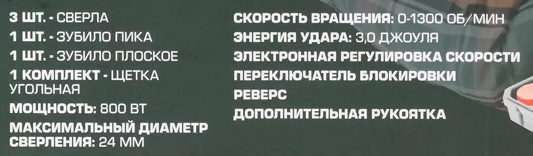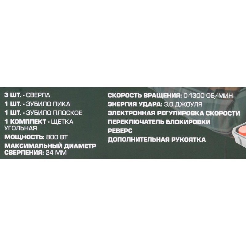 Перфоратор электрический пригодится в арсенале мастера как инструмент, который предназначен для проведения строительных, монтажных и ремонтных работ. Работает с деревом, бетоном, камнем, кирпичом. Широкая комплектация позволяет использовать электроперфоратор сразу, нет необходимости искать расходные материалы. Реверс служит для легкого выкручивания сверла из материала. Перфоратор имеет резиновый кабель питания, который стоек к механической нагрузке (ударам, перегибам, порезам). Технические характеристики: Мощность 800Вт; Напряжение 220В ~50-60Гц; Скорость вращения при холостом ходе 0-1300 об/мин; Энергия удара 2,8Дж; Максимальный диаметр сверления 24мм; В комплект также входят: Сверла 5х140мм, 7х140мм, 8х140мм; Зубило плосткое 20х220мм; Зубило пика 220мм; Угольная щётка.