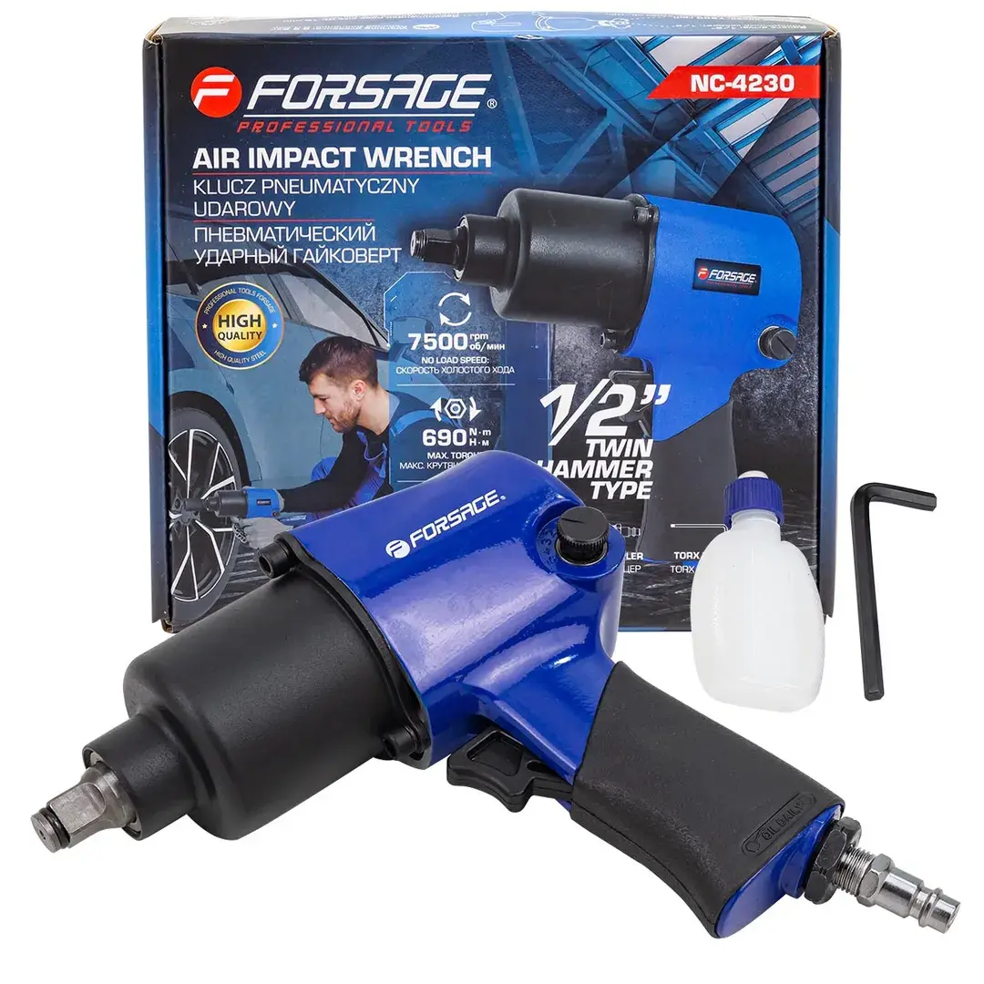 Пневмогайковерт ударный ''Twin Hammer''с реверсом и регулировкой усилия 1/2''(690Hм, 7500 об/мин,6.3bar,вес 2.9кг) Forsage F-NC-4230