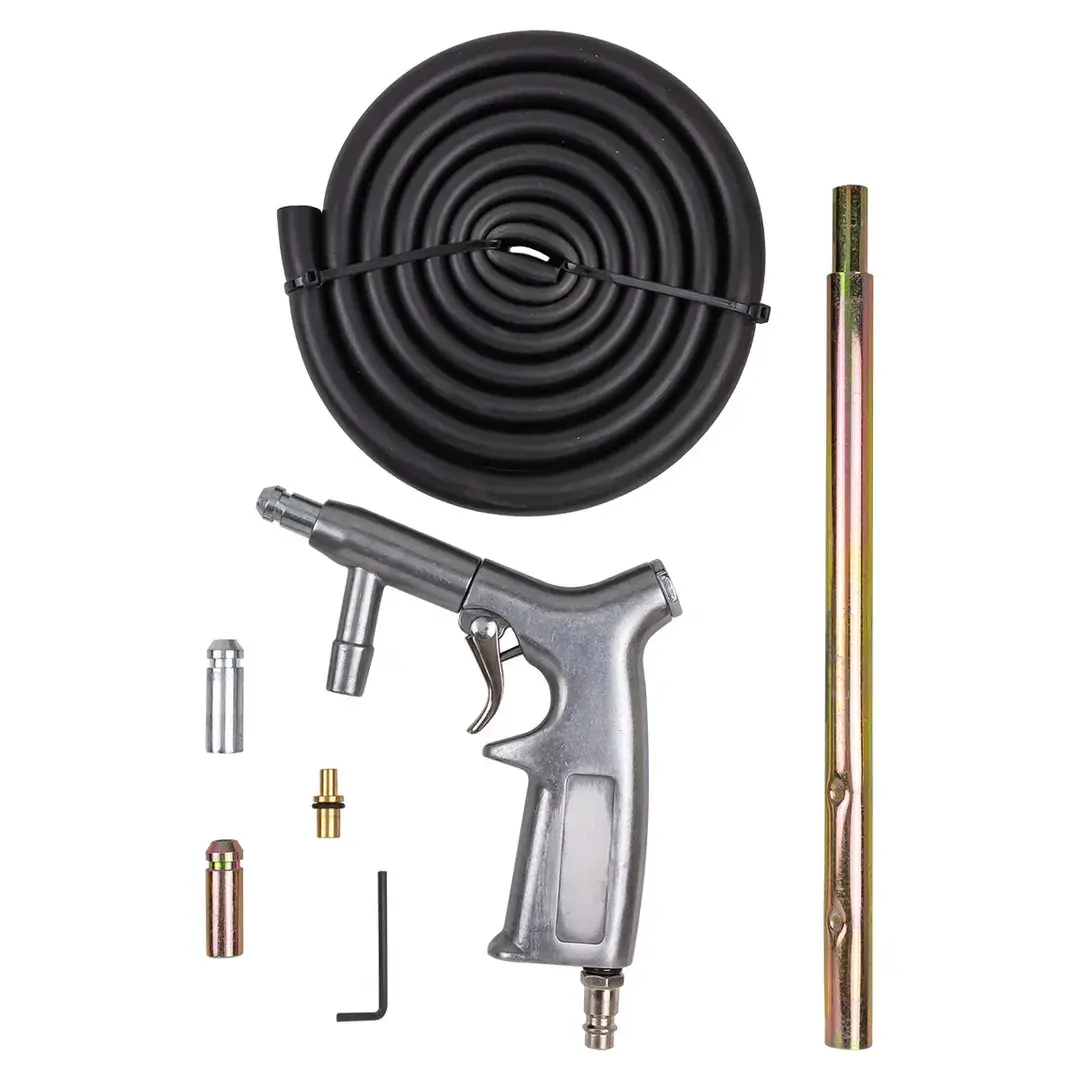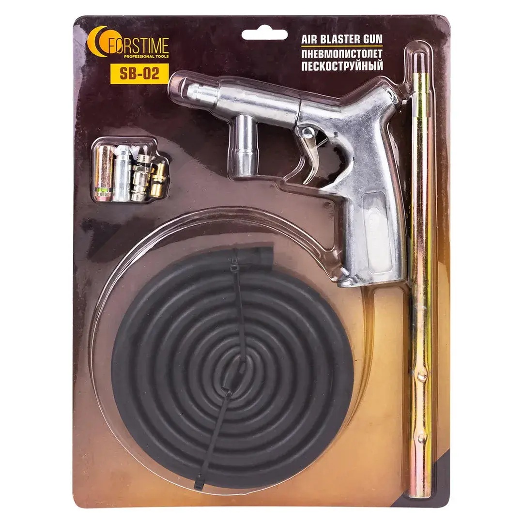Пистолет пескоструйный предназначен для слесарных работ, таких как обработка металлических поверхностей изделий от коррозии, лака, краски и других покрытий. Обработка металлических поверхностей потоком частиц песка в струе сжатого воздуха позволяет эффективно удалять с них ржавчину, окалину, лаковые покрытия, застарелую краску и отвердевшую масляно-пылевую пленку. Важнейшим элементом инжекторной технологии струйной очистки изделий и деталей является пескоструйный пистолет со сменными соплами. В отличие от моделей с собственным бачком для абразива, которые пригодны только для локальной обработки конструкций, предлагаемое изделие относится к пистолетам пескоструйным шлангового типа. Данное устройство имеет 2 входа для присоединения шлангов подачи сжатого воздуха и абразива и держатель керамического или металлическое сопла. Учитывая, что изменение формы и диаметра выходного отверстия струйного инжектора позволяет вести обработку объектов в различных режимах, пистолет пескоструйный (3 сменных сопла) имеет преимущ
