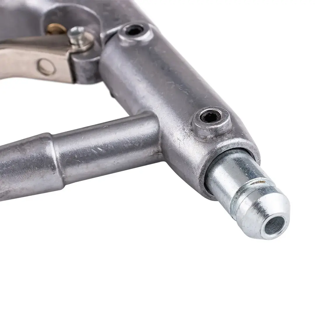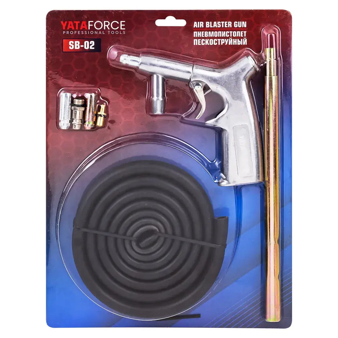 Пистолет пескоструйный предназначен для слесарных работ, таких как обработка металлических поверхностей изделий от коррозии, лака, краски и других покрытий. Обработка металлических поверхностей потоком частиц песка в струе сжатого воздуха позволяет эффективно удалять с них ржавчину, окалину, лаковые покрытия, застарелую краску и отвердевшую масляно-пылевую пленку. Важнейшим элементом инжекторной технологии струйной очистки изделий и деталей является пескоструйный пистолет со сменными соплами. В отличие от моделей с собственным бачком для абразива, которые пригодны только для локальной обработки конструкций, предлагаемое изделие относится к пистолетам пескоструйным шлангового типа. Данное устройство имеет 2 входа для присоединения шлангов подачи сжатого воздуха и абразива и держатель керамического или металлическое сопла. Учитывая, что изменение формы и диаметра выходного отверстия струйного инжектора позволяет вести обработку объектов в различных режимах, пистолет пескоструйный (3 сменных сопла) имеет преимущ