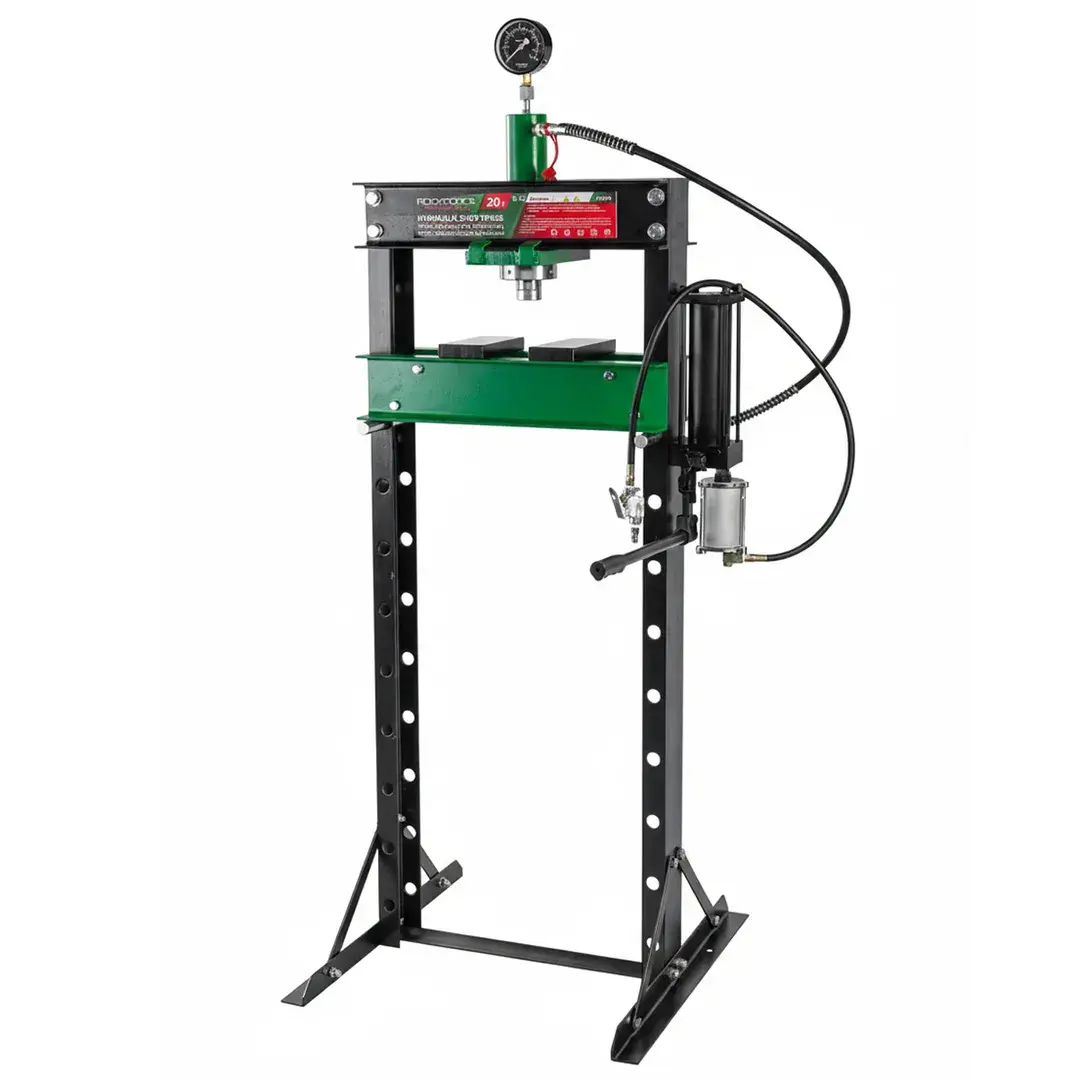Пресс гидравлический напольный - это мощное и надежное оборудование, предназначенное для выполнения различных видов работ, таких как сжатие, выгибание, прессование и другие гидравлические операции. Этот пресс идеально подходит для использования в автомастерских, промышленных предприятиях и других местах, где требуется мощное оборудование для работы с тяжелыми деталями и материалами.¶Напольный гидравлический пресс приводится в действие при помощи рукояти либо пневматически, т.е. насос пресса подключается к внешнему компрессору. Устойчивое положение модели обеспечивается благодаря поперечным пластинам основания. Отверстия стоек позволяют с легкостью менять высоту стола. Пресс также оснащён манометром, служащим для контролирования давления.¶Максимальная нагрузка 20т¶Рабочая высота 0-910мм¶Рабочая ширина 530мм¶Ход штока 185мм¶Вес 101кг.