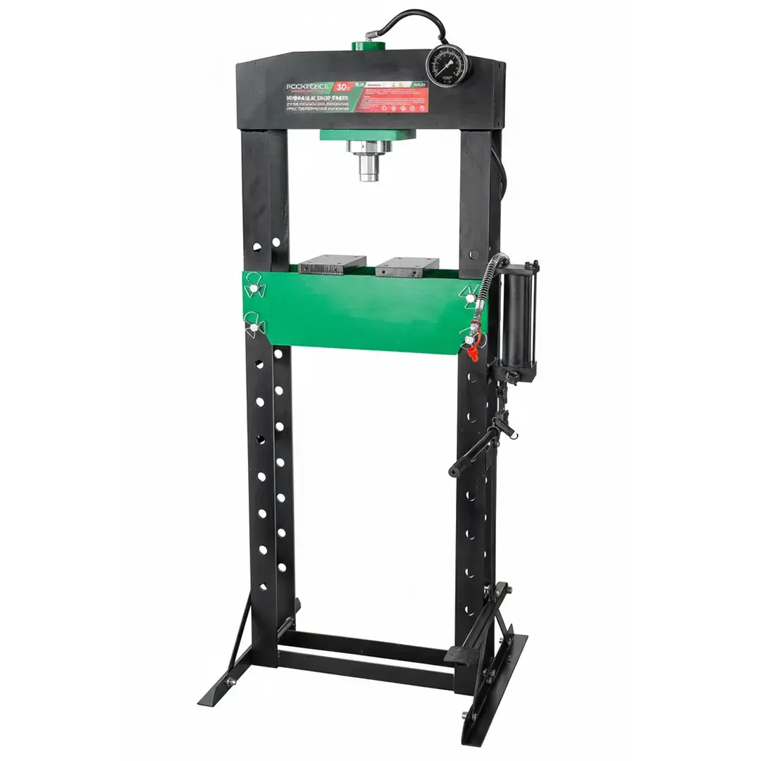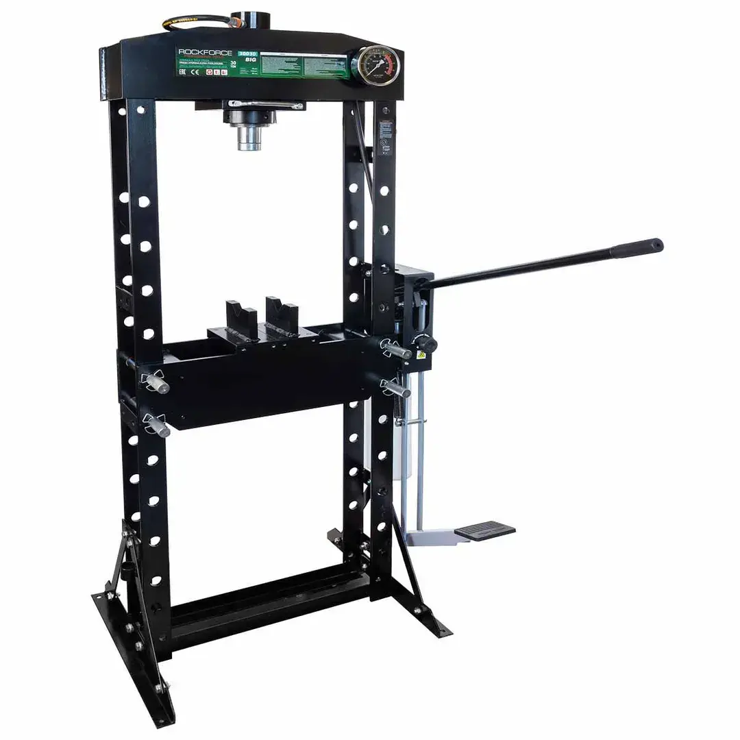 Пресс гидравлический напольный — это мощное и надежное профессиональное оборудование грузоподъемностью 30 тонн, предназначенное для выполнения различных видов работ, включая запрессовку и выпрессовку подшипников, шкивов, сайлент-блоков, а также операции сжатия, выгибания и прессования. Этот пресс идеально подходит для использования в автомастерских, промышленных предприятиях и других местах, где требуется мощное оборудование для работы с тяжелыми деталями и материалами. Напольный гидравлический пресс приводится в действие при помощи рукояти либо пневматически - насос пресса может подключаться к внешнему компрессору. Устойчивое положение модели обеспечивается благодаря прочной стальной раме и поперечным элементам основания. Отверстия стоек позволяют с легкостью менять высоту стола, обеспечивая рабочий диапазон высоты от 140 мм до 1020 мм при ширине между стойками 535 мм, что позволяет работать с деталями различных габаритов. Ход штока составляет 162 мм, обеспечивая достаточную амплитуду движения для выполнения