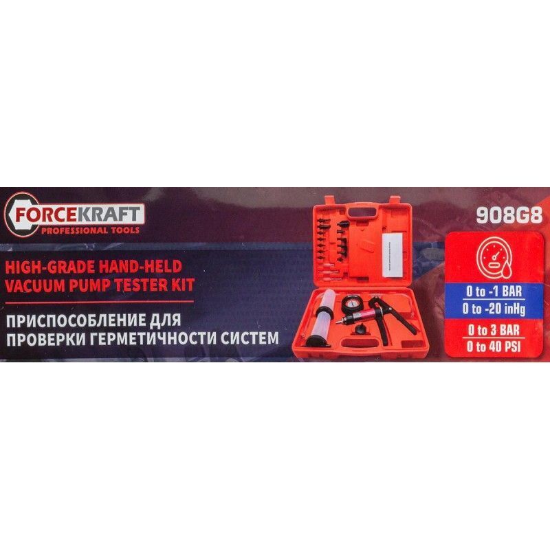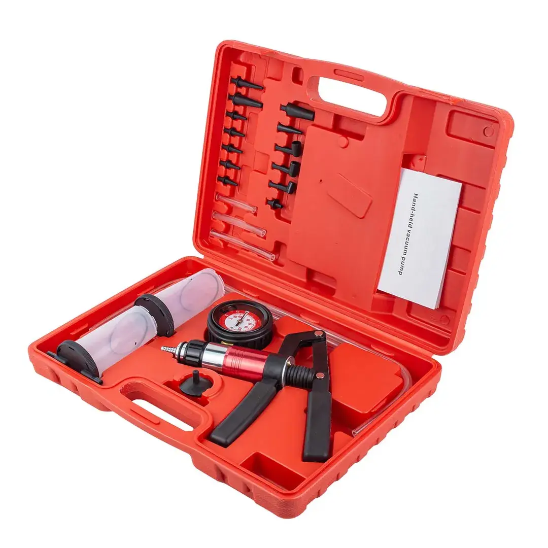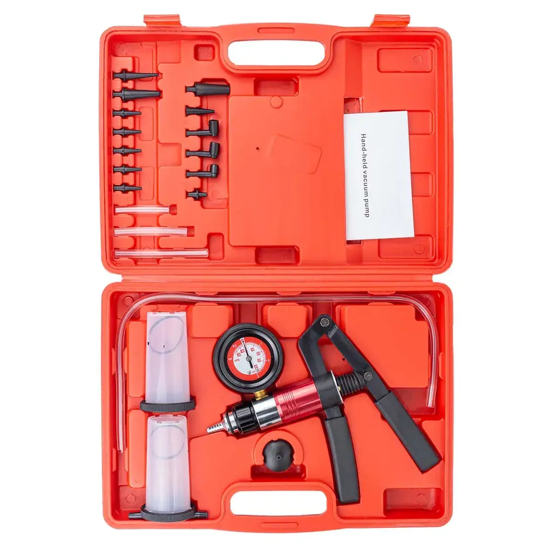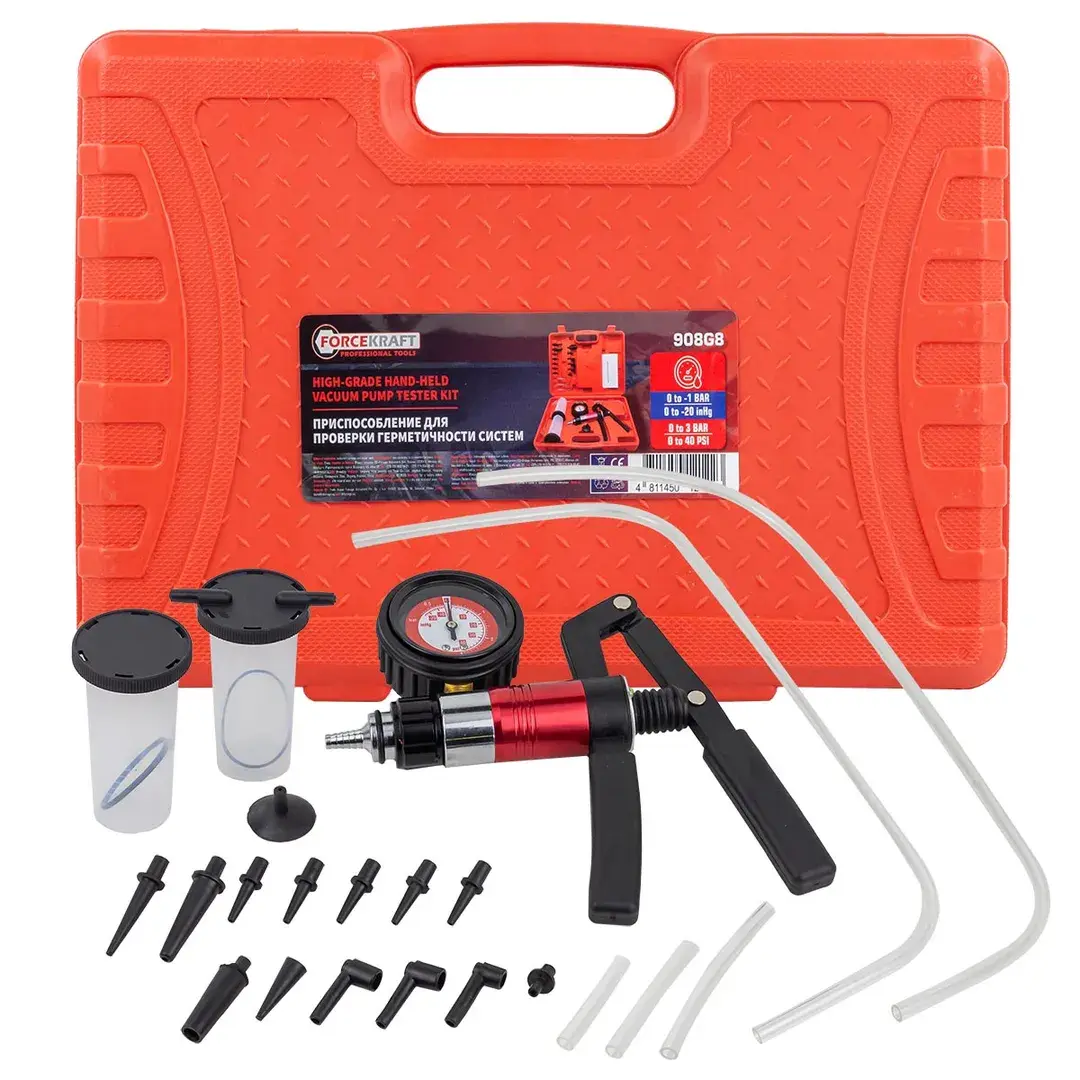 Приспособление (насос вакуумный) для проверки герметичности систем, набор в пластиковом кейсе Предназначен для проведения обследования на предмет выявления проблем с давлением и герметичностью. Универсальный вакуумный тестер является многофункциональным прибором и может использоваться в различных системах автомобиля. В комплект входят разные виды соединений, что позволяет проводить диагностику на автомобилях большинства марок. В комплекте предусмотрены клапаны для прокачки тормозной системы. Предоставляет возможности тестировать 2 режима давления. Вакуумметр также может применяться в качестве измерителя разрежения во впускном коллекторе двигателя и различных точках вакуумных систем. Комплектация: Пистолет для измерения давления 1 шт. Прозрачная трубка 5 шт. Прозрачная емкость (120 мл. ) - 2 шт. Набор насадок - 13 шт.