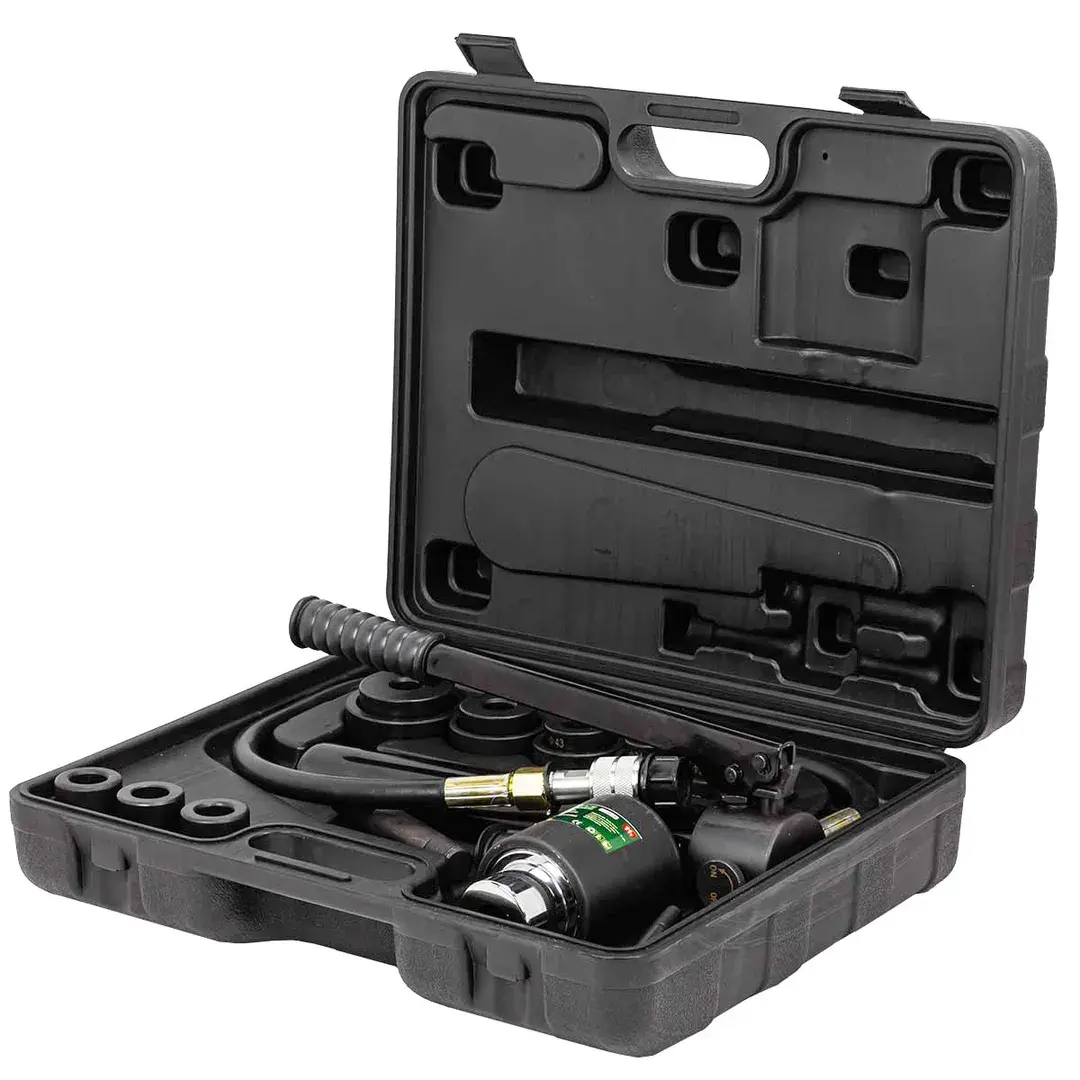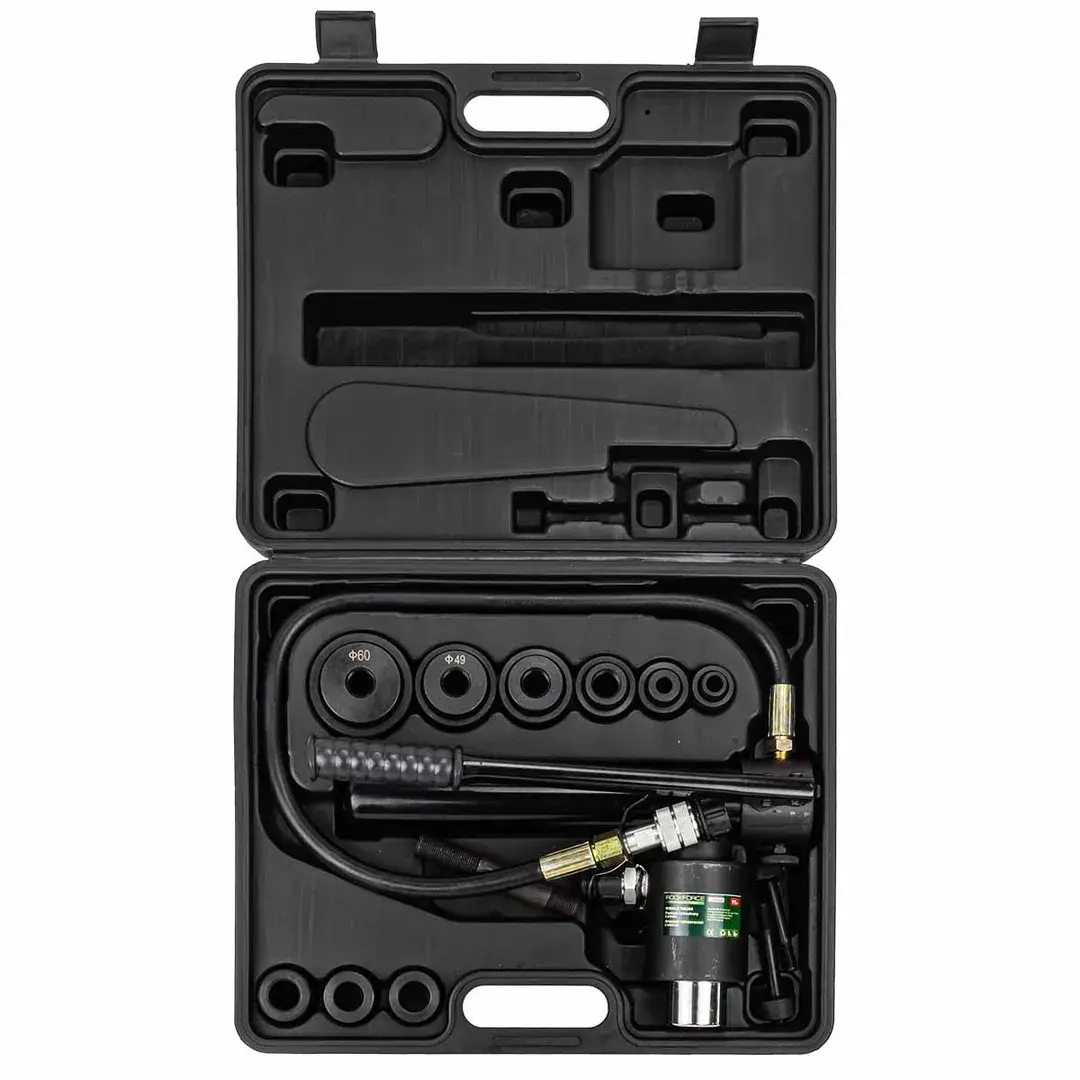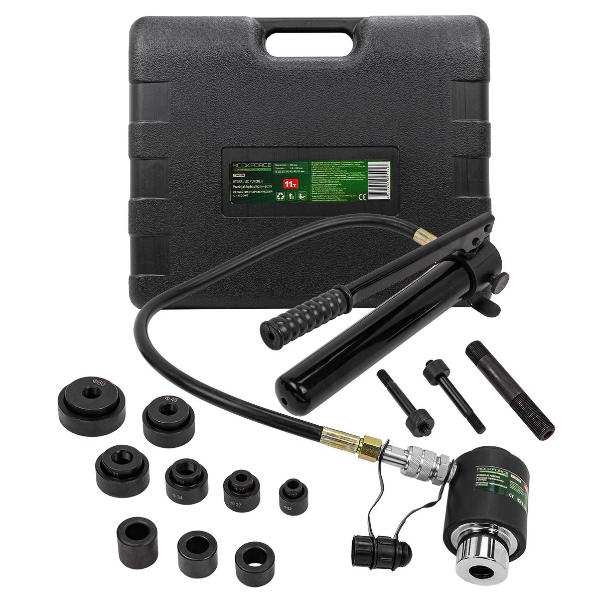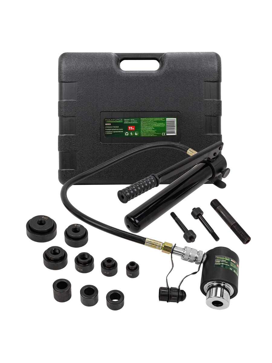 Пробойник гидравлический с насосом 11т (?22, 27.5, 34, 43, 49, 60мм, сталь нерж.-1.6мм, медь/алюм.-3.2мм,ход штока-20мм),в кейсе RockForce RF-71002D