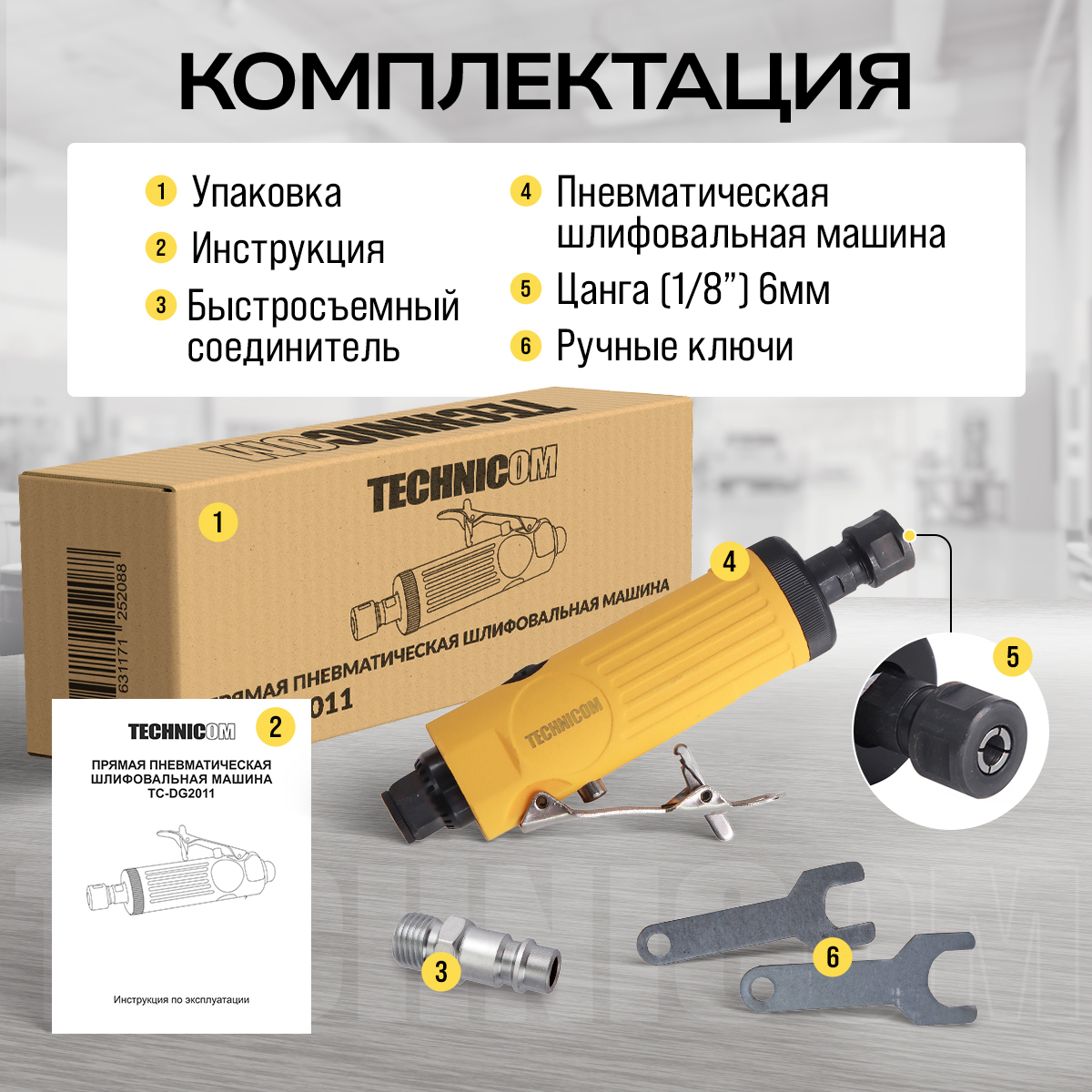 Прямая пневматическая шлифовальная машина Technicom TC-DG2011, цанга 3мм, 6,3 Бар, 113 л/мин, 22000 об/мин