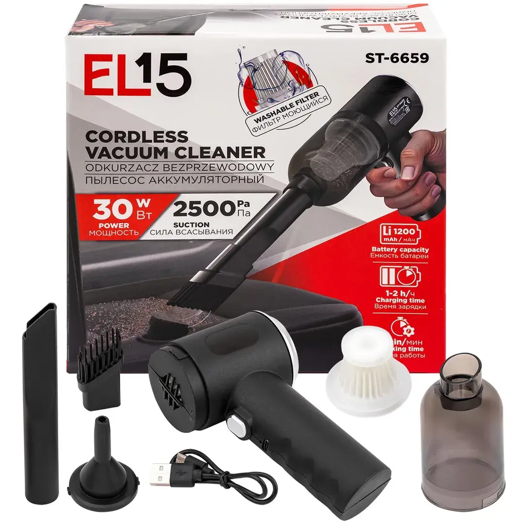 Пылесос портативный аккумуляторный (3,7В,1200мА/ч) 30Вт, контейнер 0,45л EL15 ST-6659