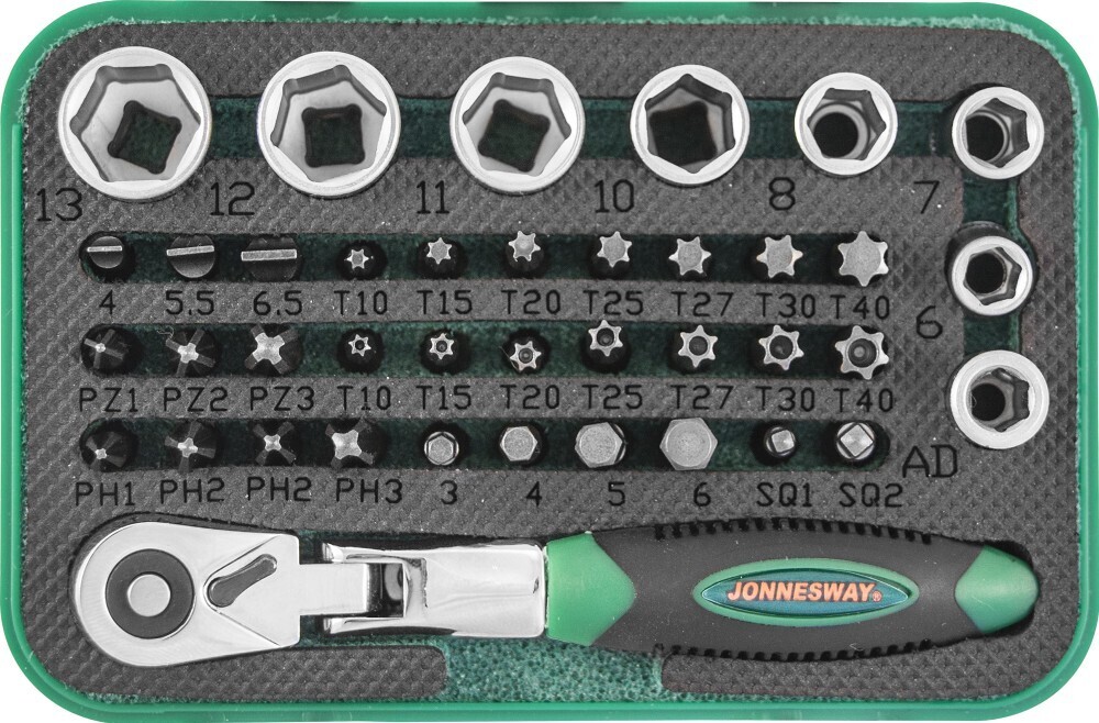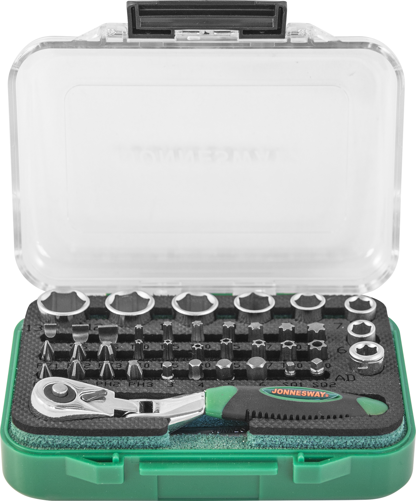 Содержание: - Трещоточная рукоятка RD02; - Головки торцевые 1/4""DR, 7 шт: 6, 7, 8, 10, 11, 12, 13 мм.; - Держатель для бит 1/4"SDRх1/4"НDR; - Удлинитель 1/4"DR; - Вставки-биты 1/4"HDR, 30 предметов: Phillips® (крест) 4 шт: РН1х1 шт., РН2х2 шт., Р 3х1 шт.; НЕХ (шестигранник) 4 шт: Н3 мм., Н4 мм., Н5 мм., Н6 мм.; SQUARE (квадрат), 2 шт: SQ1 мм., SQ2 мм.; Pozidriv®, 3 шт: PZ1, PZ2, PZ3; TORX®, 7 шт: Т10, Т15, Т20, Т25, Т27, Т30, Т40; Т-TORX®, 7 шт: Т10, Т15, Т20, Т25, Т27, Т30, Т40; SL (шлиц), 3 шт: SL4, SL5.5, SL6.5 мм.; - Пластиковый кейс.