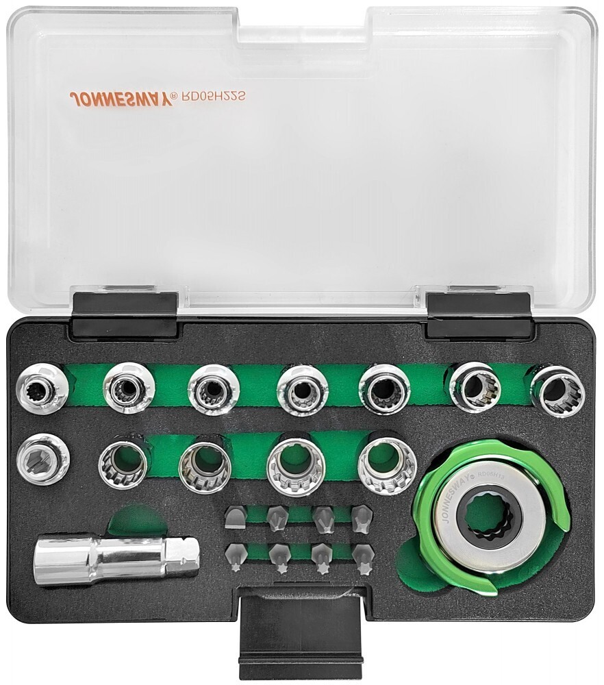 Набор Jonnesway RD05H22S в кейсе включающий в себя: торцевые головки 1/4 дюйма Spline M4-M13 (12-ти гранная звездочка), дисковый трещоточный механизм и биты. Используется для монтажа/демонтажа различного крепежа, имеющего профиль SPLINE (12). Трещоточный механизм дискового ключа позволяет работать им, не отрываясь от детали. Биты позволяют работать с головками самых распространенных размеров.