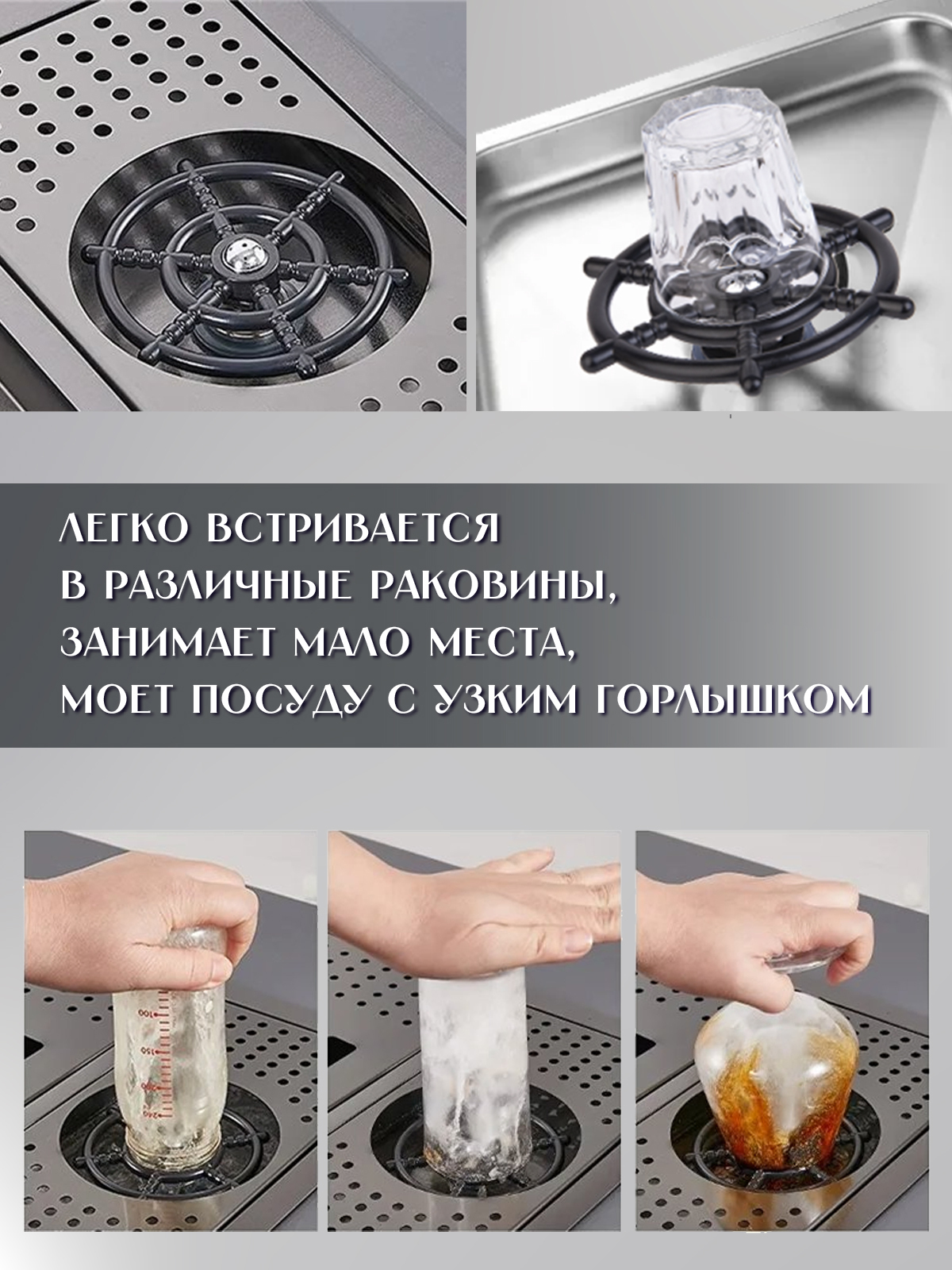 Предназначен для ополаскивания кружек, стаканов, бокалов и т.д. Механизм устроен таким образом, что под сильным напором холодной воды посуда не только тщательно промывается, но быстро охлаждается для дальнейшего использования